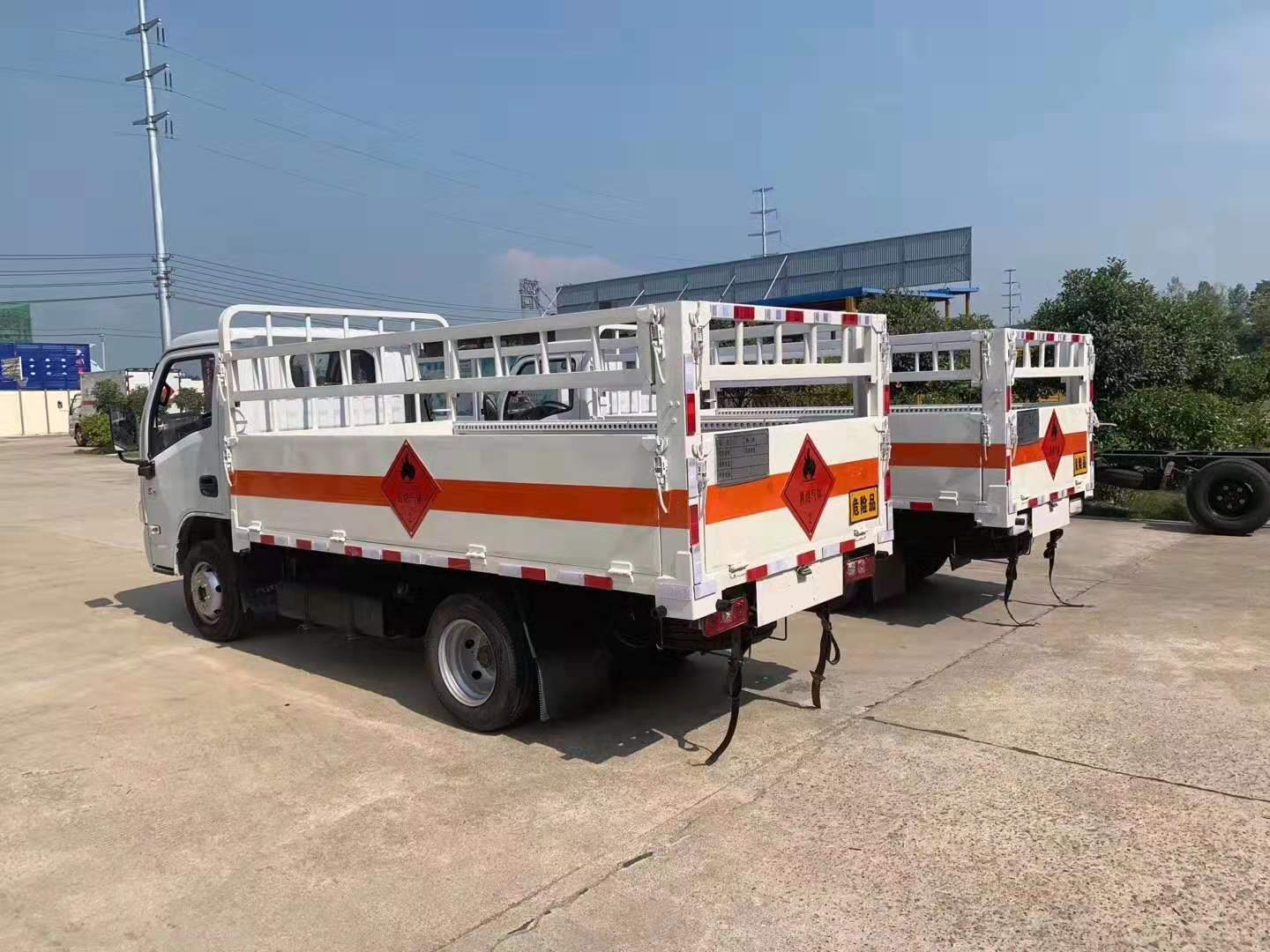 2)躍進國六氣瓶運輸車廂體配置:貨廂尺寸為3300X1650X600(mm)、邊板對折四開門、外板采用1.2MM厚冷軋板,內襯為矩形管骨架牢靠穩定,底板為3mm厚花紋板,有靜電帶、滅火器、防火罩。整車國標反光標示及警告標志;