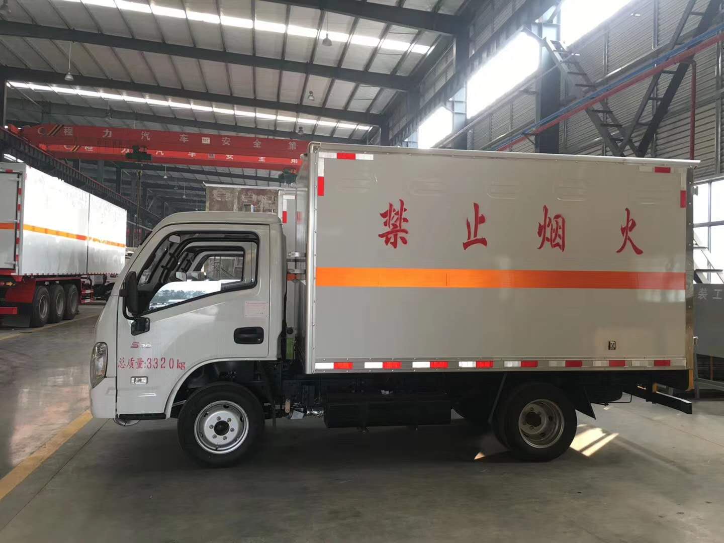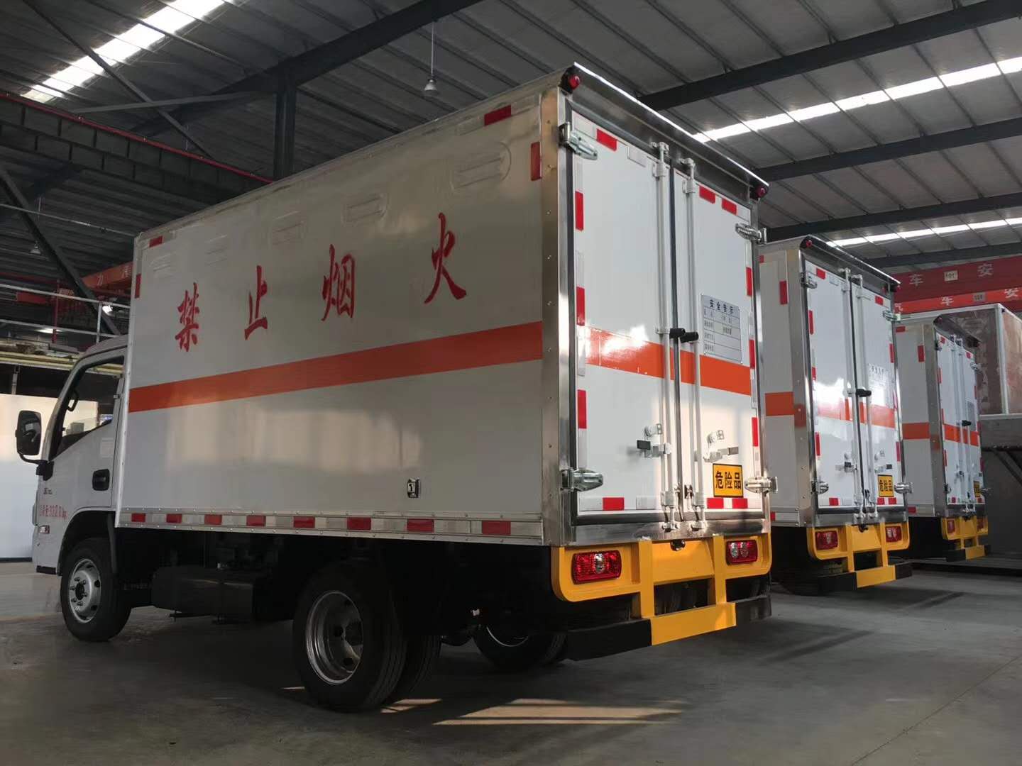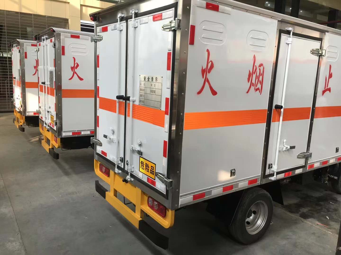 上裝配置:廂體材質(zhì)為外飾冷軋鋼板、內(nèi)飾鋁合金板、中間填充隔熱阻燃材料,選裝側(cè)門和隔倉,廂體兩側(cè)上方設(shè)有防雨功能自然通風(fēng)窗口,底部鋪有阻燃導(dǎo)靜電膠板,廂體側(cè)面裝有固定拉環(huán),與捆綁帶使用捆綁貨物以避免移動(dòng)。在車廂內(nèi)頂部安裝感煙報(bào)警器,在門器框上方安裝有防盜報(bào)警器,廂體外側(cè)安裝示廓燈及滅火器支架,配置兩個(gè)滅火器,并有“嚴(yán)禁煙火”和“爆”等字樣,廂體周邊貼反光標(biāo)識(shí)。后門貼有安全告示,危險(xiǎn)品標(biāo)牌。車輛尾部副梁安裝兩條拖地導(dǎo)靜電帶,駕駛室頂部裝有安全三角燈。廂體顏色可定制:黃、白、灰色等。
