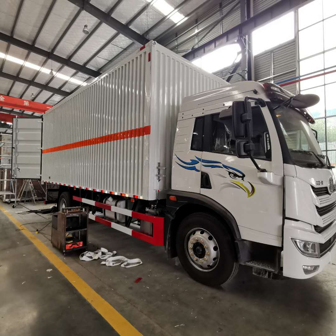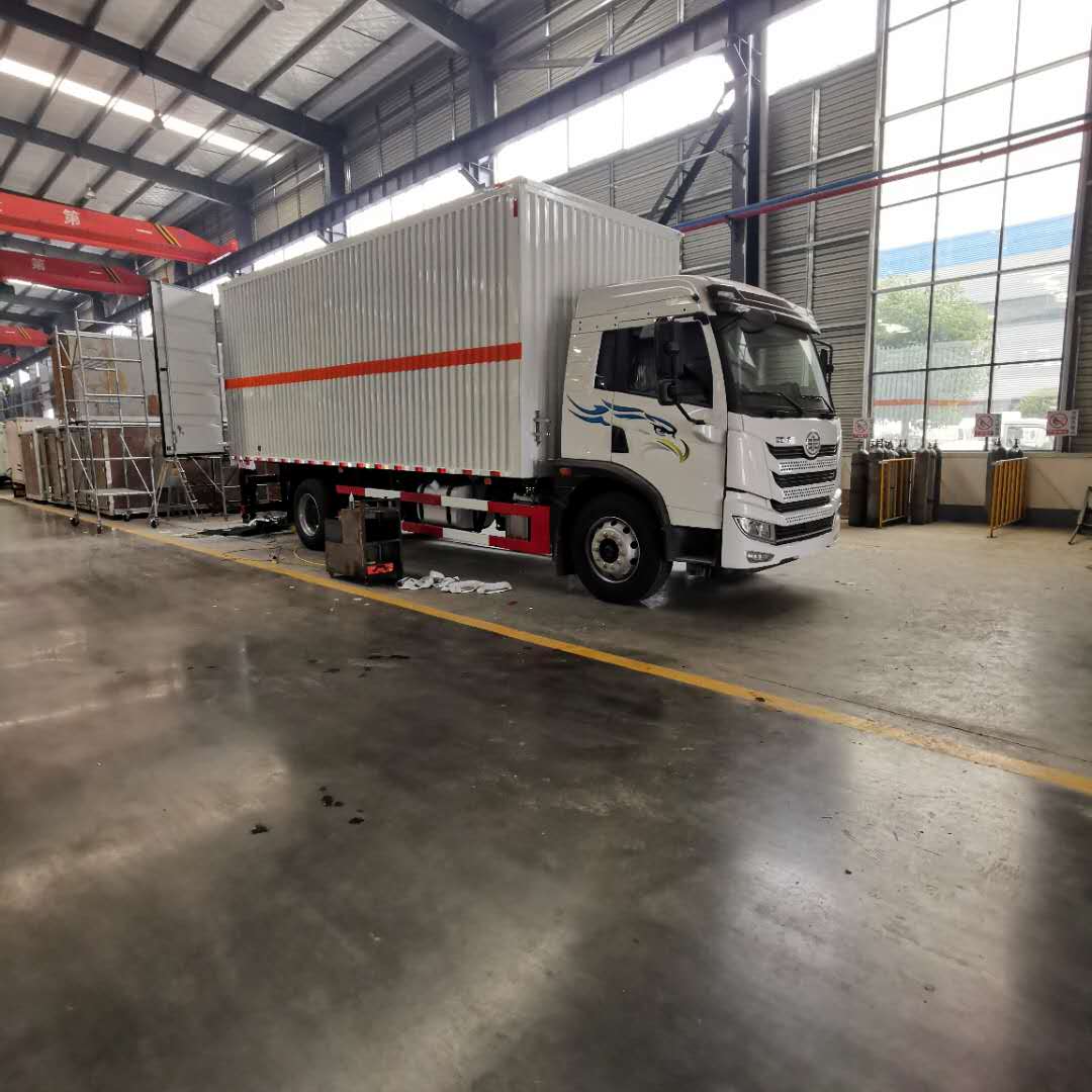 解放龍V翼展式危險(xiǎn)品車嚴(yán)格按照公告尺寸制作,外板采用1mm厚冷軋板有一次性成型的百葉窗,內(nèi)飾為導(dǎo)電性能良好的鋁板有透氣孔,內(nèi)襯為矩形管骨架牢靠穩(wěn)定,內(nèi)部填充為透氣防潮阻燃的擠塑板,四種材料經(jīng)現(xiàn)代工藝復(fù)合而成,廂體外部上下鋁合金型材包邊,底板和車廂前下部鋪橡膠皮,后門雙開(kāi),右側(cè)三個(gè)雙開(kāi)門,內(nèi)部有固定貨物的臥環(huán),車輛外部有靜電帶、滅火器、防火罩,車廂內(nèi)安裝煙霧報(bào)警器和門防盜報(bào)警器,嚴(yán)格按照國(guó)家危險(xiǎn)品相關(guān)法規(guī)張貼。