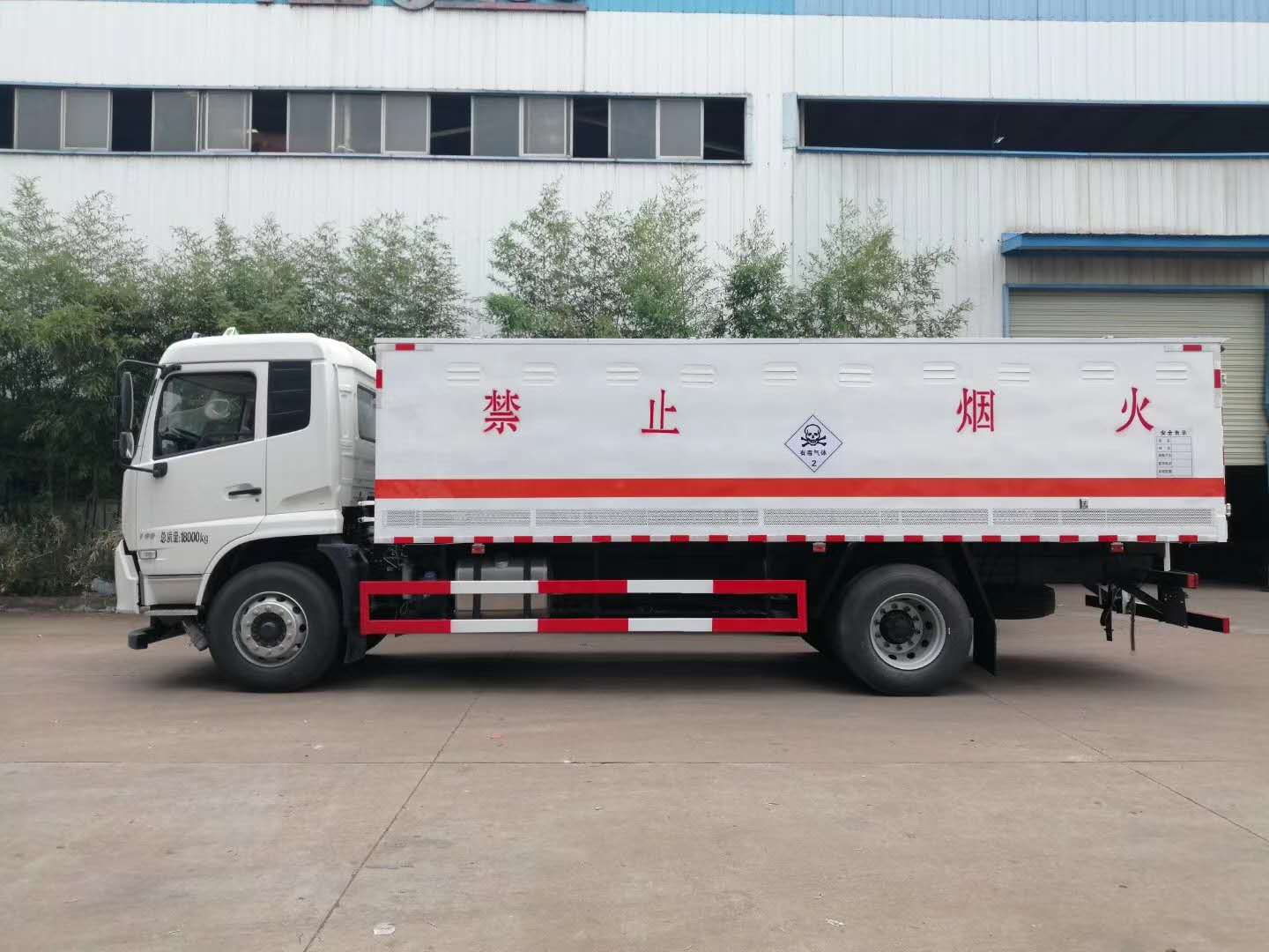 東風天錦5米軸距毒性氣體廂式運輸車(2類3項),底盤配置:東風天錦平頭帶臥柴油毒性氣體廂式運輸車主要配置,該車采用東風天錦平頭白色帶臥毒性氣體廂式運輸車,軸距5000MM,康明斯發動機190馬力國五排放標準,帶方向助力,295真空胎,帶前盤式剎車,ABS,限速裝置,安裝防飛濺檔泥板,三角墊木,反光背心,帶空調,帶行車記錄儀。帶空氣懸架,防爆胎裝置,制動襯片預警,安全帶未系提醒。外形尺寸:9000*2510*2870,廂體尺寸:6600*2400*1200,廂體采用外冷板廂內框架采用槽鋼連接方管焊牢加固,廂體側板上面帶一次沖壓成形百葉窗側板下面帶網眼透氣亂,底板上面鋪防靜電膠皮,后門安裝防盜報警器,帶危險品三角燈防火罩。上戶噸位:9.93噸。