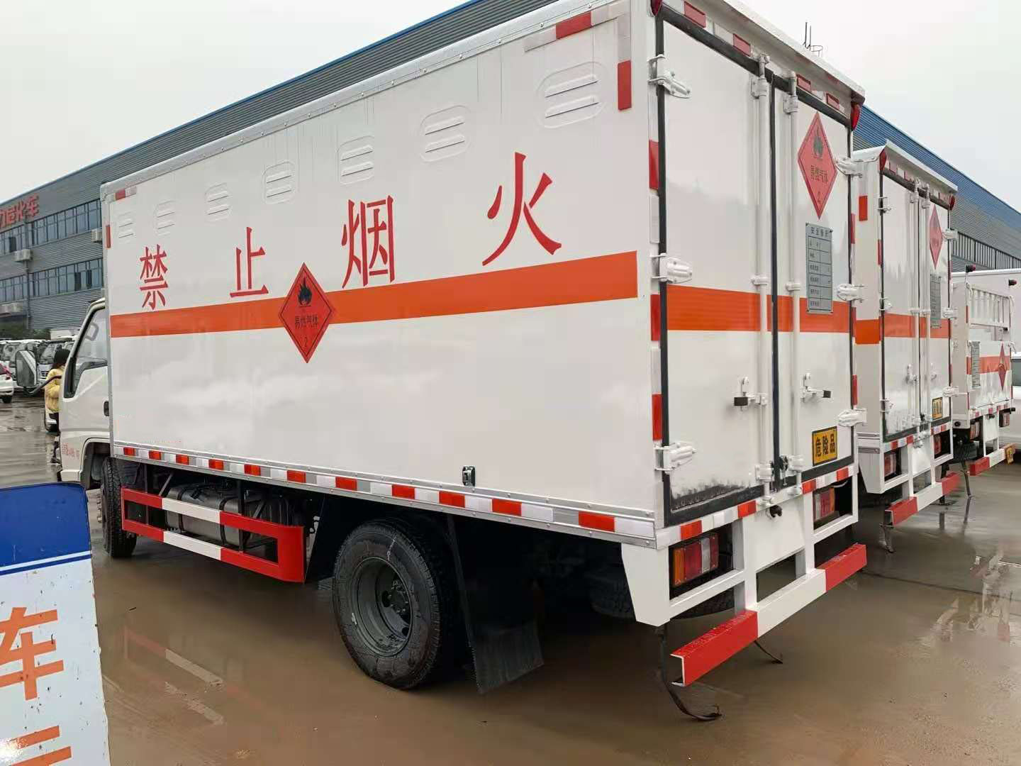 江鈴國五危險(xiǎn)品車:整車尺寸:5995×2040×2880(mm)貨箱尺寸:4130×1870×1750(mm)。底盤配置:五十鈴115馬力國五發(fā)動(dòng)機(jī),帶方向助力,5檔變速箱,排氣管前置,前盤后鼓,ABS。箱體采用三明治結(jié)構(gòu),外厚度為1.5毫米厚度武鋼冷軋鋼板,中鋼骨架,內(nèi)為鋁合金平板,中間填充防火阻燃材料,箱體厚度為5公分,箱體外表上方采用模壓成型帶防水通風(fēng)功能百葉窗,內(nèi)部為細(xì)孔式通風(fēng)蓋,固定貨物的臥式拉環(huán)鉚接在鋼骨架上,牢固可靠,箱體自下向上80公分處和底板均采用5毫米厚度絕緣墊皮,防止靜電產(chǎn)生火花,保證安全。箱體頂板安裝高敏度煙霧報(bào)警器和駕駛室報(bào)警系統(tǒng)相連接,防止事故的發(fā)生。門內(nèi)安裝高精度限位裝置和駕駛室內(nèi)部報(bào)警器相連接,杜絕箱門未鎖緊情況。箱體外部箱門打開處安裝防自關(guān)門的限位風(fēng)勾,箱體外觀涂裝醒目黃色油漆,在箱體的左、右、后部粘貼紅色“易燃?xì)怏w”字標(biāo)識(shí)。箱體前部安裝兩個(gè)掛滅火器的掛桶和配備兩只滅火器,后保險(xiǎn)杠處安裝防追尾事故的緩沖固定塊,駕駛室內(nèi)部安裝安全報(bào)警器連接后部箱體,對(duì)箱體內(nèi)部實(shí)施安全監(jiān)控。廂體顏色可選。