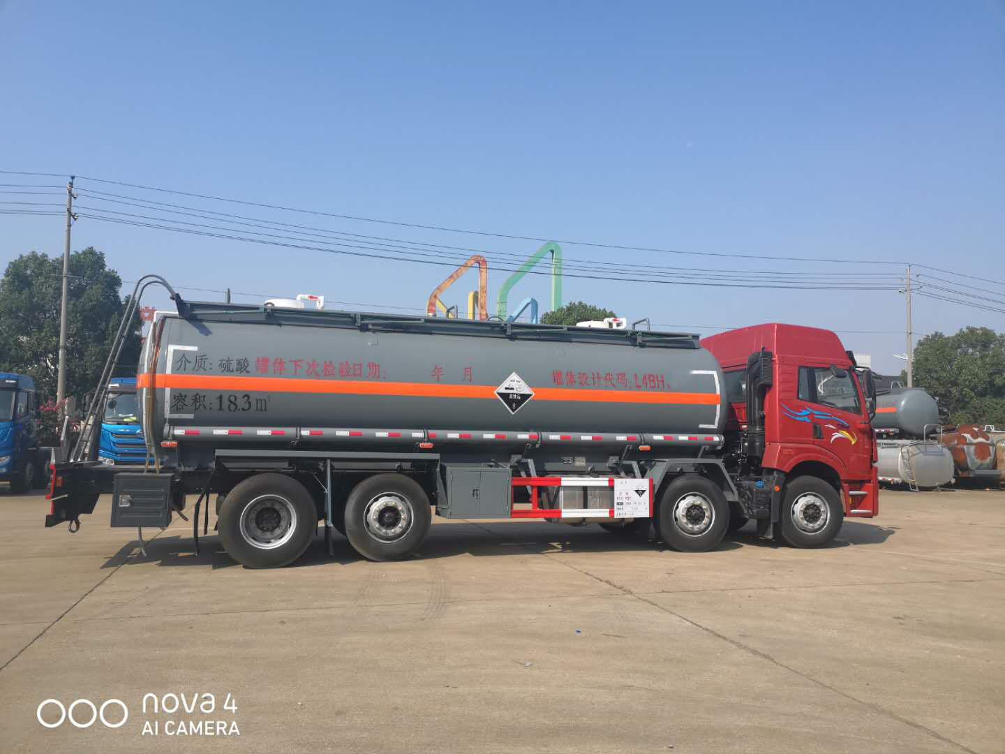 解放前四后六腐蝕品物品運輸車采用解放原廠危貨底盤,悍V2.0平地板高頂全浮駕駛室(四點空氣懸置),錫柴CA6DL1-26E5,陜齒9JS119A,457升級沖焊橋(速比4.875),295/80R22.5-18PR層級,280*80*(8+5),發動機長換油,空調,電動門窗,電動舉升,中控鎖,帶國產EBS,板簧10/10/8+-/2+-,4氣囊,北斗+GPRS行車記錄儀,前下防護,220V電源+巡航系統,高爆壓版,限速89KM/H,400L鋁油箱,真皮通風座椅(腰托、扶手),多功能方向盤,雨眉,前盤后鼓制動器,限速79KM/H,排氣管前置,排氣火花熄滅器,帶靜電拖地帶,前橋及隨動橋帶爆胎應急,帶進口ECAS,電控氣囊懸掛,國產FCW/LDWS。軸距:1900+4160+1350mm。
