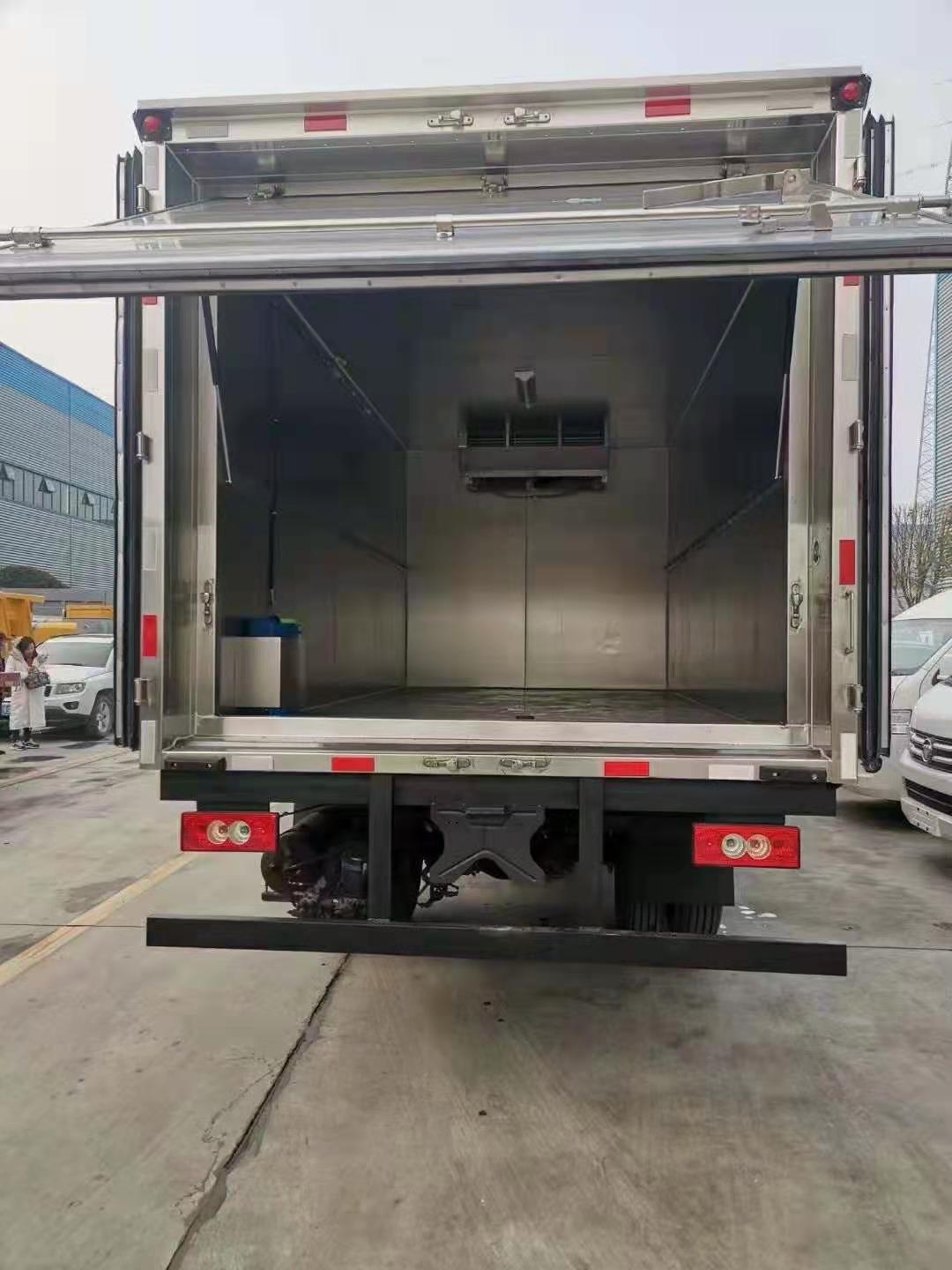 3.廂體內部安裝自動噴霧裝置,可進行自動噴霧消毒,殺菌。配備不銹鋼污水處理箱,4.采用國產-5度制冷機組(安裝在箱體前上部),后雙開門,外玻璃鋼,廂內6個面均不銹鋼板,中間8cm厚保溫層,加裝隔貨條,污水處理箱,后部帶密封門一個,鋁合金型材包邊,不銹鋼門框及鎖件。 箱體里面配自動噴霧消毒、紫外線殺菌消毒。