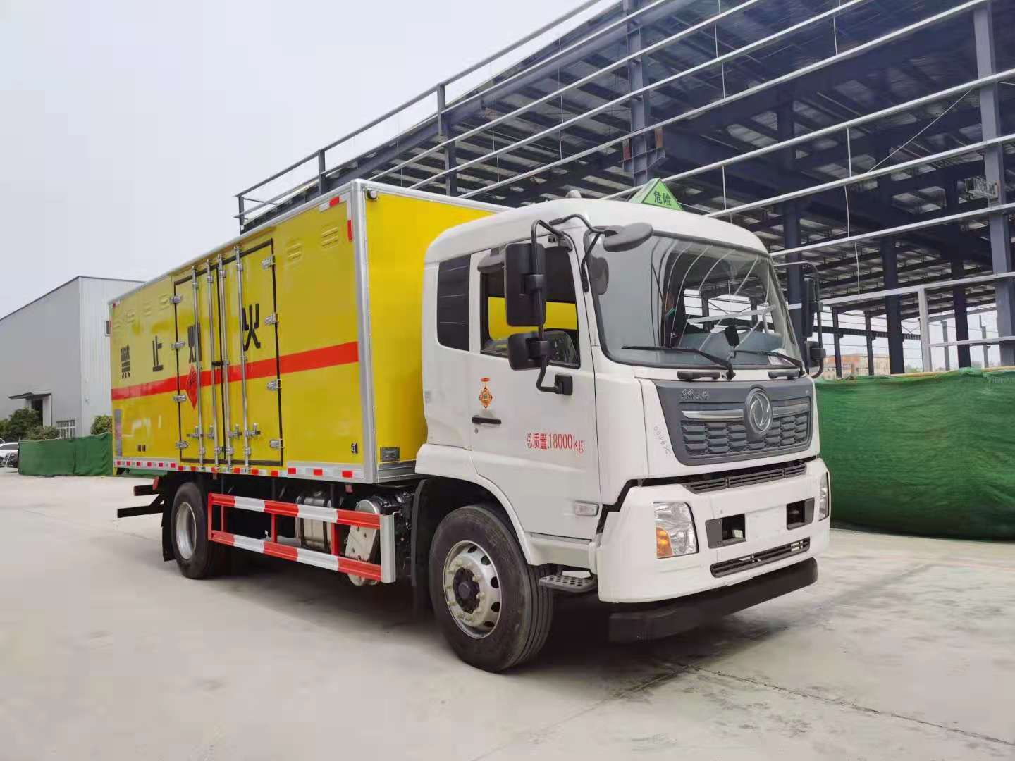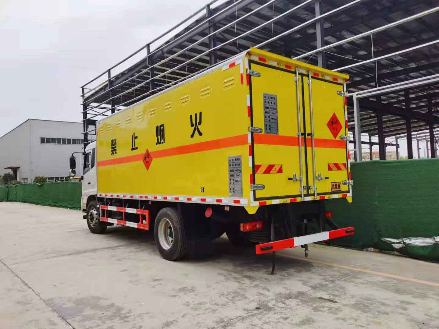 東風天錦一類危險品車采用東風天錦危險品車底盤,白色車頭,灰色車廂,帶中開側門,駕駛室帶倒車影像,駕駛室內安裝監視器。東風天錦4*2底盤,危險品專用底盤,D530排半標準頂,空調,康明斯B6.2NS6B210發動機,法士特8JS85E-C變速箱,軸距4700mm,4.5T/9T前后橋,板簧前3片后氣囊3/-,鋁160L油箱,速比4.88,275/80R22.5真空胎, 前盤式剎車,限速,ABS,EBS,FCWS/LDWS(前撞/車道偏離預警),TPMS(前軸單臺胎壓監測) 后雙開門,貨廂前、后各兩個示廓燈、貨廂內安裝離子感煙火災探測器、側廂及前廂內安裝固定臥環、地板裝置防靜電膠皮、側廂開通風口、安裝滅火器、安裝排氣火花熄滅器、車尾部安裝導靜電橡膠拖地帶、駕駛室安裝危險標志燈、門上安裝防盜報警器、車身側面及后部粘貼橙色反光標識、菱形標示、車體后部設置安全告示、后保險杠安裝緩沖加強橡膠塊。