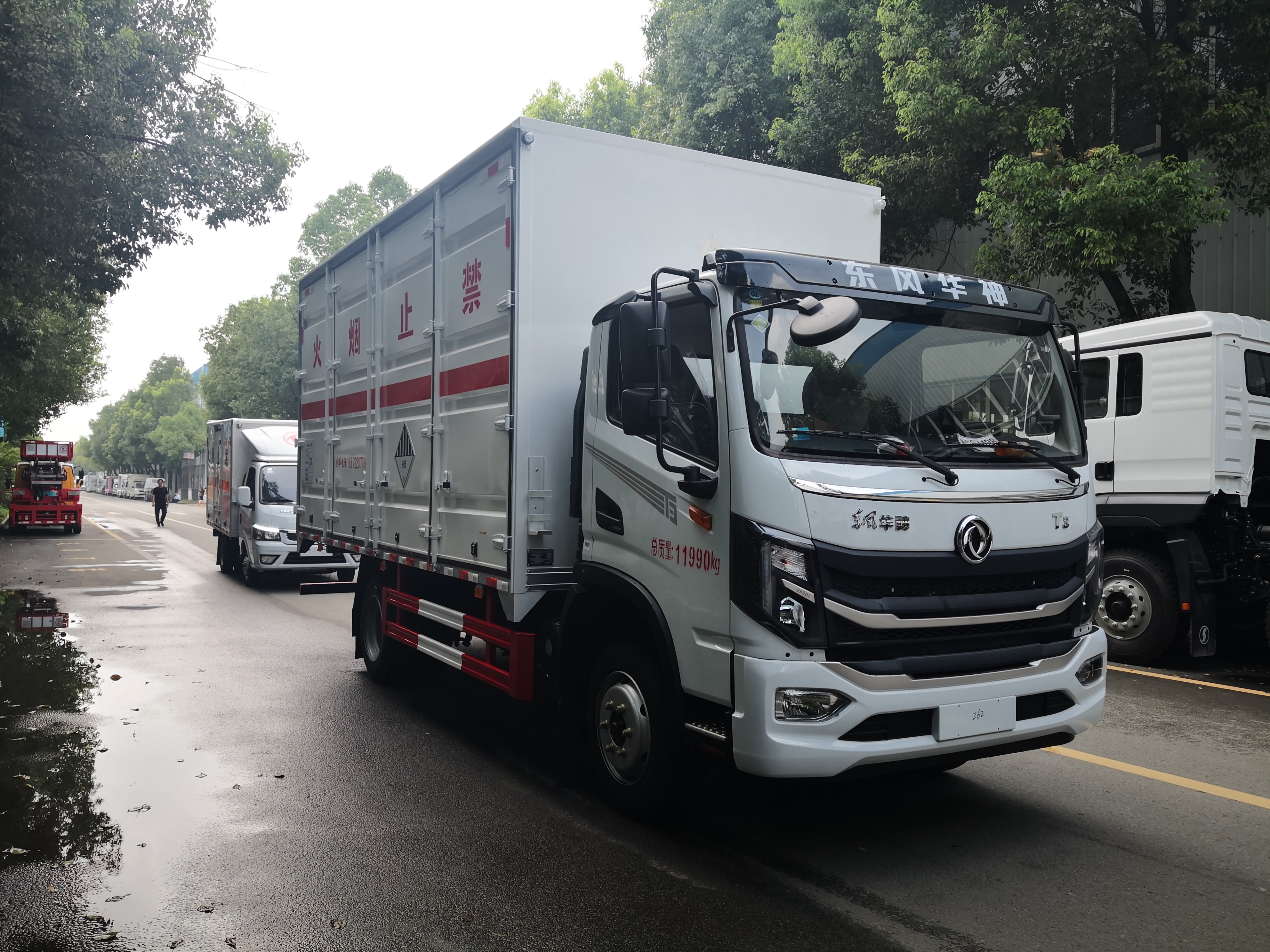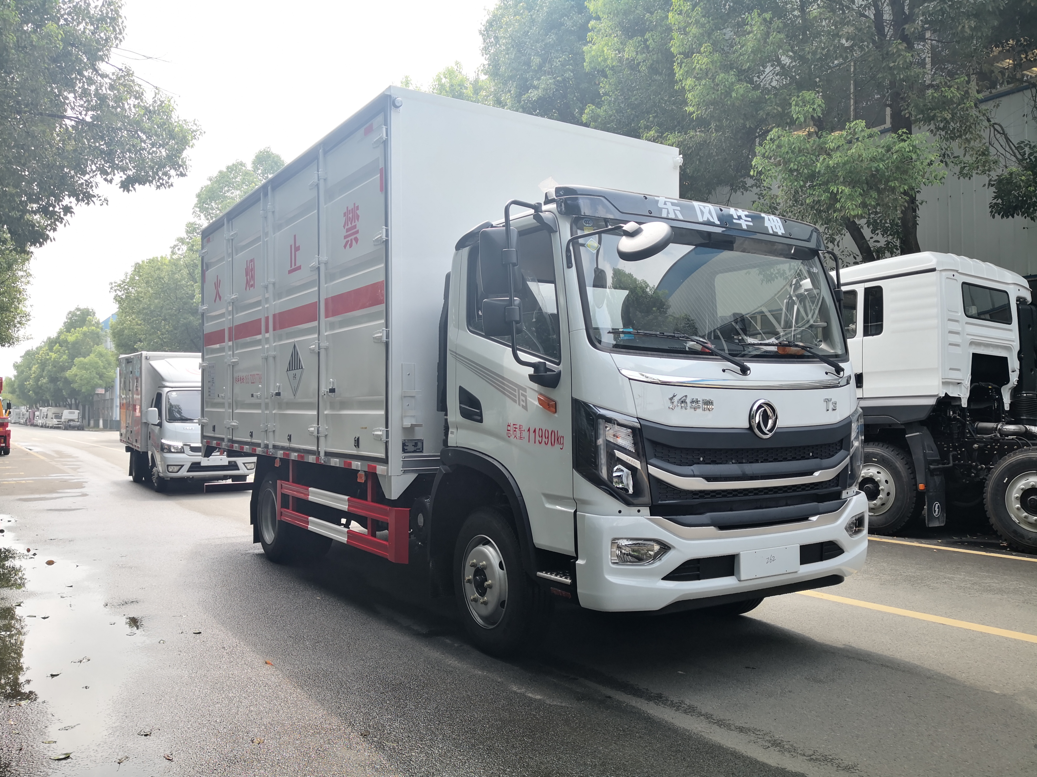 兩臺車分別為東風華神T3國六危險品車和東風途逸國六危險品車。東風華神T3國六危險品車采用新款【T3】單排駕駛室,發(fā)動機玉柴165馬力,萬里揚6檔變速箱,245/70R19.5,前后橋2.4/6,190雙層大梁,動轉,離合助力,斷氣剎,空調、電窗、中控鎖、ABS、多功能方向盤(定速巡航、藍牙連接)、氣囊座椅,前盤制動;ECU電子限速;排氣制動;新規(guī)-雙預警:帶車道偏移系統(tǒng)和防碰撞預警。