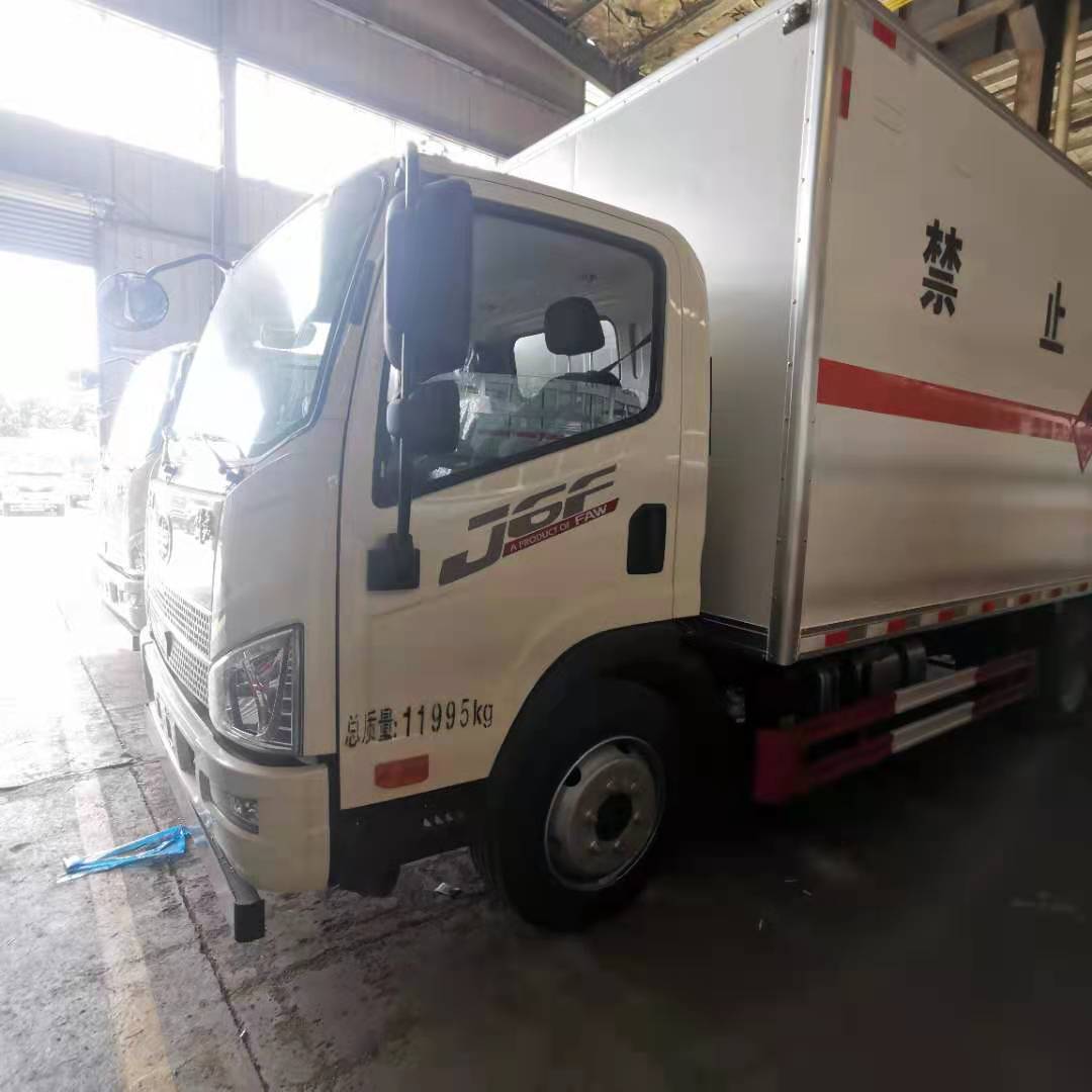 解放5米1國六帶雙開雙側門瓦楞板危險品車采用解放危險品車專用底盤,一汽6檔變速箱,濰柴,多功能方向盤,150L鋁合金油箱,濰柴160馬力發動機,板簧3/10+4,帶國產ABS,定速巡航,高架箱,空調+電動門窗+中控鎖,儀表EOL,后處理器前置+排氣火花熄滅器+前盤后鼓制動器+限速79KM/H,北斗+GPRS行車記錄儀,帶法蘭盤取力器及控制機構,前后橫向穩定桿,帶靜電拖地帶,前下防護,防飛濺擋泥板,液晶儀表,20L尿素箱,爆胎應急安全裝置,廂式危險品專用底盤。