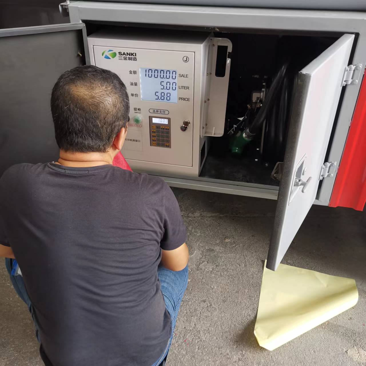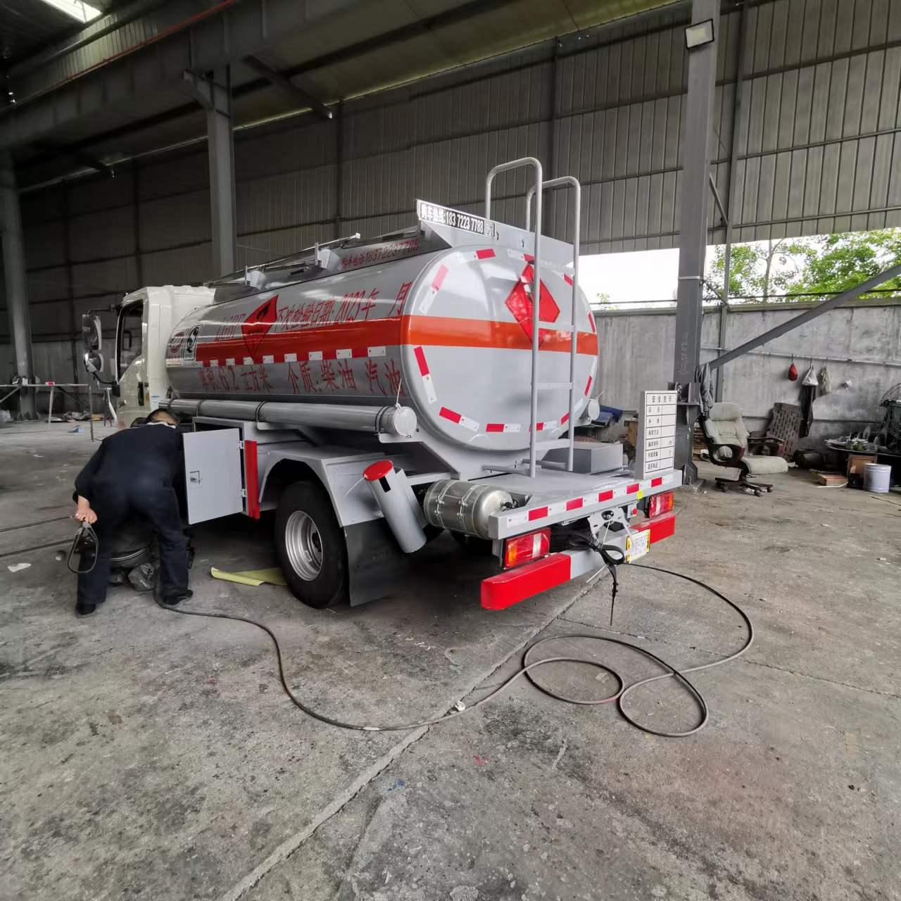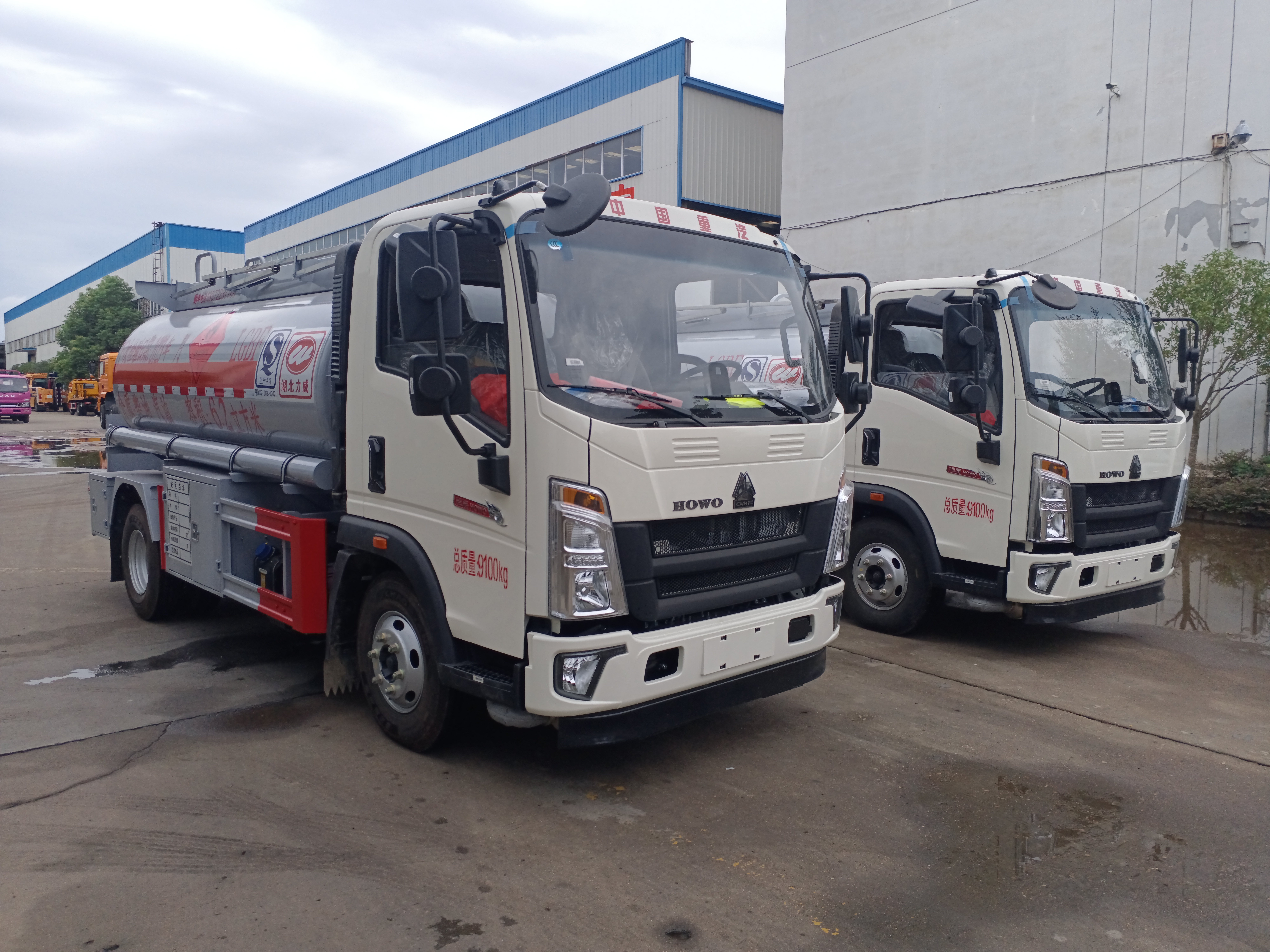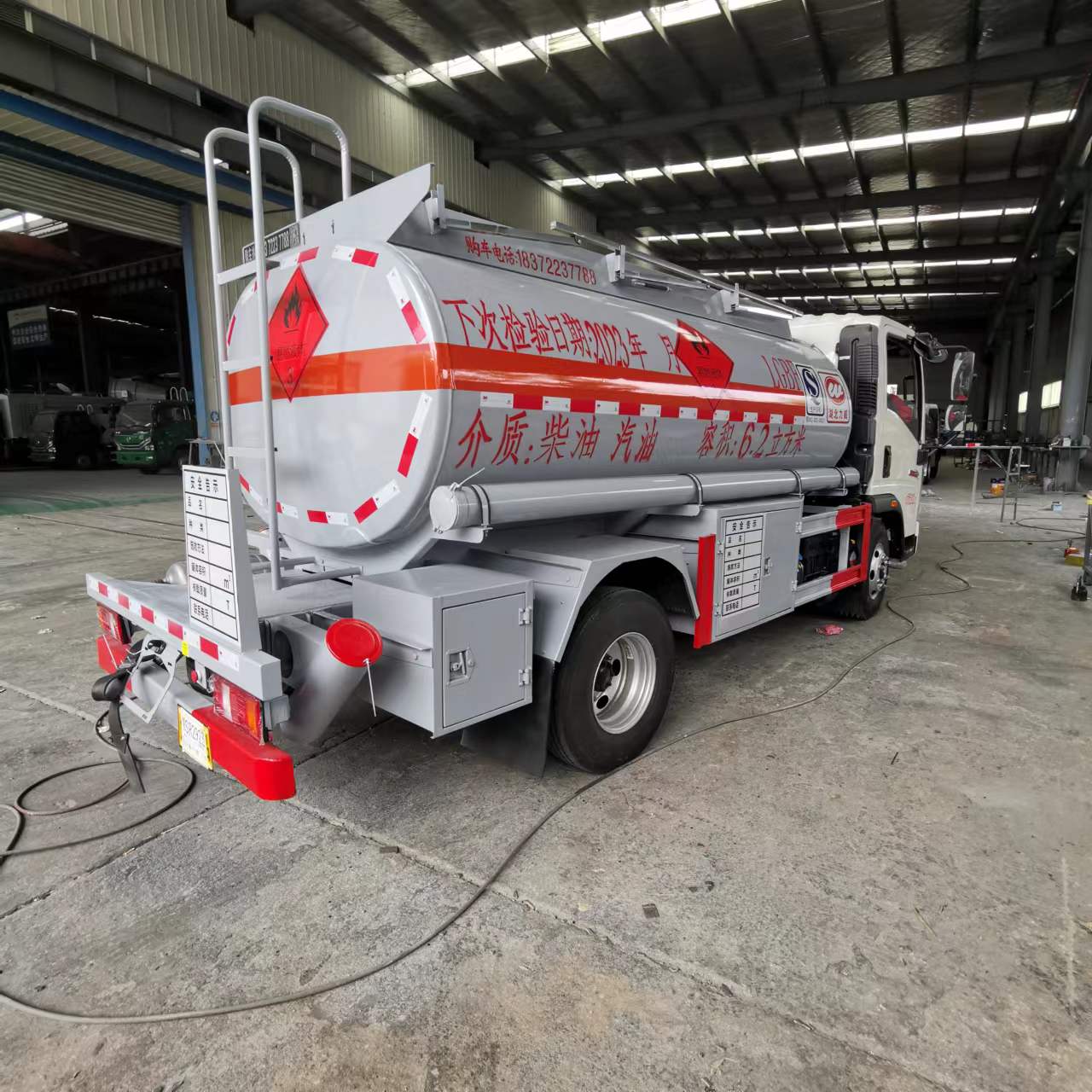重汽6.2方國六加油車罐體及整車尺寸嚴格按公告制作,罐體總容量:6.2立方,罐體材料采用Q235B型4.2mm(≥4.05mm),封頭4.2mm(≥4.05mm),罐體通倉,帶億豐80-60型油泵,泵進泵出,一套下裝油口、油氣回收、防溢流探桿及靜電卷盤(泵進出口及歐標全套裝在副駕駛室大梁一側),一套歐標罐口,一套DN100型緊急切斷閥(帶聲光報警裝置)。正駕大梁一側加裝一套正星大流量加油機及15米自動回位卷盤。帶不銹鋼升降護欄,尾部爬梯,配一個防火帽,兩根輸油管,兩個滅火器,其余廠內標配。油漆:淺灰色,反光條,反光帶,安全告示牌。出具整車證,底盤證,罐檢(柴油、汽油介質)。