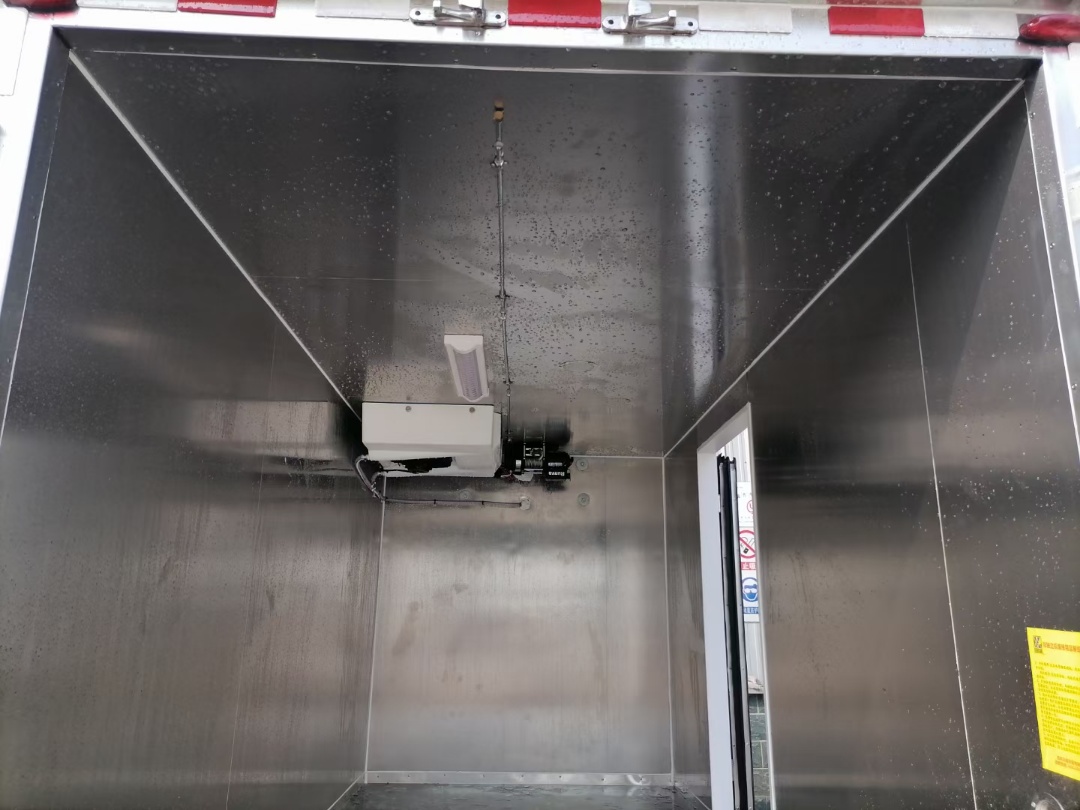 躍進S80國六藍牌無公害冷藏車廂體外玻璃鋼內(nèi)不銹鋼,不銹鋼整體采用焊接而成連接底板不銹鋼,尾部帶污水槽連接污水箱,保證了廂體整體不漏水。底板可選裝尼龍板。廂體頂部帶消毒噴淋桿及紫外線殺毒燈,并配制冷機組。整車配凈水箱一個,藥水消毒箱一個。廂體整體選裝自卸功能采用雙油缸舉升。保障廂體整體受力不側(cè)翻。