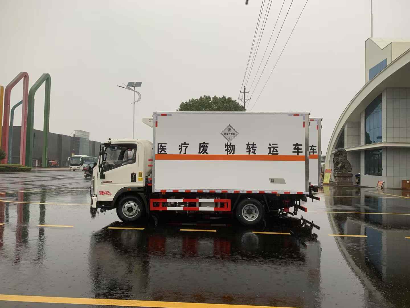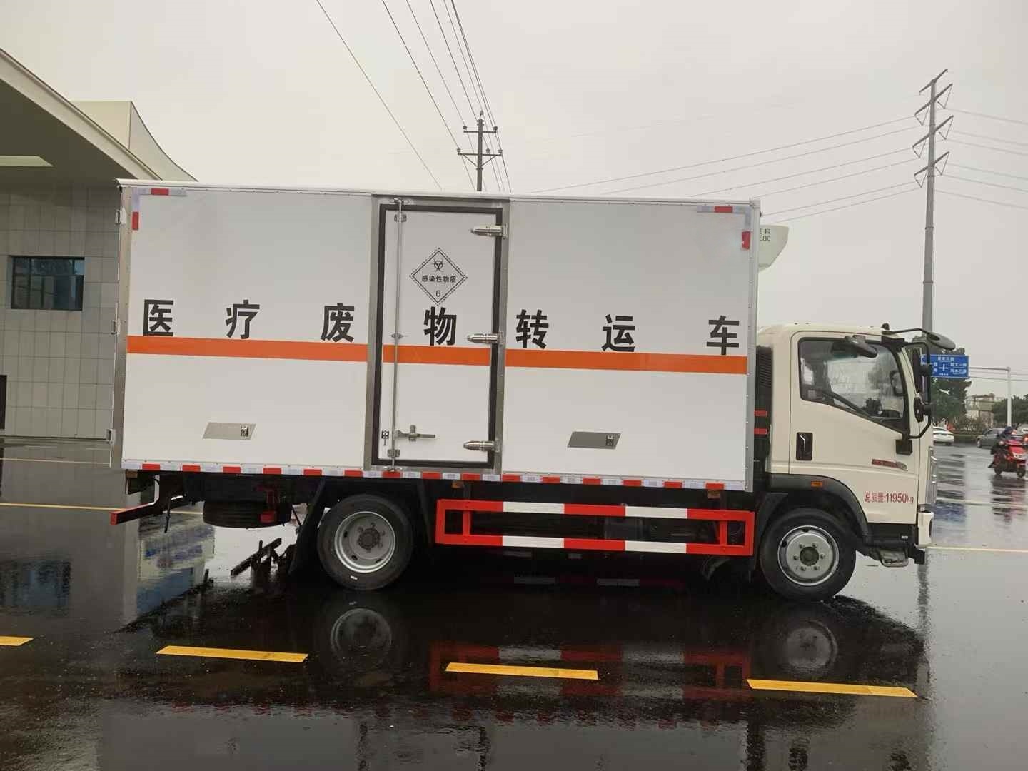 4臺重汽豪沃國六醫療廢物轉運車分別為3臺藍牌4米2車型和1臺黃牌5米2車型。采用的是專用危險品車底盤,匹配有濰柴160馬力發動機和濰柴130馬力發動機。車身采用高強度鋼材打造,搭配一體化密封貨廂與雙重防滲設計,有效杜絕轉運過程中滲漏、遺撒風險;車內配備紫外線消毒系統、恒溫控制系統與智能監控終端,實時監測貨廂溫度、密封狀態,確保醫療廢物從裝車到卸車全程處于安全可控環境,避免二次污染。