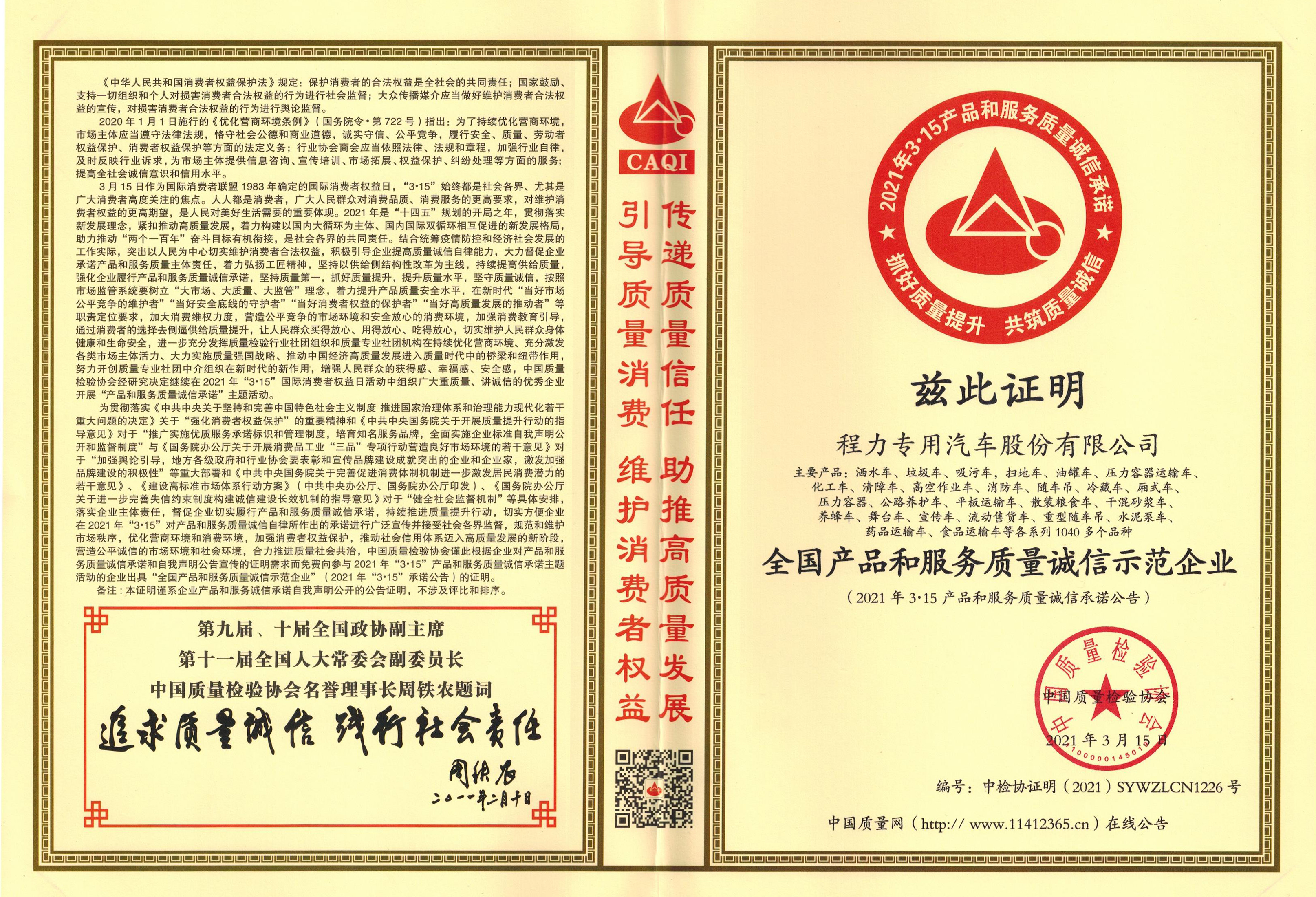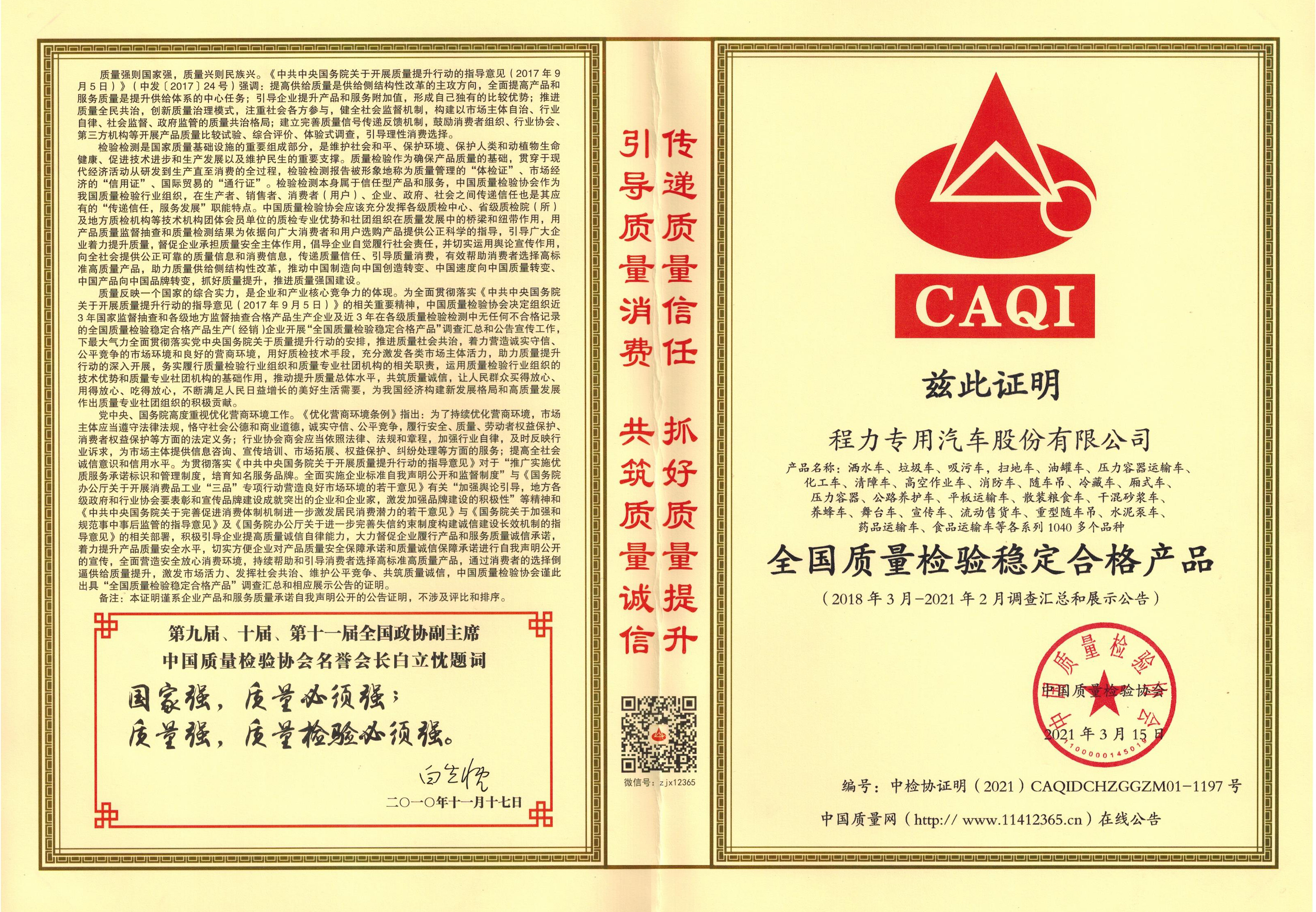 程力集團(tuán)質(zhì)檢部已成功申報(bào)審核通過(guò)了中國(guó)質(zhì)量檢驗(yàn)協(xié)會(huì)產(chǎn)品穩(wěn)定合格產(chǎn)品和服務(wù)質(zhì)量誠(chéng)信類證書,目前這兩種證書,在國(guó)內(nèi)只有少數(shù)大型名企業(yè)才有資格獲得;證書在專汽及應(yīng)急裝備產(chǎn)品招標(biāo)中,是必備調(diào)節(jié)之一,程力專汽已全部通過(guò)。購(gòu)買放心產(chǎn)品,程力專汽一直在努力,歡迎各新老客戶來(lái)電咨詢訂購(gòu)!