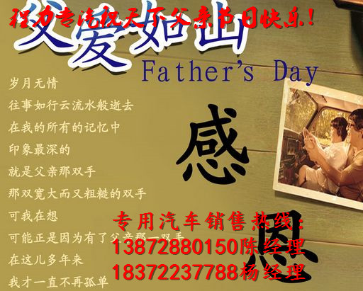 有一些愛,沉默無言卻又沉穩可靠;有一種人,童心未泯卻又爸氣十足!他們陪你笑鬧,我們陪他過節。父親節到來之際,程力專汽送上一句對父親們一聲的祝福:愿天下父親們身體健康,長壽年年!所有的在外游子們能常回家看看,陪陪父母,讓他們不再孤單!為了答謝新老客戶的厚愛,但凡今天所有訂車的客戶均可享受千元優惠,更有油卡享受,歡迎您撥打程力專用汽車股份有限公司廠家直銷熱線,電話:13872880150陳經理/18372237788楊經理(手機號即為微信號,添加有驚喜喲!)。