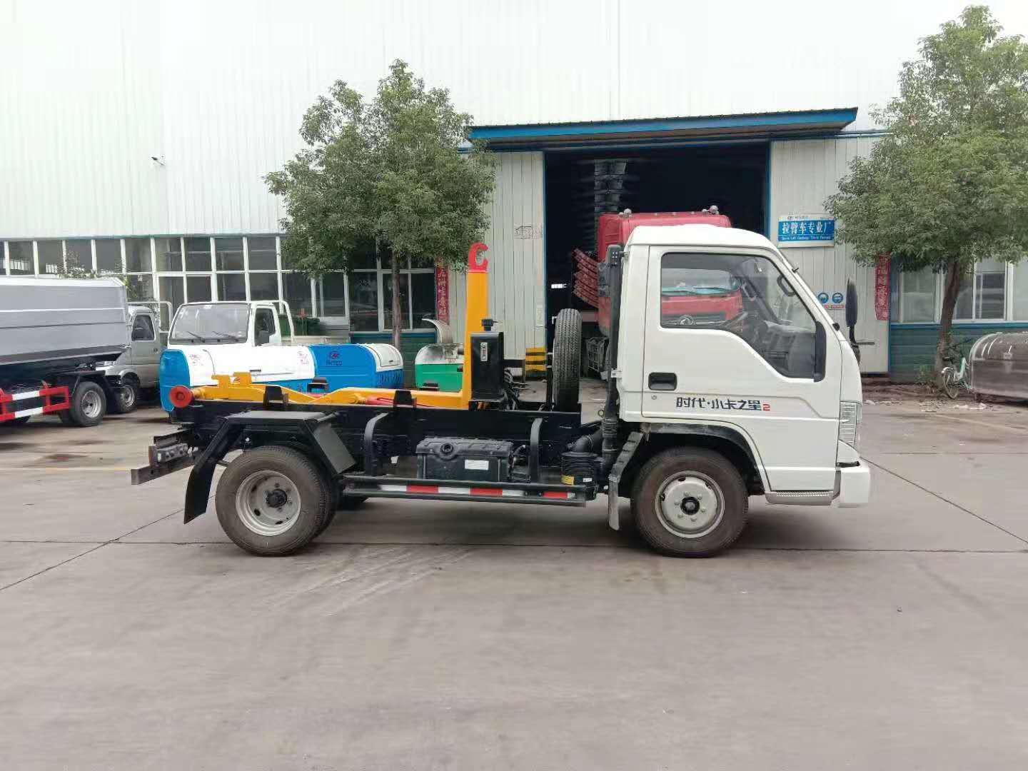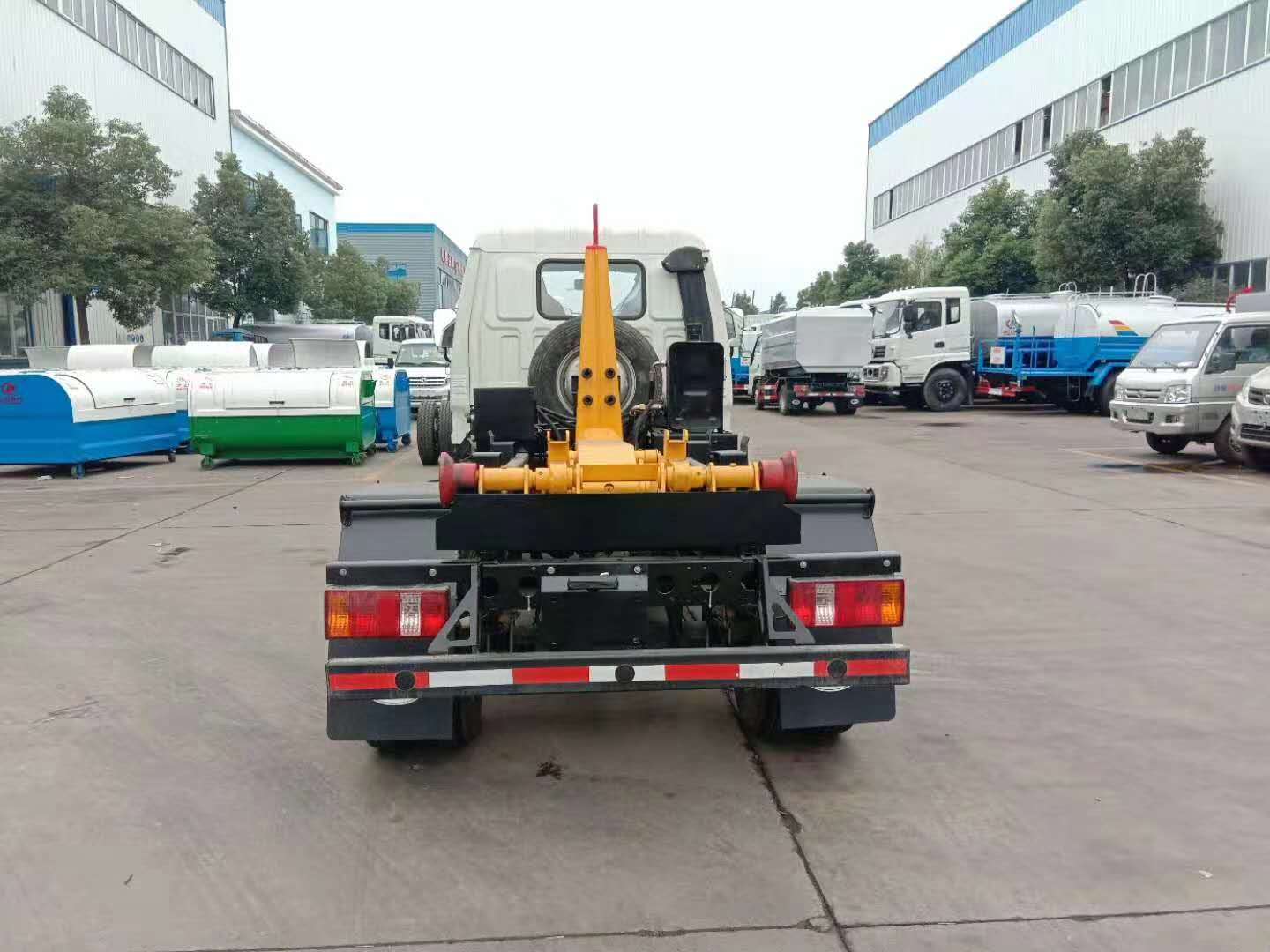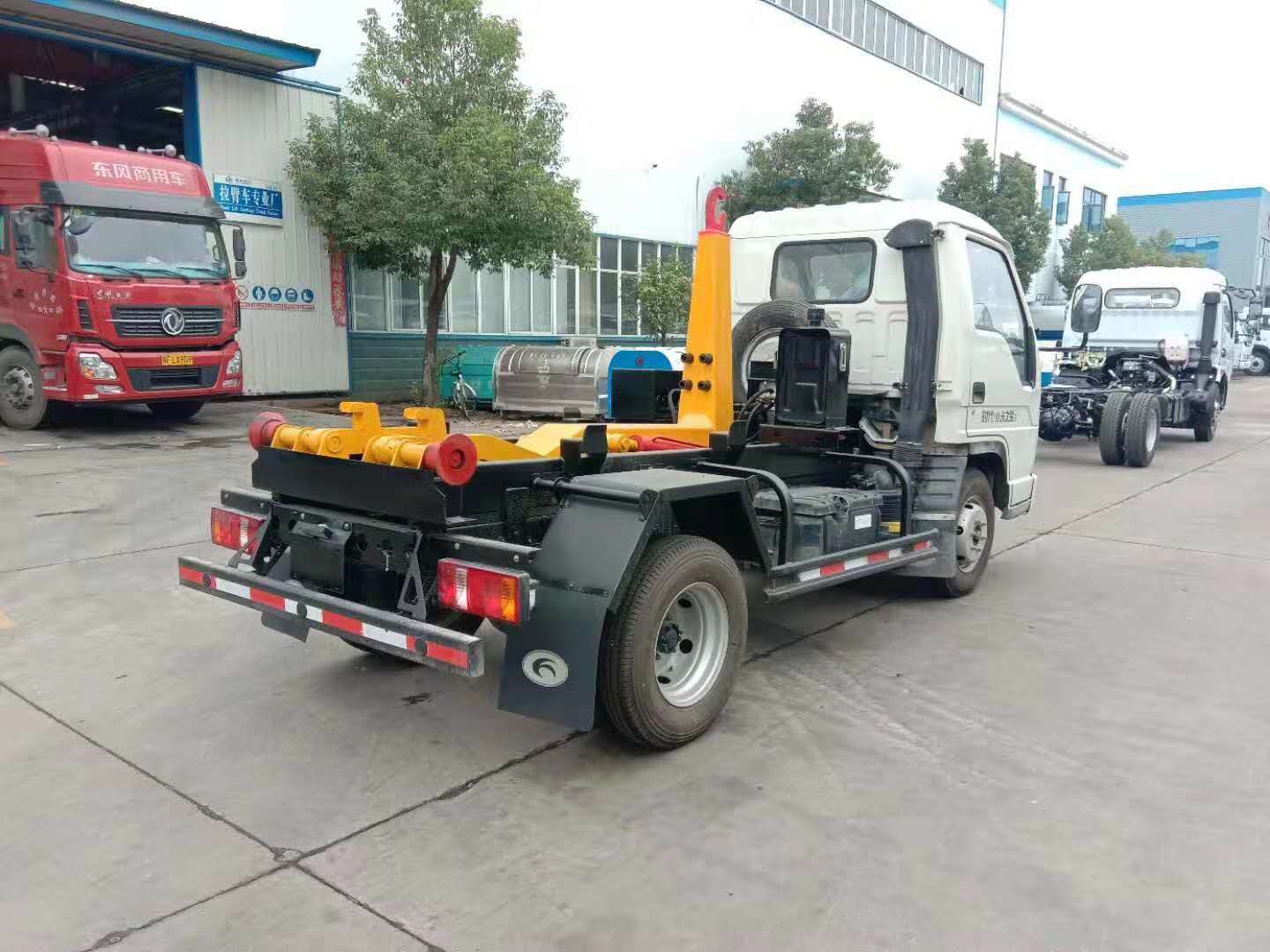 勾臂式垃圾車可將地下垃圾箱內的垃圾及垃圾箱一同拉至車上運走同時可自卸,且垃圾箱體采用液壓鎖緊或開啟,降 低了工人的勞動強度和改善了工作環境。該垃圾車的收運方式是目前世界上廣泛采用的垃圾收運方式,可以實現一車多箱,大大降低了配備成本和空間等等;其專用裝置的功能均以汽車發動機為動力,通過液壓機構手動或電控、氣控來實現。