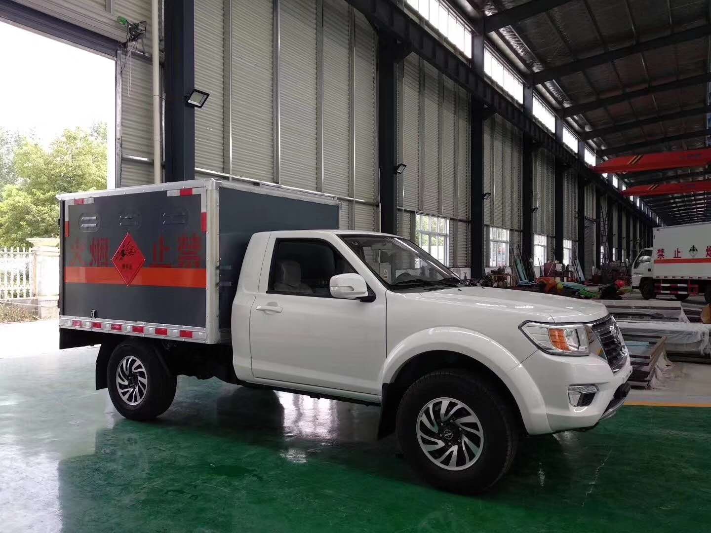 2)上裝配置:貨廂尺寸為2030X1780X1210(mm)、廂體外飾冷板、內飾鋁板、中間為防阻燃泡沫、廂內安裝臥環、煙霧報警器、防盜報警器、后雙開門(選裝隔斷及側開門)、帶拖地靜電帶,兩個滅火器,危險品警示燈,危險品標牌,其它均按廠標組織生產。