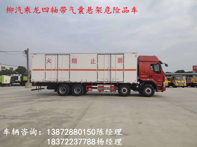 柳汽乘龍四軸危險品車整車尺寸:11950*2550*3950mm,貨箱尺寸:9400*2420*2500,上裝采用1mm厚冷軋板一次成型的百葉窗,內飾為導電性能良好的鋁板含透氣孔,內襯為矩形管骨架牢靠穩定,內部填充為透氣防潮阻燃的擠塑,底板和車廂雙開,右側選擇側開門,內部有固定貨物的臥環,外部有靜電帶,帶滅火器、防火罩,廂內安裝煙霧報警器和門防盜報警器。