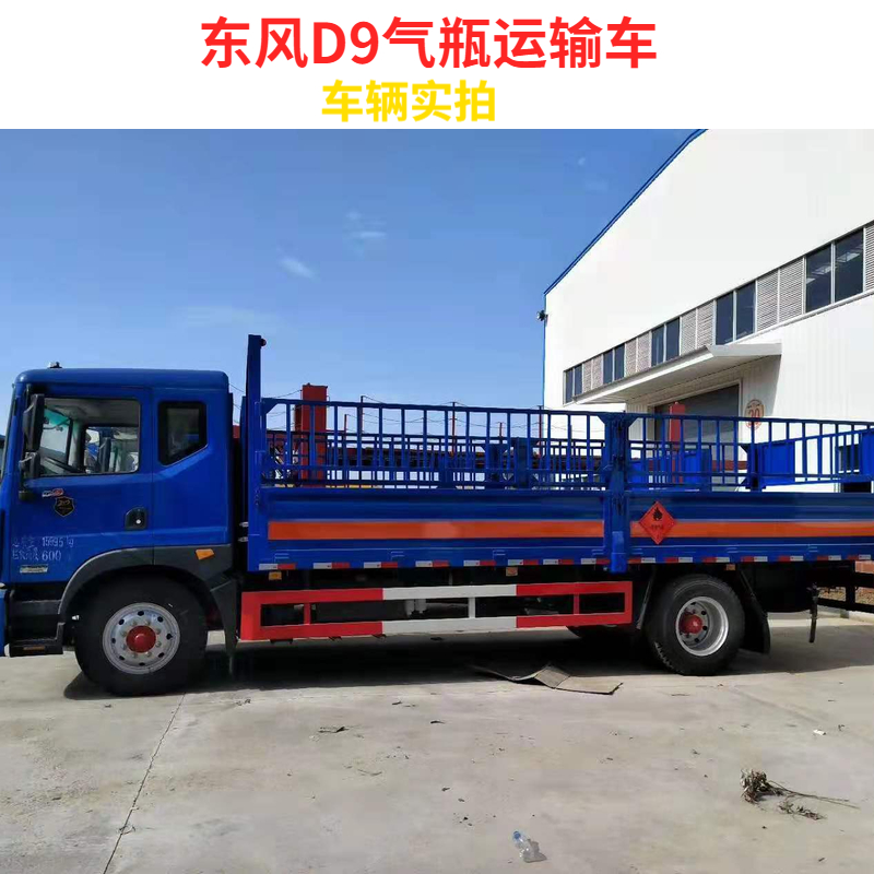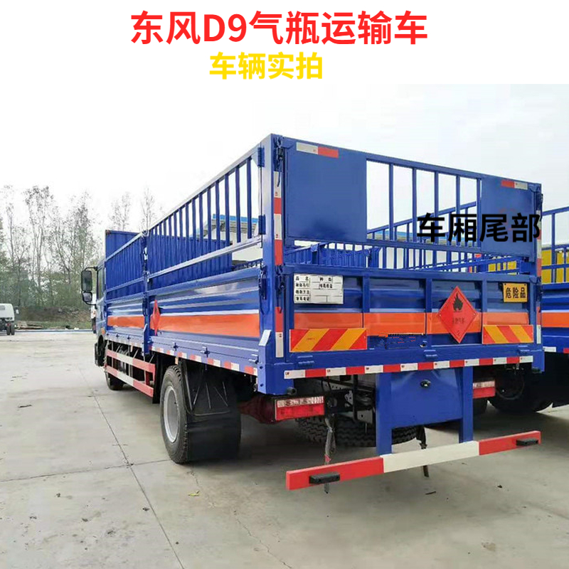 東風多利卡D9氣瓶運輸車采用原廠危險品車底盤,帶ABS、電子限速、排氣管前置、前盤制動,原廠方向助力,東風康明斯160馬力國五排放發動機,駕駛室帶電動玻璃、冷暖空調,9.00R20鋼絲胎,帶剎車調整臂。外形尺寸(mm):9000×2550×3020,廂體內部尺(mm):6750×2350×600。公告額定質量為9.3噸。廂體為金屬骨架結構,廂體生產工藝采用4mm底板,上鋪靜電膠皮,高600mm的墻板,上側配可拆卸護欄。尾部加裝1.5噸凱卓立牌液壓升降尾板。隨車提供:車輛合格證、機動車上戶發票、服務手冊、底盤工具包、危險品頂燈、防火帽、兩個滅火器。