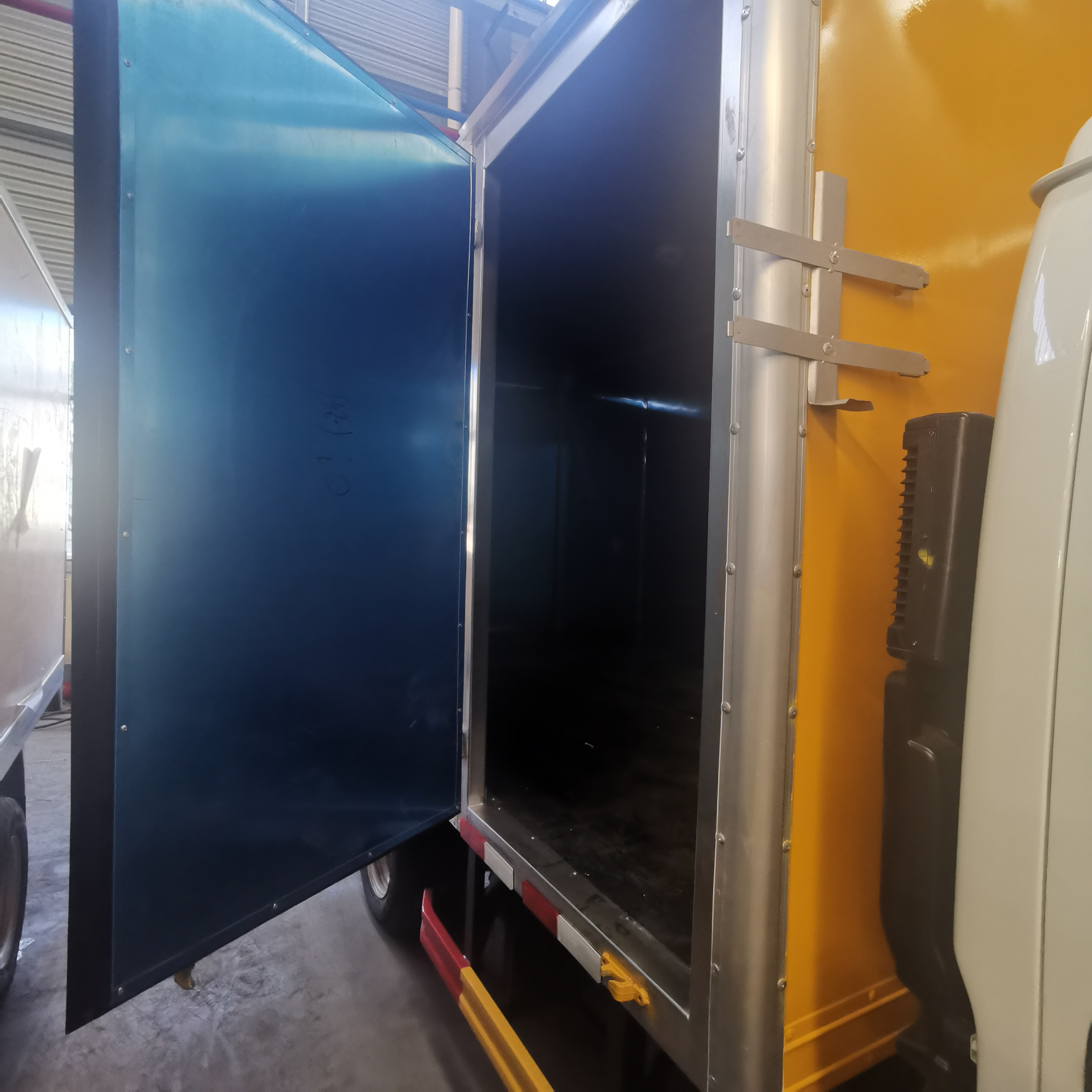 躍進S80帶隔艙國六防爆車廂體采用外飾冷軋鋼板,內飾鋁合金板,中間填充隔熱阻燃材料,(選裝側門和隔倉)廂體兩側上方設有防雨功能自然通風窗口,底部鋪有阻燃導靜電膠板,廂體側面裝有固定拉環,與捆綁帶使用捆綁貨物以避免移動。在車廂內頂部安裝感煙報警器,在門器框上方安裝有防盜報警器,廂體外側安裝示廓燈及滅火器支架,配置兩個滅火器,并有“嚴禁煙火”和“爆”等字樣,廂體周邊貼反光標識。后門貼有安全告示,危險品標牌。車輛尾部安裝兩條拖地導靜電膠帶,駕駛室頂部裝有安全三角燈。廂體顏色有:黃、白、灰色等可選。