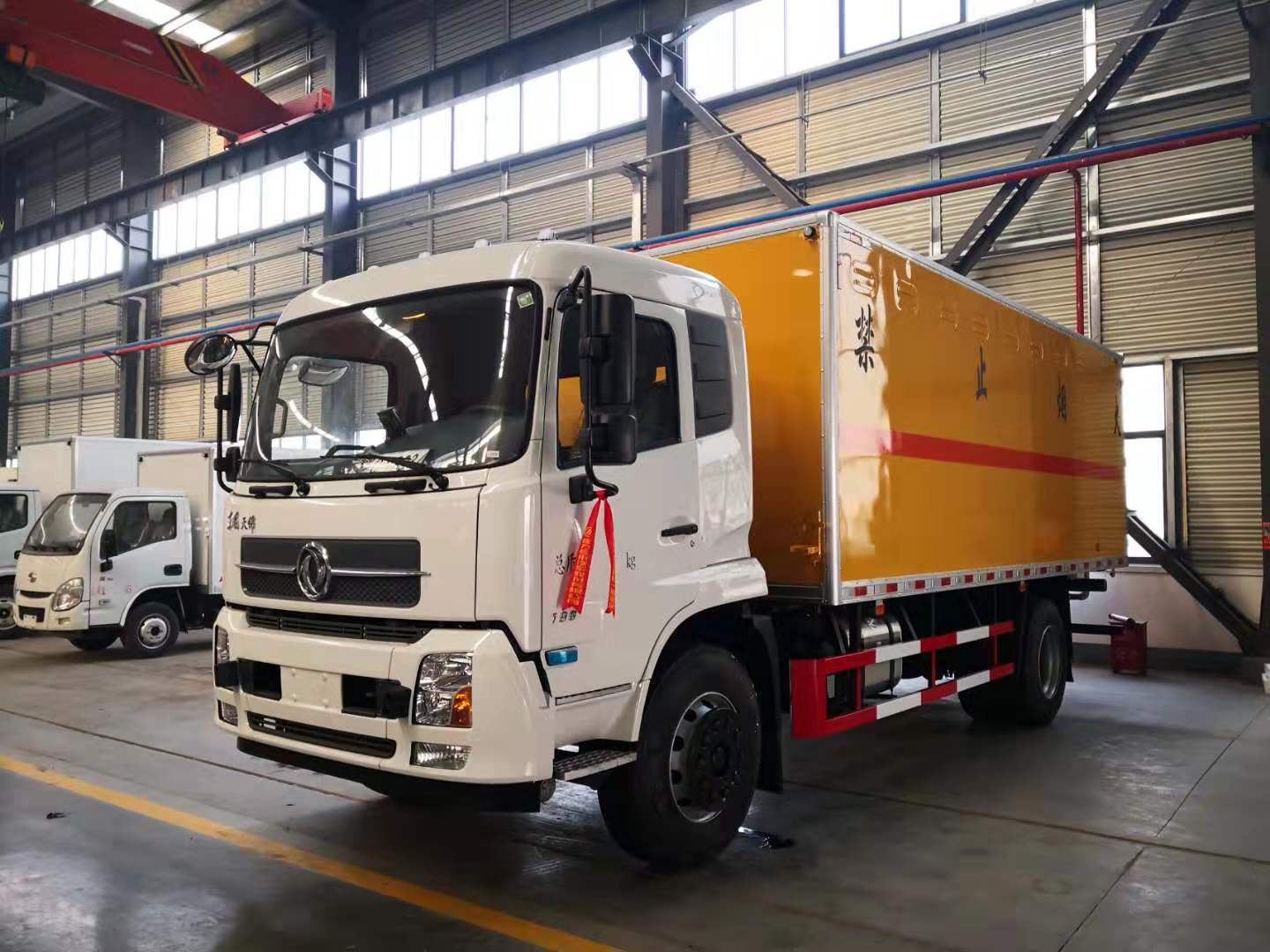 廂體配置:整車尺寸:9000×?2550×3680;廂體尺寸:6580×2390×2180 ,嚴(yán)格按照公告尺寸制作,外板采用1mm厚冷軋板有一次性成型的百葉窗,內(nèi)飾為導(dǎo)電性能良好的鋁板有透氣孔,內(nèi)襯為矩形管骨架牢靠穩(wěn)定,內(nèi)部填充為透氣防潮阻燃的擠塑板,四種材料經(jīng)現(xiàn)代工藝復(fù)合而成,廂體外部上下鋁合金型材包邊,底板和車廂前下部鋪橡膠皮,后門雙開(kāi),右側(cè)中部雙開(kāi)門,內(nèi)部有固定貨物的臥環(huán),車輛外部有靜電帶、滅火器、防火罩,車廂內(nèi)安裝煙霧報(bào)警器和門防盜報(bào)警器,嚴(yán)格按照國(guó)家危險(xiǎn)品相關(guān)法規(guī)張貼。
