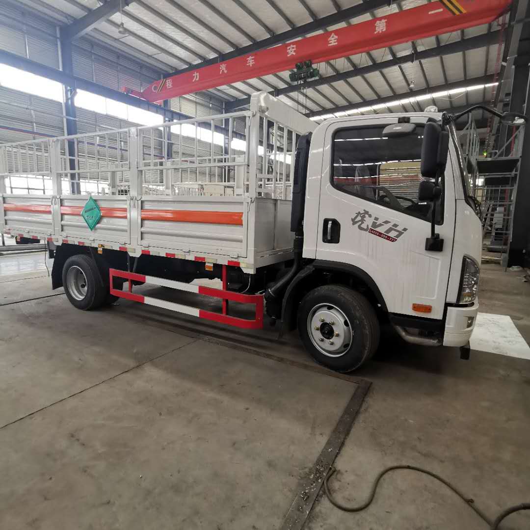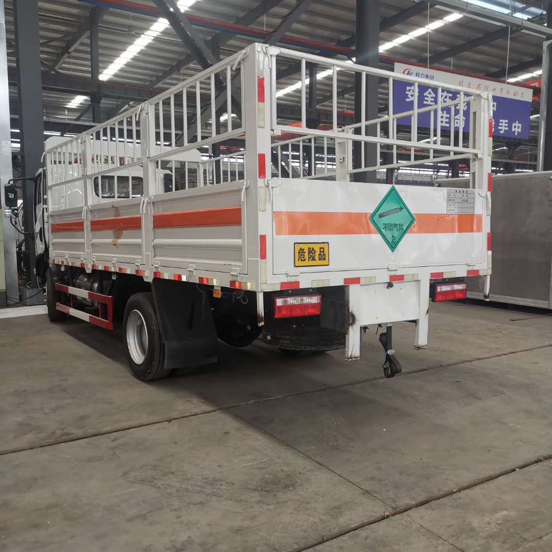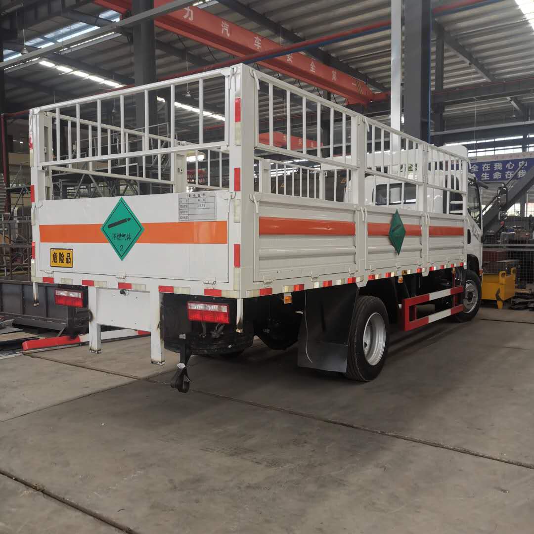 解放國六氣瓶運輸車廂體為金屬骨架結構,廂體生產工藝采用4mm底板,鋪靜電膠皮,高600mm的墻板,上側配可拆卸護欄。配備隨車工具?稍b液壓尾板,車輛嚴格按照公告制作。