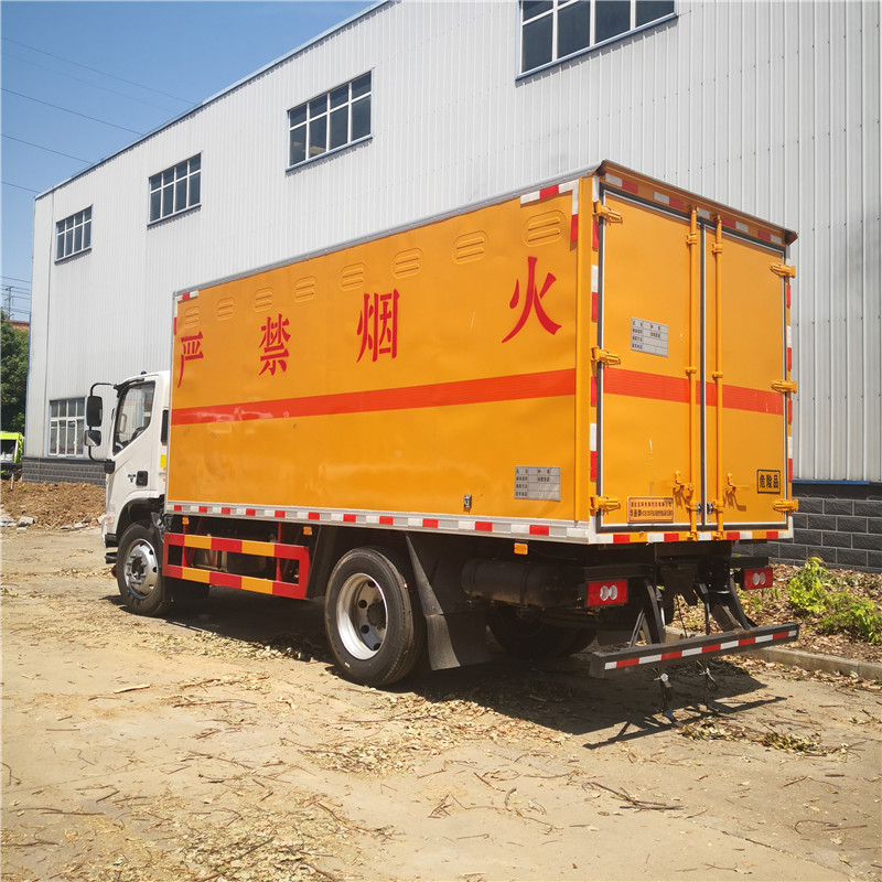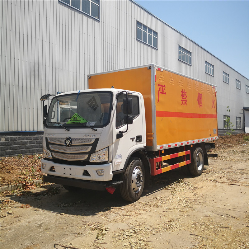 國六額載7噸福田奧鈴爆破器材運輸車廂體生產工藝采用可產生靜電屏蔽效應通風防雨的冷扎透氣鋼板,中間附以B1級阻燃擠塑板,內飾鋁合金板,廂內四周內飾采用鋁合金角鋁型材壓邊。廂內安裝固定運載物的臥環,防燃煙霧報警器,門上安裝防盜報警器,前置安裝防撞防靜電膠皮。廂體門框采用一次成形像膠密封條,底部為防爆鋼板上鋪靜電膠板。車廂配備防盜報警器,煙霧報警器,滅火器等。貨廂前后兩個示廓燈,排氣管尾端安裝排氣火花熄滅器,駕駛室安裝危險品三角標志燈,車聲側面及后部粘貼橙色反光標識,易燃氣體標示,車體后部設置危險標志牌。