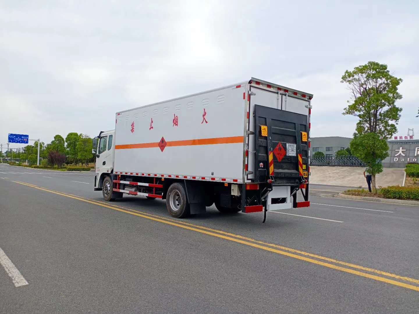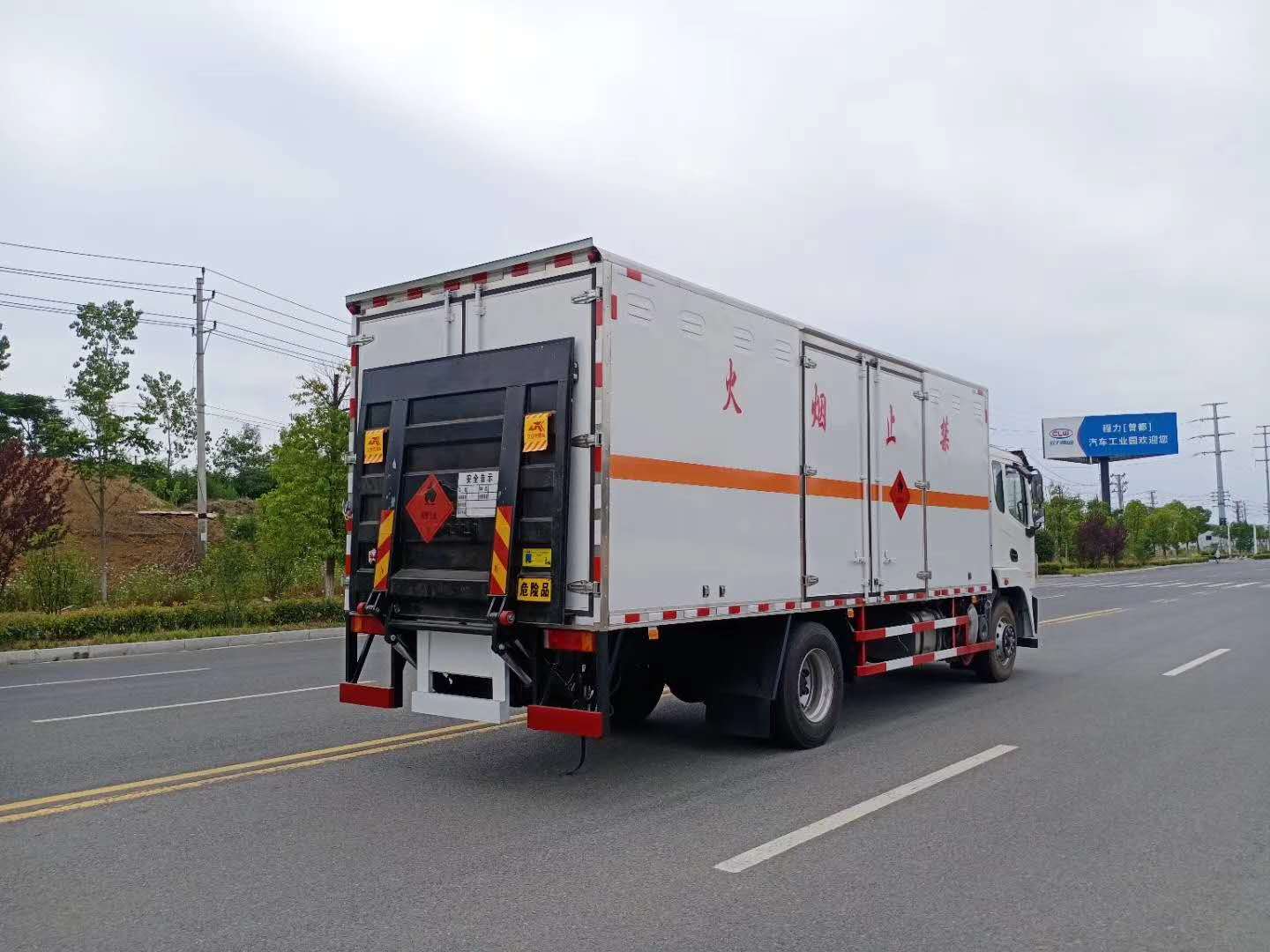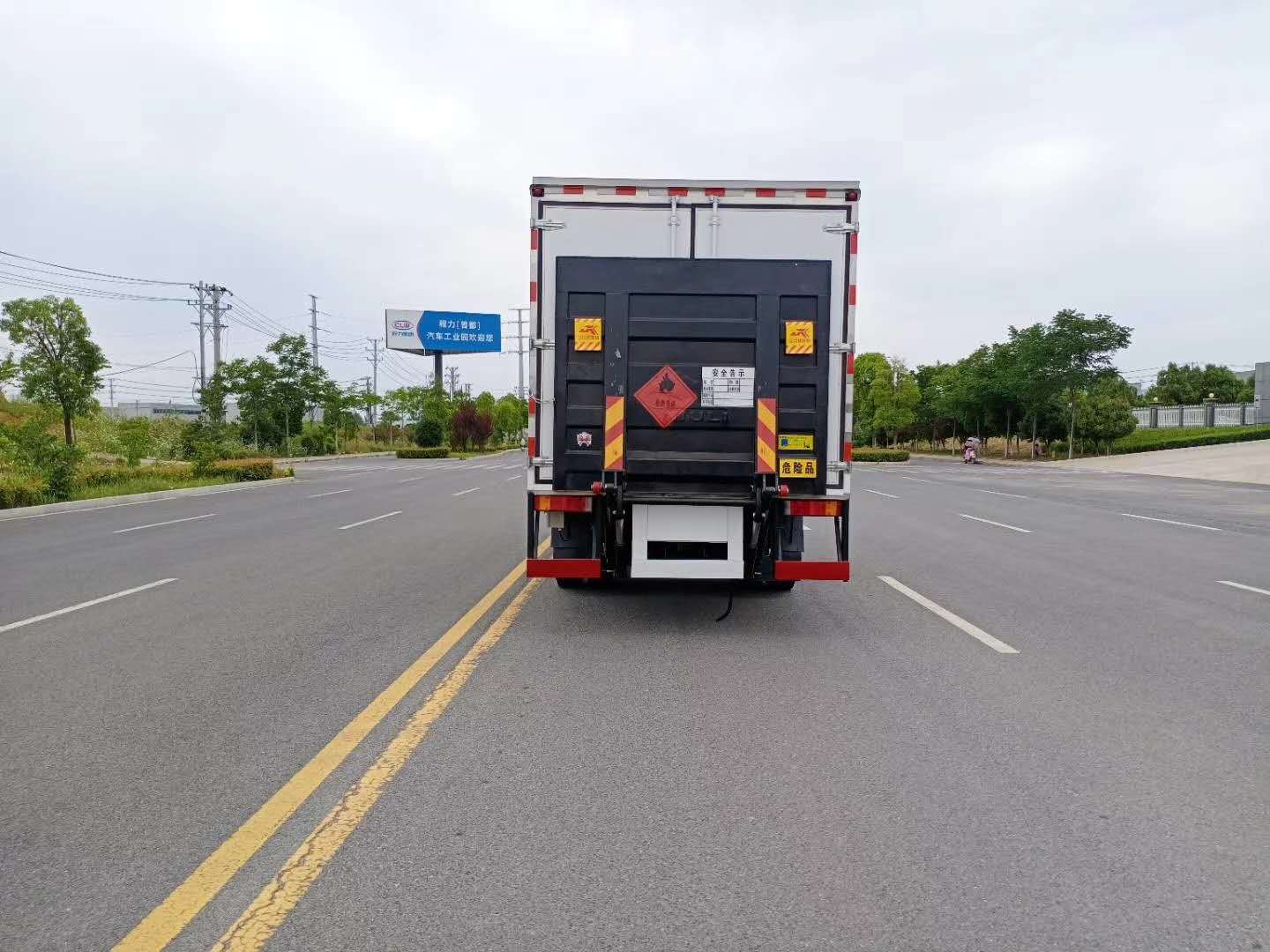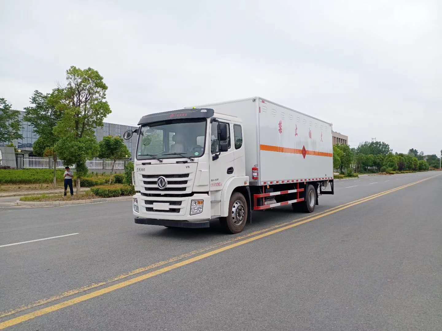 5)上裝配置:廂體為雙層金屬骨架結構,外板冷軋板,中間填充阻燃泡沫,內壁采用鋁合金蒙面,并用鋁合金型材收邊,門框采用不銹鋼材質包邊,鍍鋅合頁、門桿、鎖件,廂體兩側上部安裝防雨通風透氣孔。底板為花紋板,上鋪防靜電膠皮,廂體右側中開單側門。廂內兩側加裝固定貨物臥環,門框帶防盜報警器,頂部帶煙霧報警器,防撞塊。配備隨車工具,滅火器,三角頂燈,防火帽,防靜電拖帶,貼反光標識等。