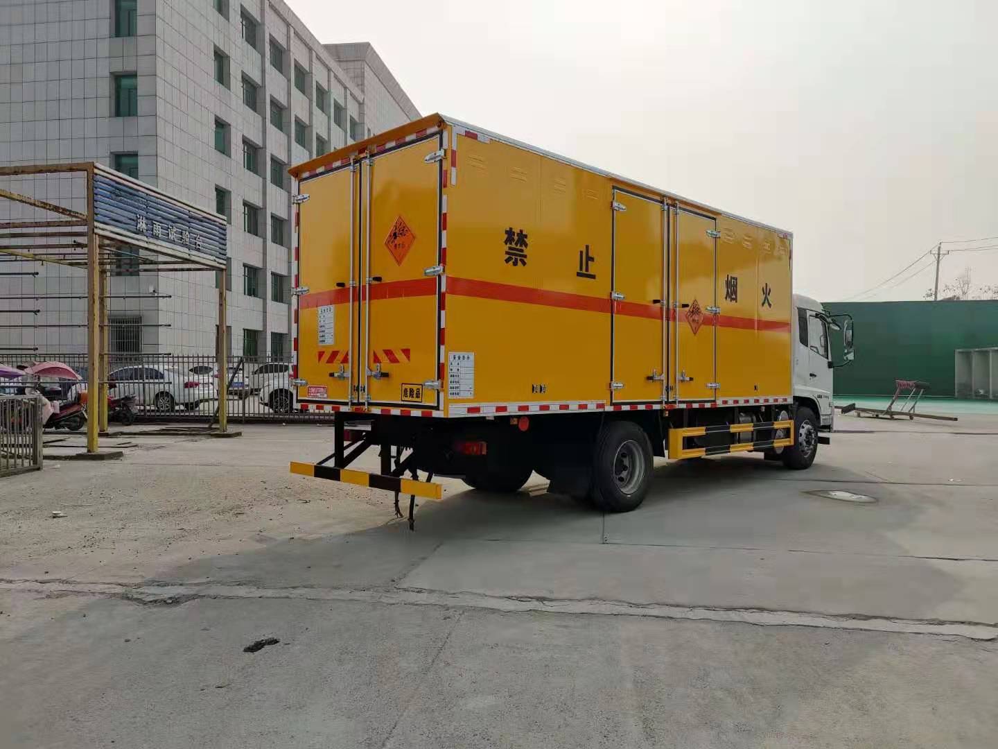 東風天錦危險品車廂體材質(zhì)為復(fù)合型防爆板:外板1.2mm冷軋鋼板,內(nèi)板為靜電良好的1mm厚鋁板,中間為30×40mm金屬方管,填充材料為40mm厚B2級隔熱防阻燃擠塑板。廂體兩側(cè)板上部開防雨型通風孔,便于空氣流通。廂體底板為3mm厚花紋板外鋪10mm厚靜電膠皮,前廂板下部處鋪10mm厚靜電膠皮,以防止車廂內(nèi)產(chǎn)生靜電火花,兩側(cè)板安裝內(nèi)嵌式臥環(huán),便于固定車廂內(nèi)的貨物。頂板中間處設(shè)置煙霧器,側(cè)門和尾門鎖緊處設(shè)置防盜器,并于駕駛室內(nèi)部蜂鳴器連接,便于駕駛?cè)藛T及時發(fā)現(xiàn)并險情。廂體頂部封閉不可開啟。廂體右(副駕)側(cè)開側(cè)門,廂體尾部雙開門。車廂顏色為/白色,安裝整車示廓燈,車廂外前廂板兩側(cè)設(shè)兩個滅火器支架(隨車贈送4Kg滅火器兩個),車廂尾部副梁處設(shè)置兩根可收放式銅芯靜電帶,使車輛與大地等電位連接,車身國標反光標,左右及尾部三塊菱形危險品標識,尾部粘貼危險品告示,兩張危險品警示牌,車頂一個三角形危險品頂燈。