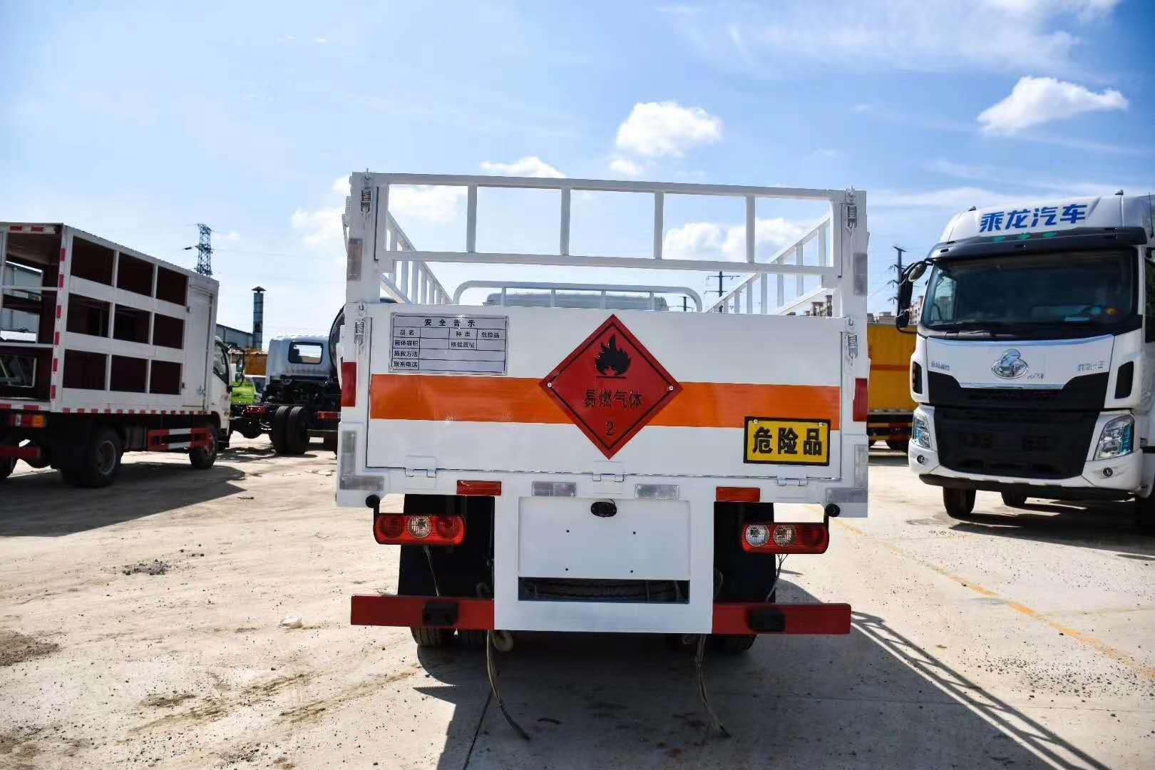 躍進S80國六氣瓶運輸車廂體為欄板結構,欄板可向下放倒。配置兩個滅火器,并有“嚴禁煙火”和“易燃氣體”等字樣,廂體周邊貼反光標識。后門貼有安全告示,危險品標牌。車輛尾部副梁安裝兩條拖地導靜電帶,駕駛室頂部裝有安全三角燈。廂體顏色可定制:黃、白、灰色等。