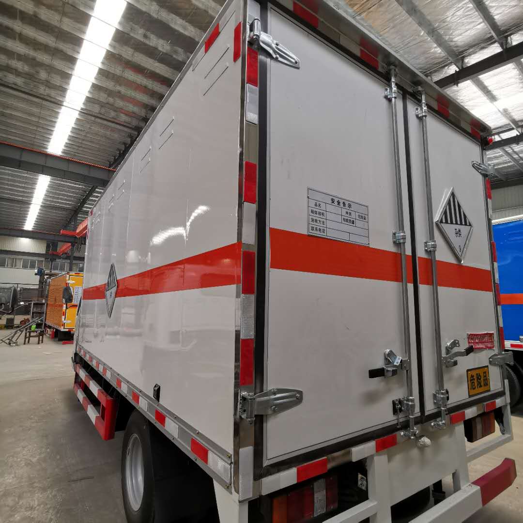 江鈴國六黃牌防爆車廂體為雙層金屬結構,外板采用靜電屏蔽冷板(國標1.2),中間填充B1級阻燃泡沫,內飾為鋁板(國標1.0)。廂體上側安裝防雨通風透氣孔。底板為花紋板(國標3.0),上鋪防靜電膠皮,廂體右側開側門(標配單開側門,選裝雙開)。廂內兩側加裝固定貨物臥環(可選擇裝槽)。門框帶防盜報警器,頂部帶煙霧報警器。配備隨車工具,滅火器,三角頂燈,防靜電拖帶,貼反光標識等。