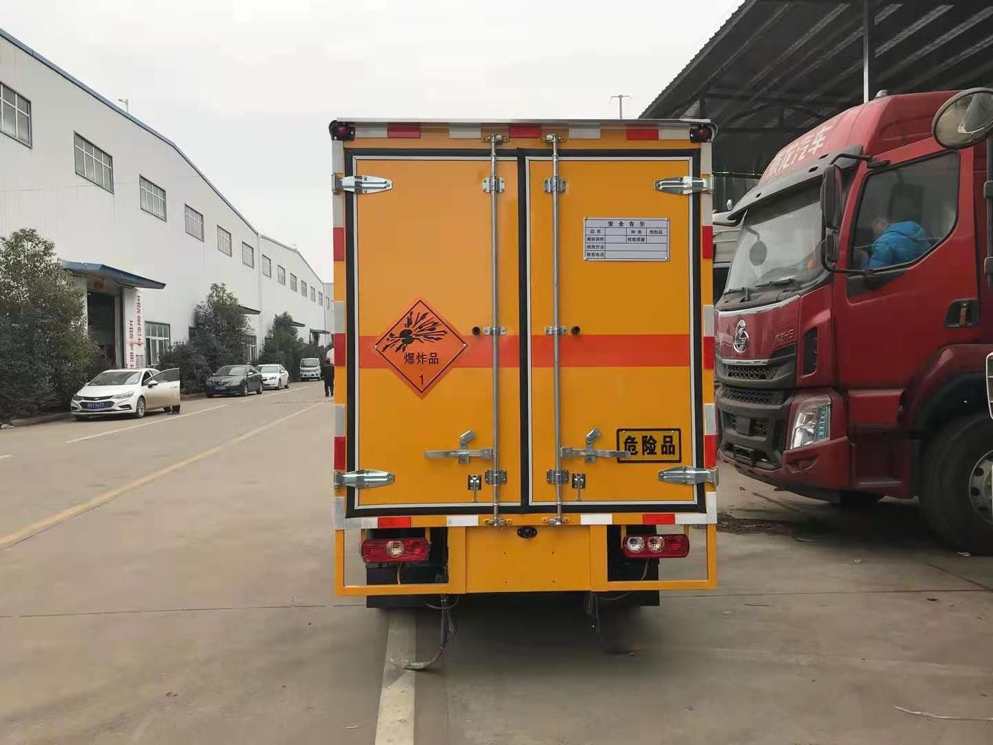 躍進S80帶隔艙國六防爆車廂體采用外飾冷軋鋼板,內(nèi)飾鋁合金板,中間填充隔熱阻燃材料,(選裝側(cè)門和隔倉)廂體兩側(cè)上方設(shè)有防雨功能自然通風窗口,底部鋪有阻燃導靜電膠板,廂體側(cè)面裝有固定拉環(huán),與捆綁帶使用捆綁貨物以避免移動。在車廂內(nèi)頂部安裝感煙報警器,在門器框上方安裝有防盜報警器,廂體外側(cè)安裝示廓燈及滅火器支架,配置兩個滅火器,并有“嚴禁煙火”和“爆”等字樣,廂體周邊貼反光標識。后門貼有安全告示,危險品標牌。車輛尾部安裝兩條拖地導靜電膠帶,駕駛室頂部裝有安全三角燈。廂體顏色有:黃、白、灰色等可選。