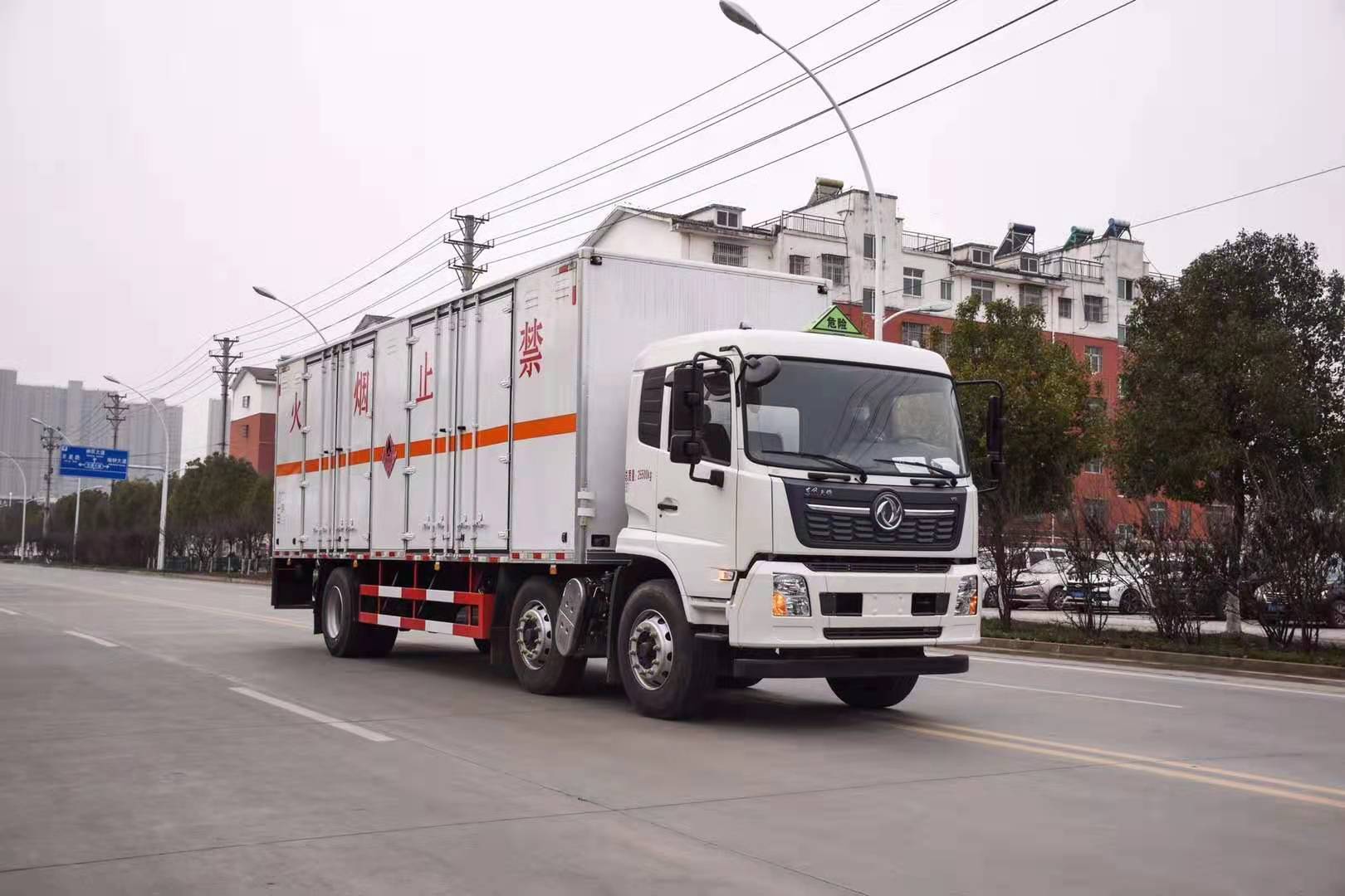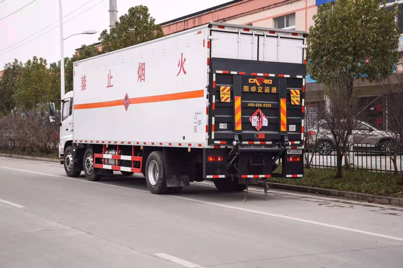 東風天錦7米7國六危險品車廂體采用外飾冷軋鋼板,內飾鋁合金板,中間填充隔熱阻燃材料,(選裝側門和隔倉)廂體兩側上方設有防雨功能自然通風窗口,底部鋪有阻燃導靜電膠板,廂體側面裝有固定拉環,與捆綁帶使用捆綁貨物以避免移動。在車廂內頂部安裝感煙報警器,在門器框上方安裝有防盜報警器,廂體外側安裝示廓燈及滅火器支架,配置兩個滅火器,并有“嚴禁煙火”和“爆”等字樣,廂體周邊貼反光標識。后門貼有安全告示,危險品標牌。車輛尾部安裝兩條拖地導靜電膠帶,駕駛室頂部裝有安全三角燈。廂體顏色有:黃、白、灰色等可選。
