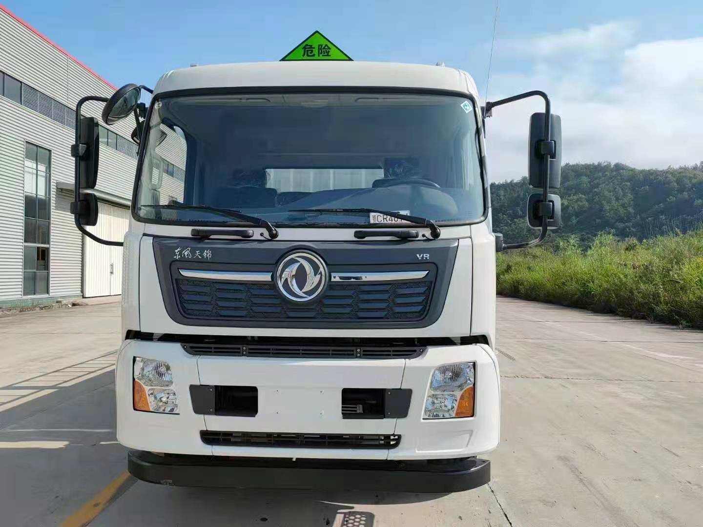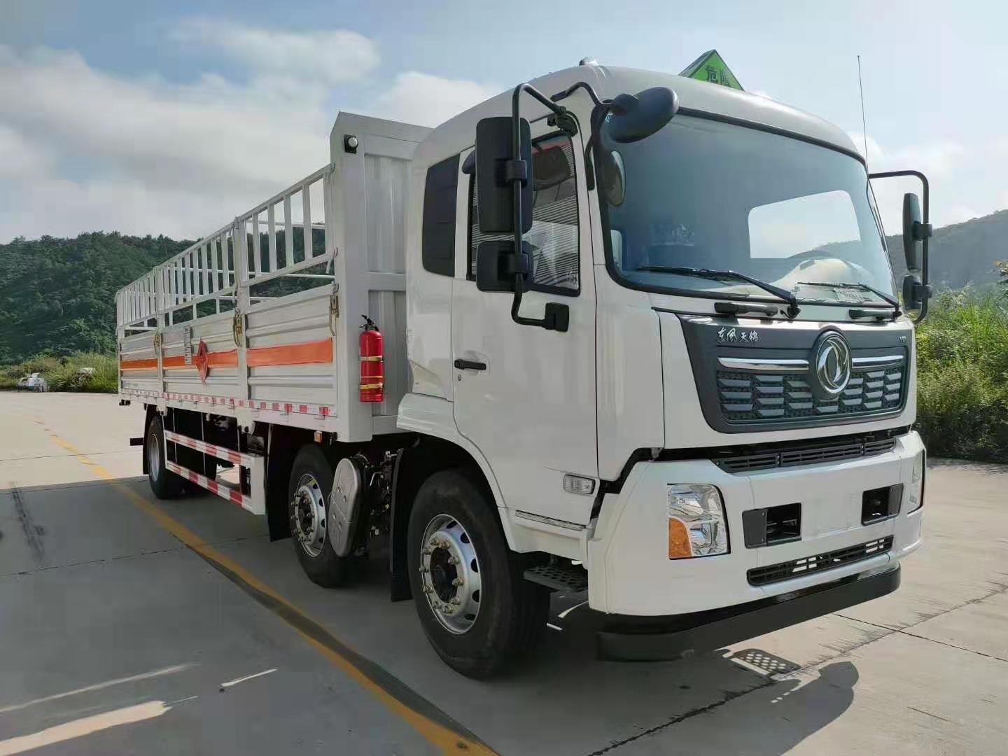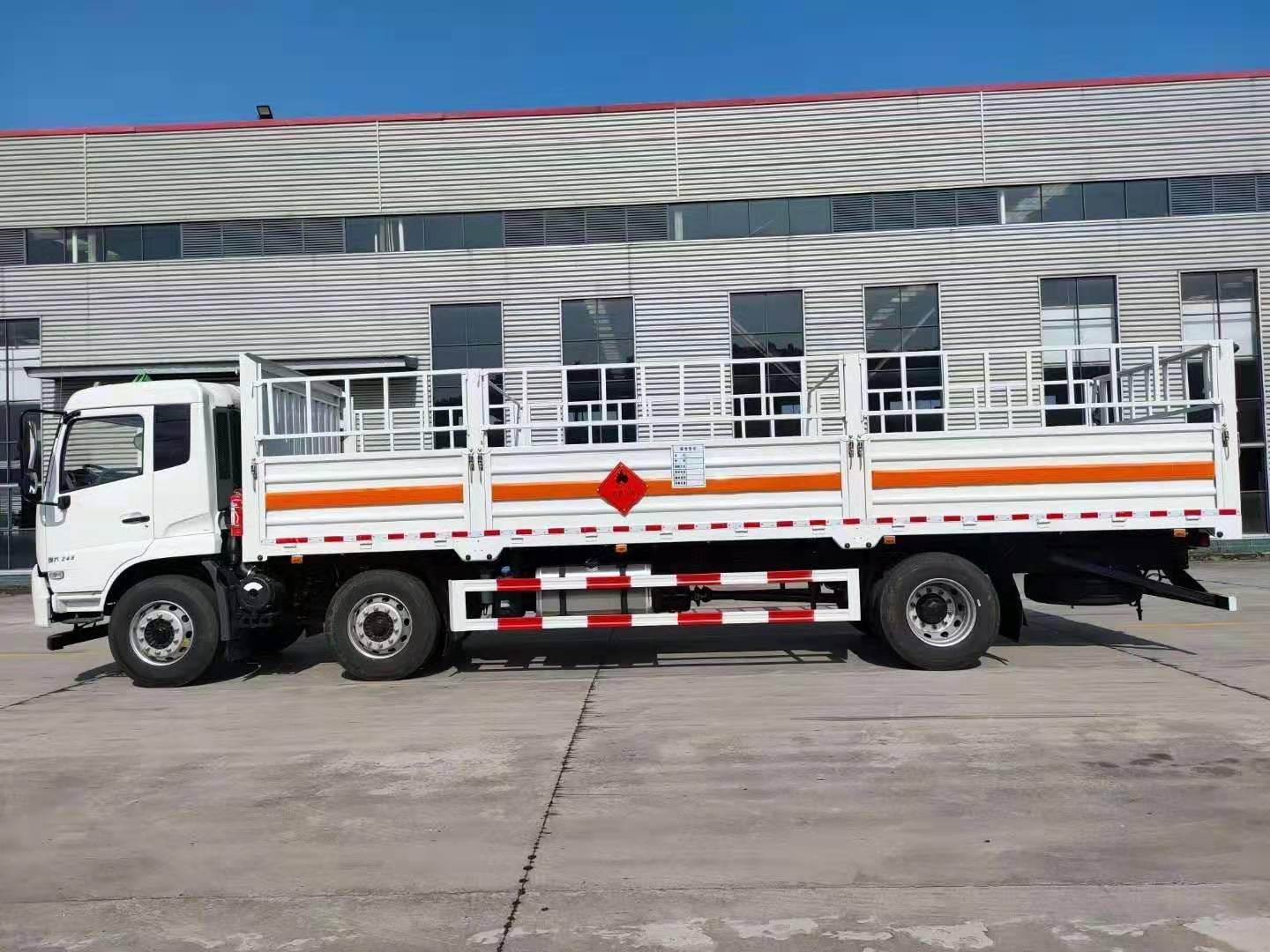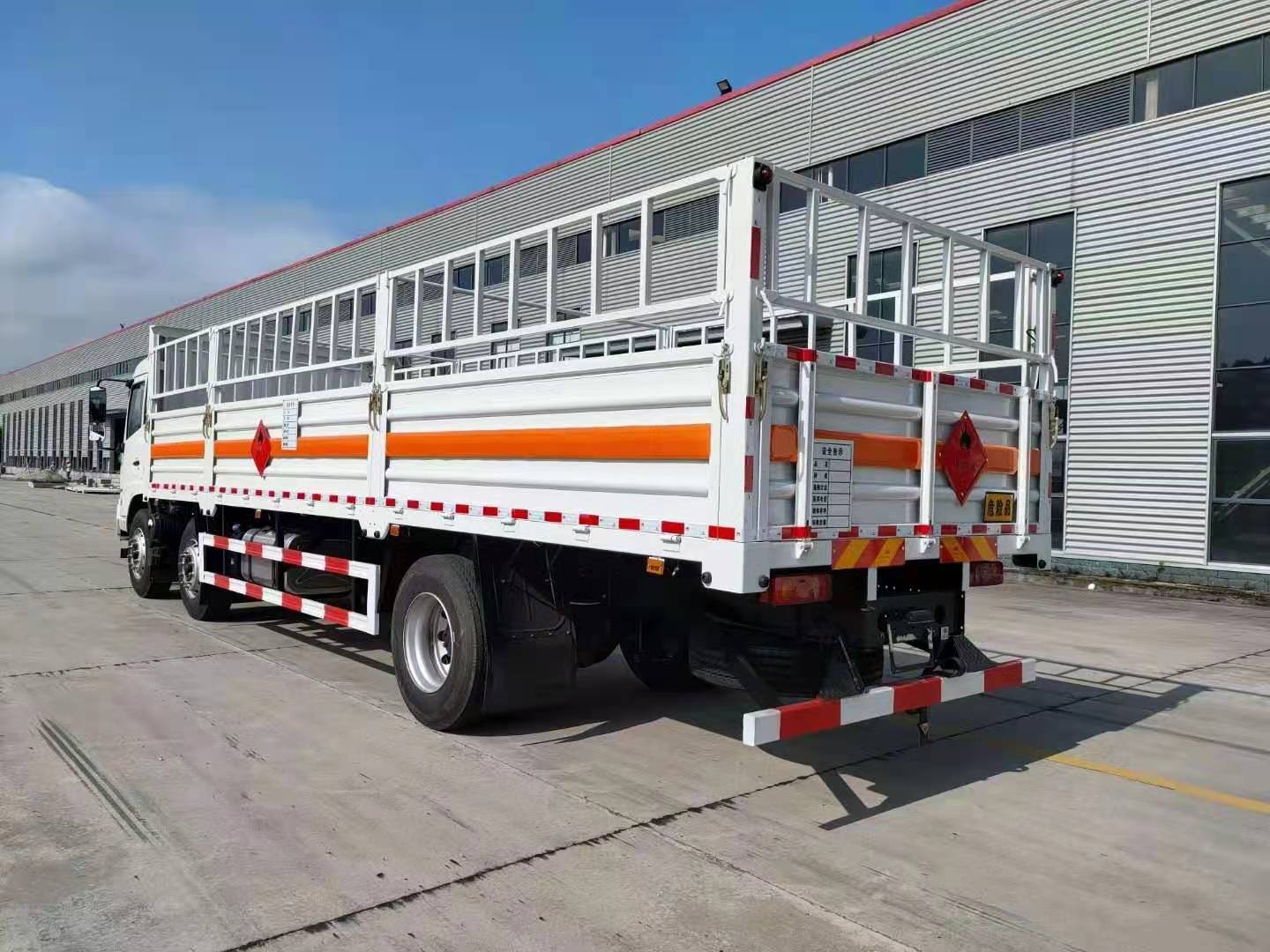 東風天錦三軸國六氣瓶運輸車廂體嚴格按照公告尺寸制作,箱體采用廂式欄板車結構,外厚度為1.1毫米厚度武鋼冷軋鋼板(或沖壓成瓦楞板,以公告為準),內加強“幾”字型加強梁,車體底板加強處理并做防靜電處理。車體的左側、右側,和后欄板栓鉤結構,可向下打開,方便上下貨物,車體為空曠式車型,大大減少了運輸物品因為狹窄空和強烈碰撞產生氣瓶爆炸的危險性,箱體外觀涂裝白色油漆,在欄板的中間位置粘貼橙色的危化車標帶,并在車體的左、右、后部粘貼“易燃氣體”或“不燃氣體”標識。駕駛室內部配備兩只滅火器,后保險杠處安裝防追尾事故的緩沖固定塊。此款車輛屬于國家規定的危險品二類倉欄式運輸車。廂體內部有固定貨物的臥環,車輛外部有靜電帶、滅火器、防火罩,車廂內安裝煙霧報警器和門防盜報警器,嚴格按照國家危險品相關法規張貼。