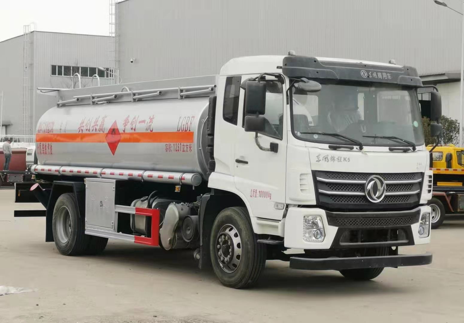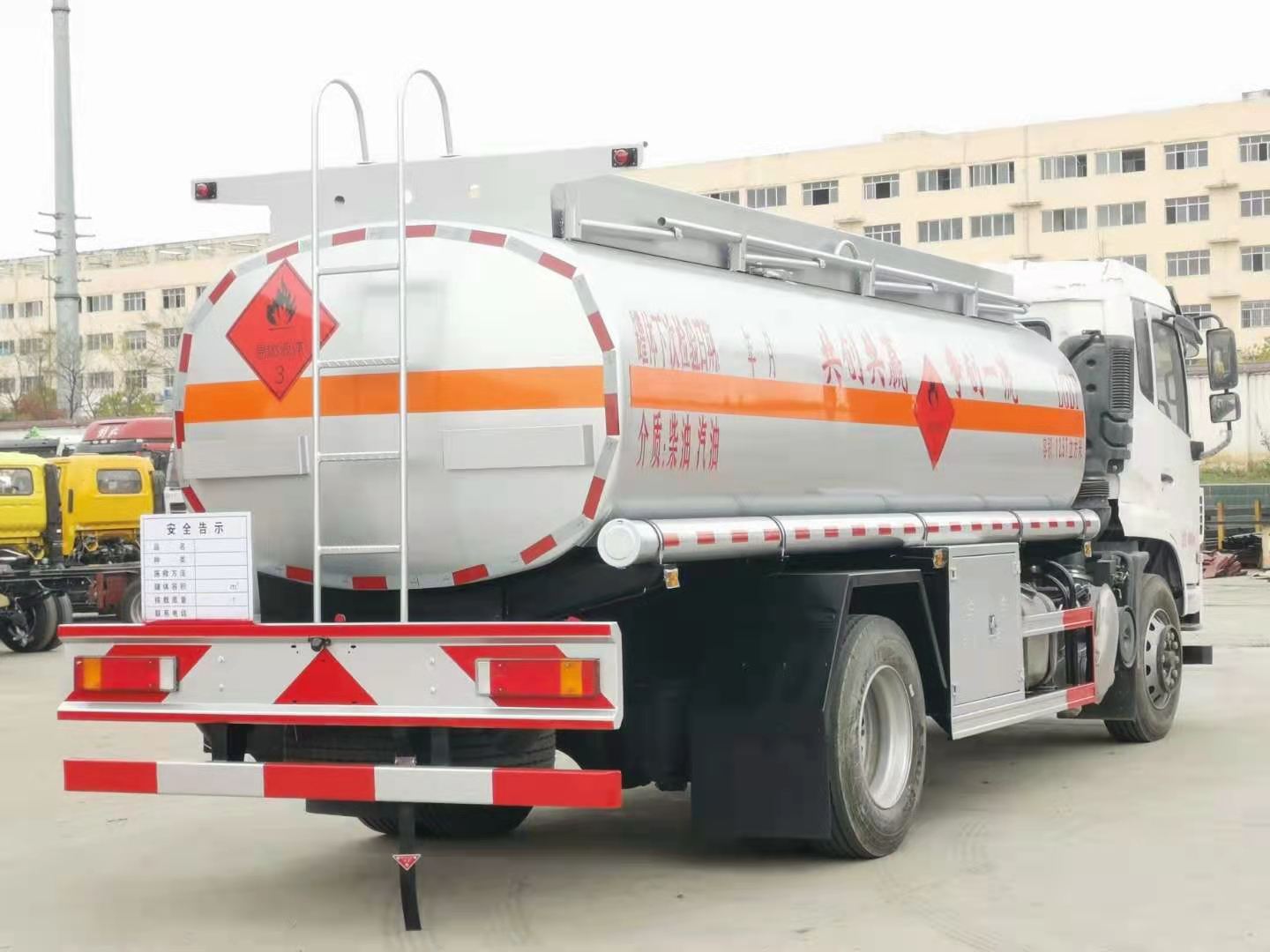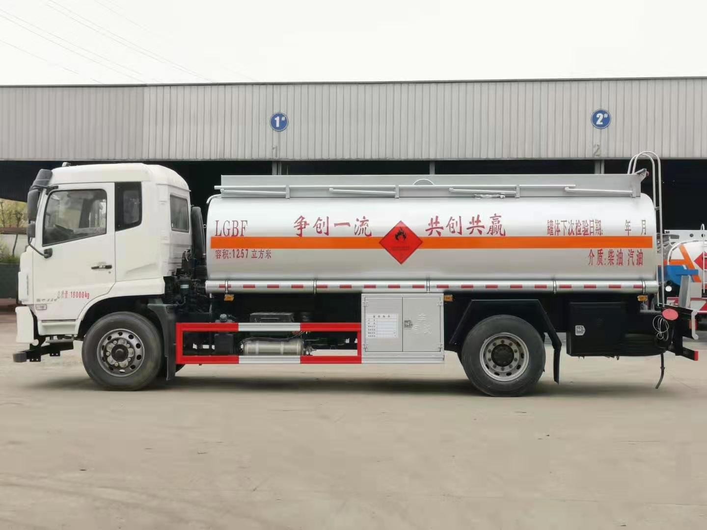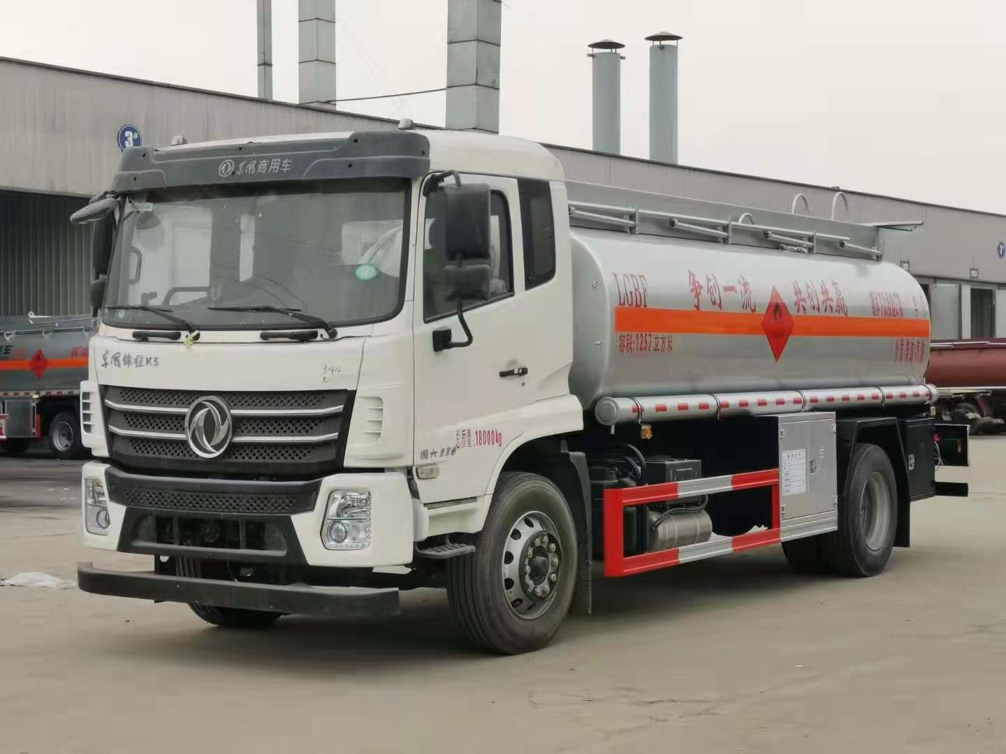 國六東風錦程K5全法規加油車標配前下防護,排氣管前置,限速80kw/h,四通道ABS,安全帶未系提醒裝置,制動襯片磨損提醒裝置,前輪防爆胎應急安全裝置。標配符合JT/T 1285-2020標準的新法規項:前向碰撞預警,車道偏離預警,EBS電控制動系統,胎壓監測系統。罐體公告容積12.57立方米;單倉帶泵,罐體采用Q235碳鋼板制作,厚度5(mm),內置防浪板,前后水壓封頭;全套歐標包含:罐體頂部2個鋁合金歐標罐口,底部1個氣動緊急切斷閥;1套歐標下裝油及油氣回收系統,1套防溢流系統;安裝氣動緊急切斷閥;頂部上圍板內置式上走道帶防滑網,兩側安裝活動護欄,尾部安裝爬梯一個;泵進泵出口及下裝油口安裝在車身一側閥門箱內,兩根鐵制管道筒配透明輸油膠管2根;安全告示牌一個,安裝靜電拖地帶,靜電接地線,配備滅火器2支;罐體銀灰色油漆,中部粘貼橙色反光帶,粘貼“易燃液體”標識及紅白反光條,安裝LED示廓燈;選裝車載加油機。