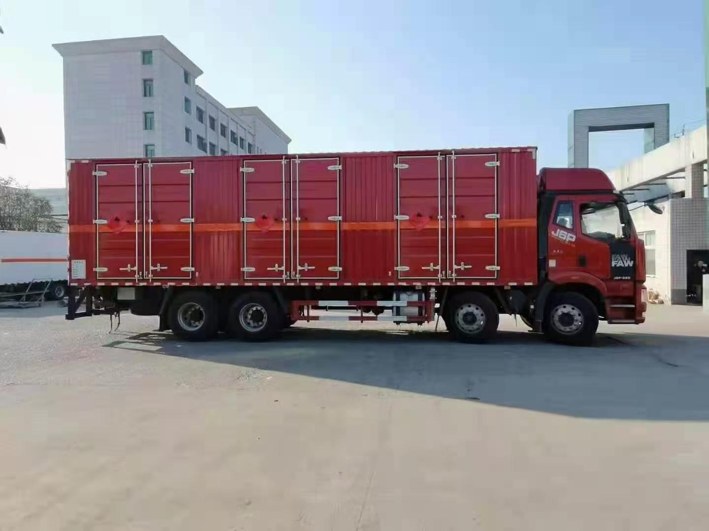 解放國六9米5易燃液體廂式運輸車可選擇開四個側門,讓您貨物裝卸更方便!根據客戶要求定制車型,讓您使用更貼近需求!