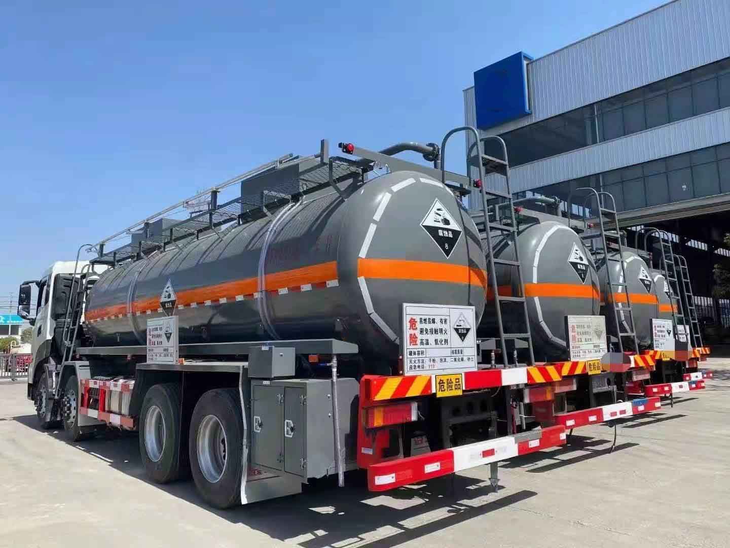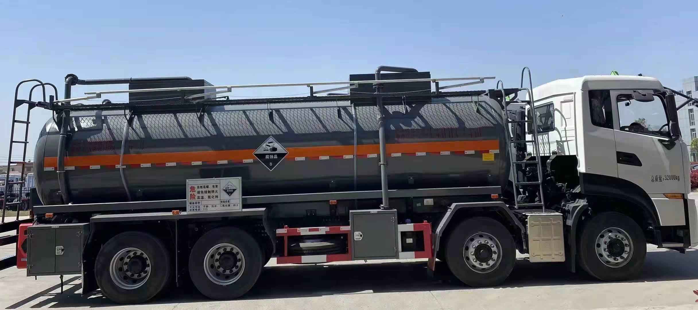東風天龍腐蝕品罐式運輸車底盤采用東風天龍DFH1320D2(國六前四后八危化底盤);白色高頂雙臥駕駛室,DDi75E350-60發動機;九檔變速箱型號9JS135TA,檔位速比(高/低)11.02/0.73,5.5噸前橋,10噸后橋,295/80R22.5 18PR輪胎,前橋為盤式車軸,后橋為氣囊式,氣囊主座椅,350L鋁合金油箱。EBS,胎壓監測,車道偏離及前碰撞預警。罐體及整車尺寸嚴格按公告制作,整車型號:HLW5320GFWD6,公告容積:18.9立方,外罐體材料為Q235B型碳鋼板材,筒體4mm,封頭5mm,罐體通倉,蝶形封頭,內襯聚乙稀塑厚度16mm,兩道鋼塑式防浪板,兩個全塑罐口帶接酸盤,罐體底部帶一套DN100型不銹鋼襯四氟緊急切斷閥(帶聲光報警裝置),副梁前高后低,4寸襯塑管道,尾部大梁下左右邊各一個DN80型襯氟球閥出口為出料口并帶保護箱。罐體頂部帶上圍板,圍板內做重瀝青防腐,帶不銹鋼升降護欄,尾部爬梯,兩根卸料管帶PVC炮筒管,兩個8KG滅火器,一個工具箱,其余按廠家標配生產制作。