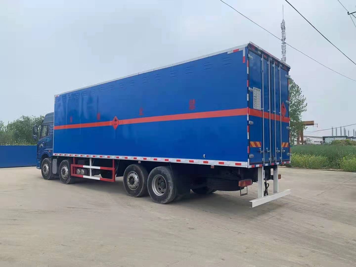 解放悍V前四后六危險品車廂體嚴格按照公告尺寸制作,外板采用1mm厚冷軋板有一次性成型的百葉窗,內飾為導電性能良好的鋁板有透氣孔,內襯為矩形管骨架牢靠穩定,內部填充為透氣防潮阻燃的擠塑板,四種材料經現代工藝復合而成,廂體外部上下鋁合金型材包邊,底板和車廂前下部鋪橡膠皮,后門雙開,右側中部單開門,內部有固定貨物的臥環,車輛外部有靜電帶、滅火器、防火罩,車廂內安裝煙霧報警器和門防盜報警器,嚴格按照國家危險品相關法規張貼。