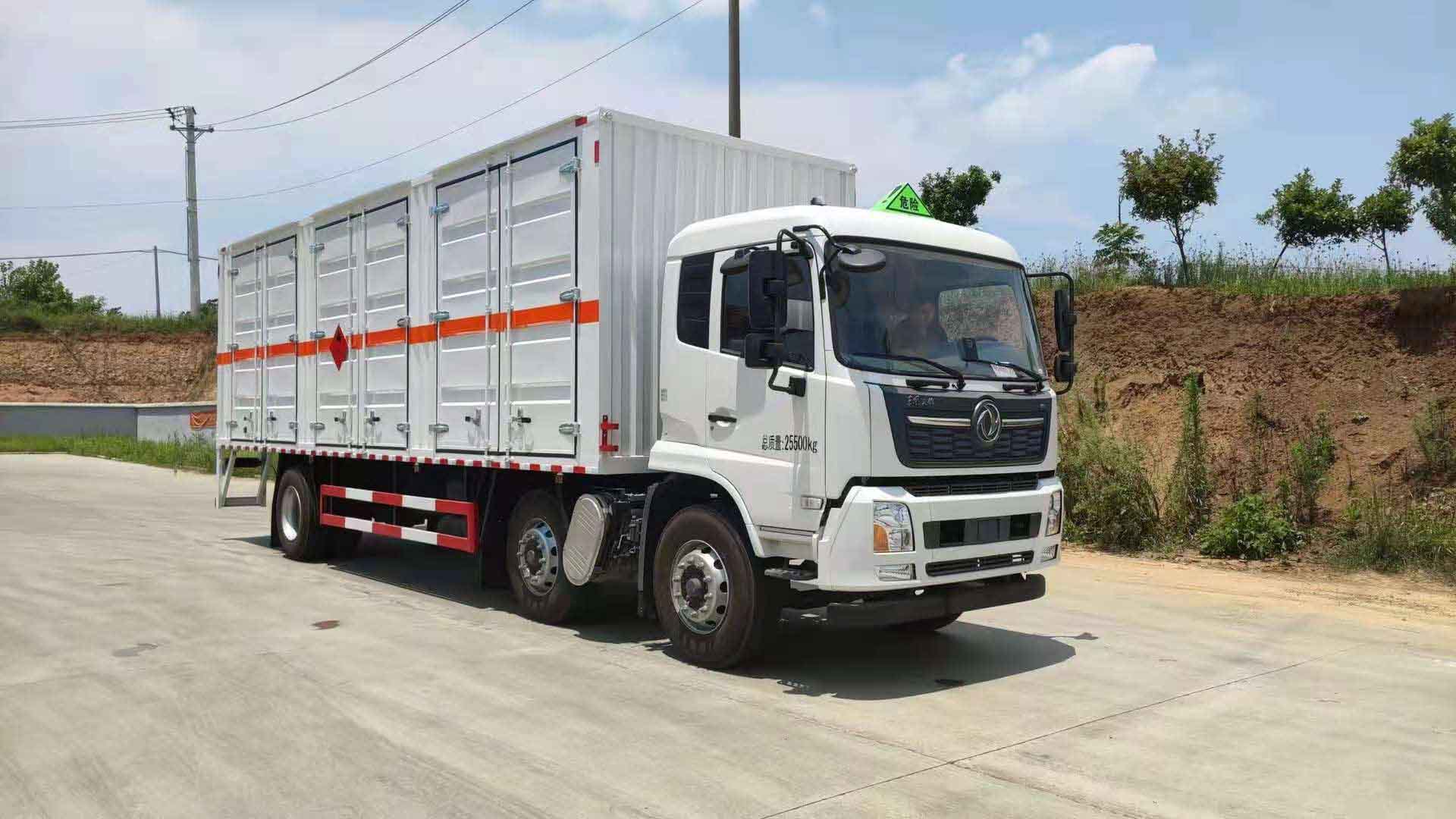 東風天錦三軸帶三開側門瓦楞板危險品車廂體為瓦楞板,內襯為矩形管骨架牢靠穩定,廂體外部上下鋁合金型材包邊,底板和車廂前下部鋪橡膠皮,后門雙開,右側為三個雙開門,內部有固定貨物的臥環,車輛外部有靜電帶、滅火器、防火罩,車廂內安裝煙霧報警器和門防盜報警器,嚴格按照國家危險品相關法規張貼。廂體外帶透氣孔,加裝液壓尾板不超重。
