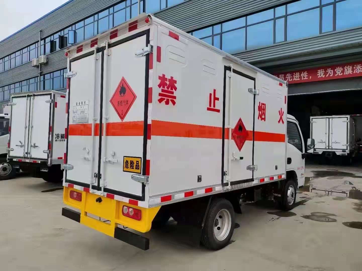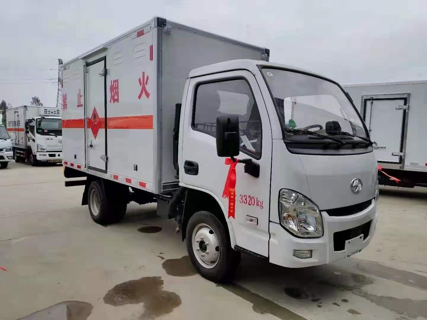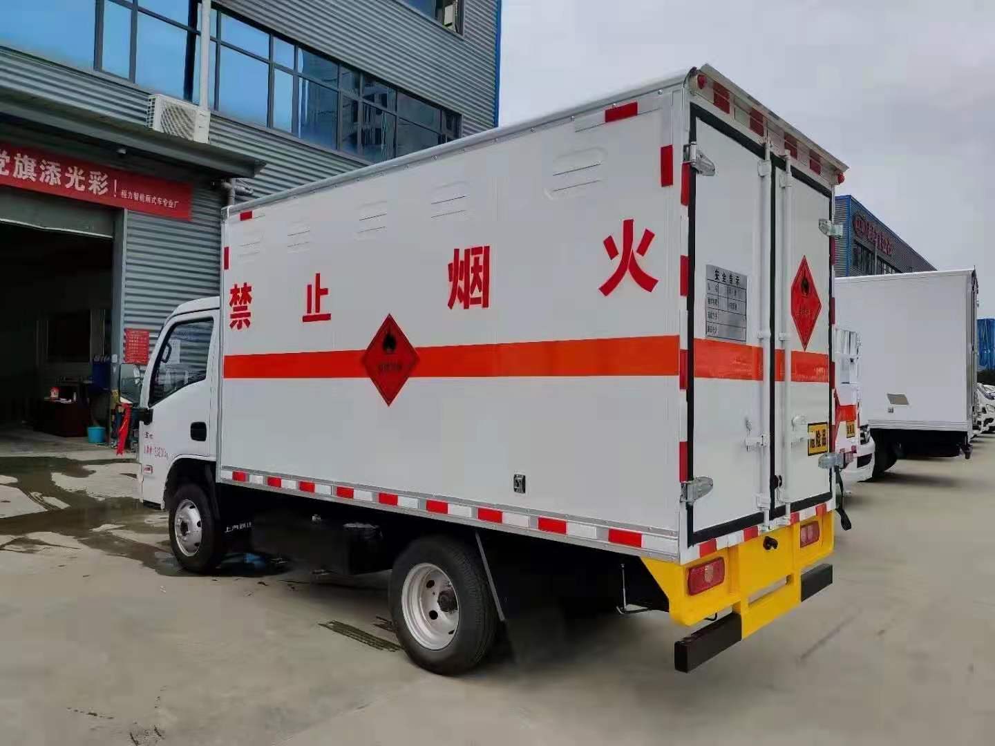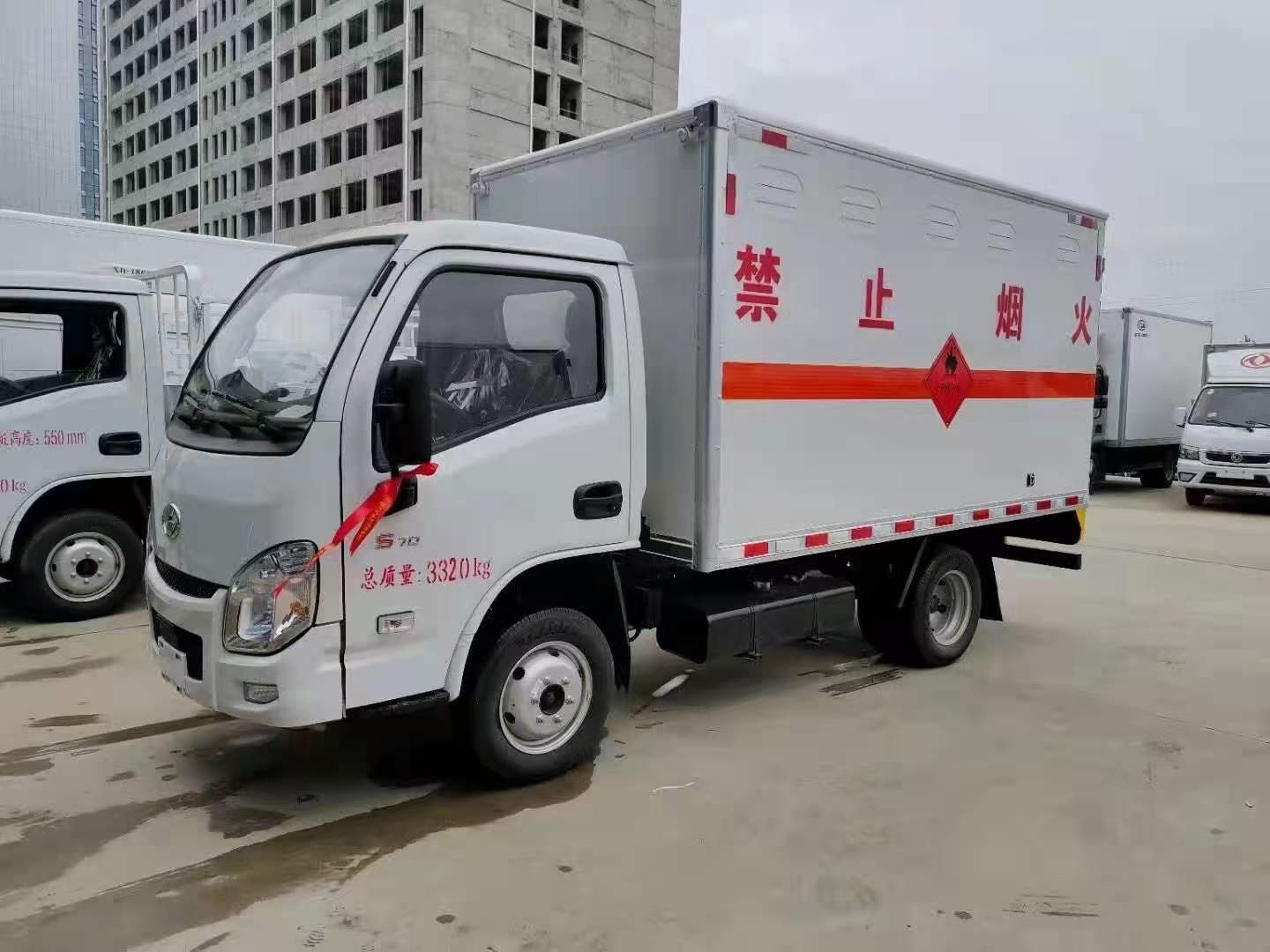 躍進(jìn)S70危險(xiǎn)品廂式車整車型號(hào):CLW5030YRQSH6,底盤型號(hào):SH1033PEGCNZ2。廂體尺寸:3300*1675*1700mm,采用S70單排駕駛室,國(guó)六柳機(jī)113馬力,5檔變速器,185R15后雙胎,方向助力,空調(diào),3t后橋,3/4+5雙層板簧,油剎,前盤制動(dòng),ABS、限速80,前置排氣管,2650軸距,帶新規(guī)道路偏離預(yù)警,防碰撞預(yù)警。危險(xiǎn)品廂式上裝配置:優(yōu)質(zhì)鉅形鋼管骨架,1.5個(gè)厚外飾冷軋鋼板,內(nèi)飾優(yōu)質(zhì)鋁合金板,中間填充隔熱阻燃材料,鍍鋅五金件(選裝側(cè)門和隔倉),底板冷軋鋼板上鋪5MM厚靜電膠皮。廂體兩側(cè)上方設(shè)有防雨功能自然通風(fēng)窗口,底部鋪有阻燃導(dǎo)靜電膠板,廂體側(cè)面裝有固定拉環(huán),與捆綁帶使用捆綁貨物以避免移動(dòng)。在車廂內(nèi)頂部安裝感煙報(bào)警器,在門器框上方安裝有防盜報(bào)警器,廂體外側(cè)安裝示廓燈及滅火器支架,配置兩個(gè)滅火器,并有“嚴(yán)禁煙火”和“爆”等字樣,廂體周邊貼反光標(biāo)識(shí)。后門貼有安全告示,危險(xiǎn)品標(biāo)牌。車輛尾部安裝兩條拖地導(dǎo)靜電膠帶,駕駛室頂部裝有安全三角燈。廂體顏色有:黃、白、灰色等可選。