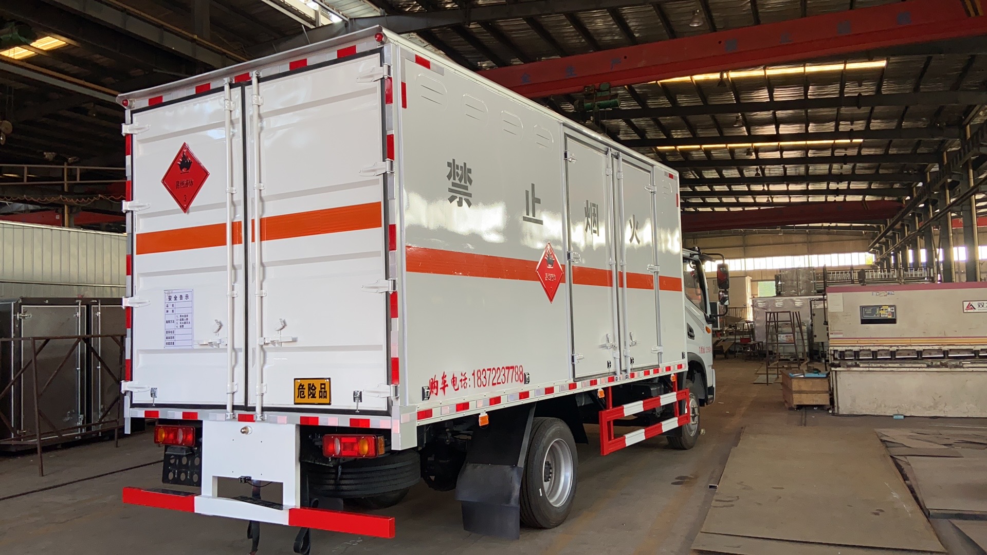 東風華神T3國六單開雙側門危險品車采用東風華神T3國六危險品車專用底盤,整車尺寸:7180x2500x2600mm,箱體內尺寸:5100x2350x2300mm,