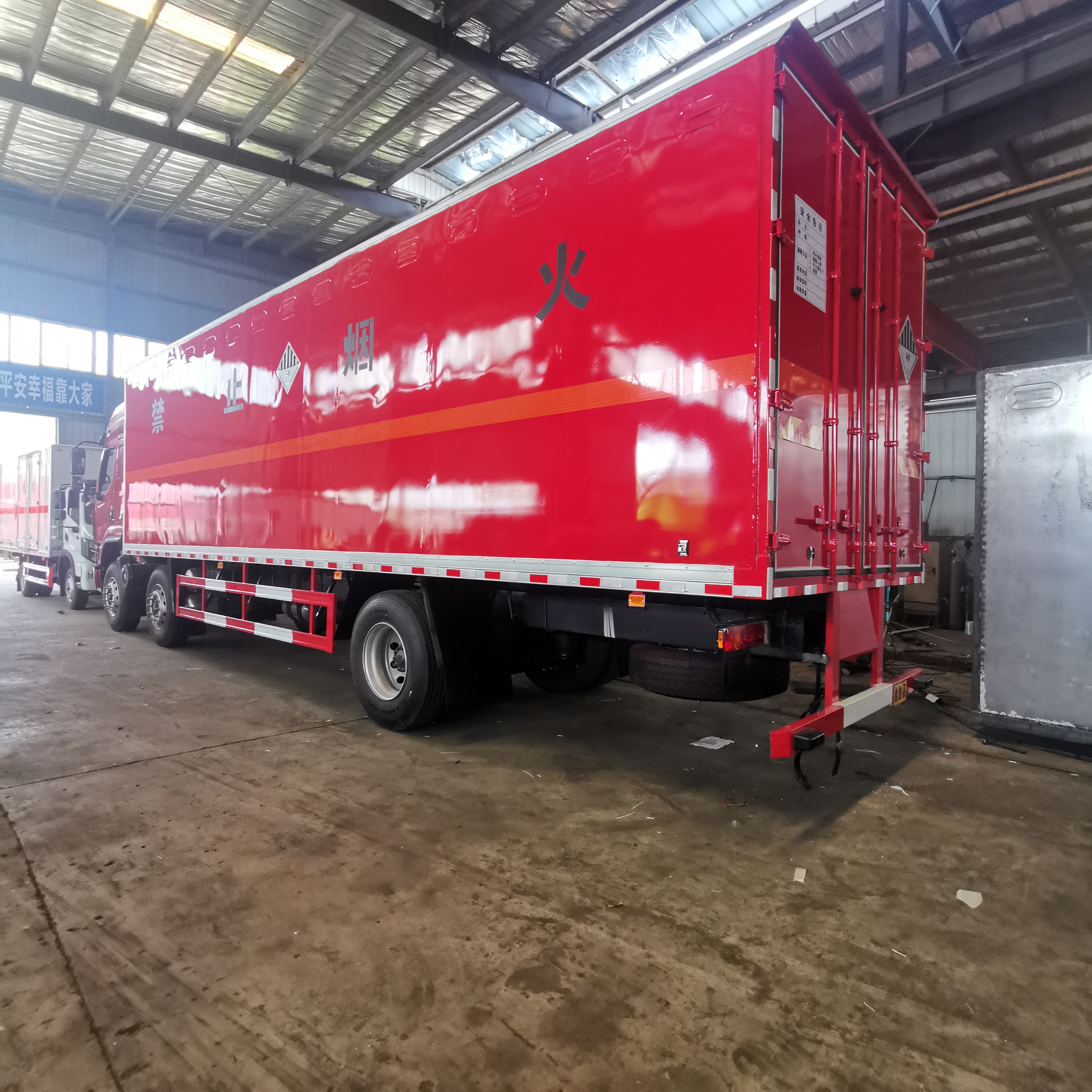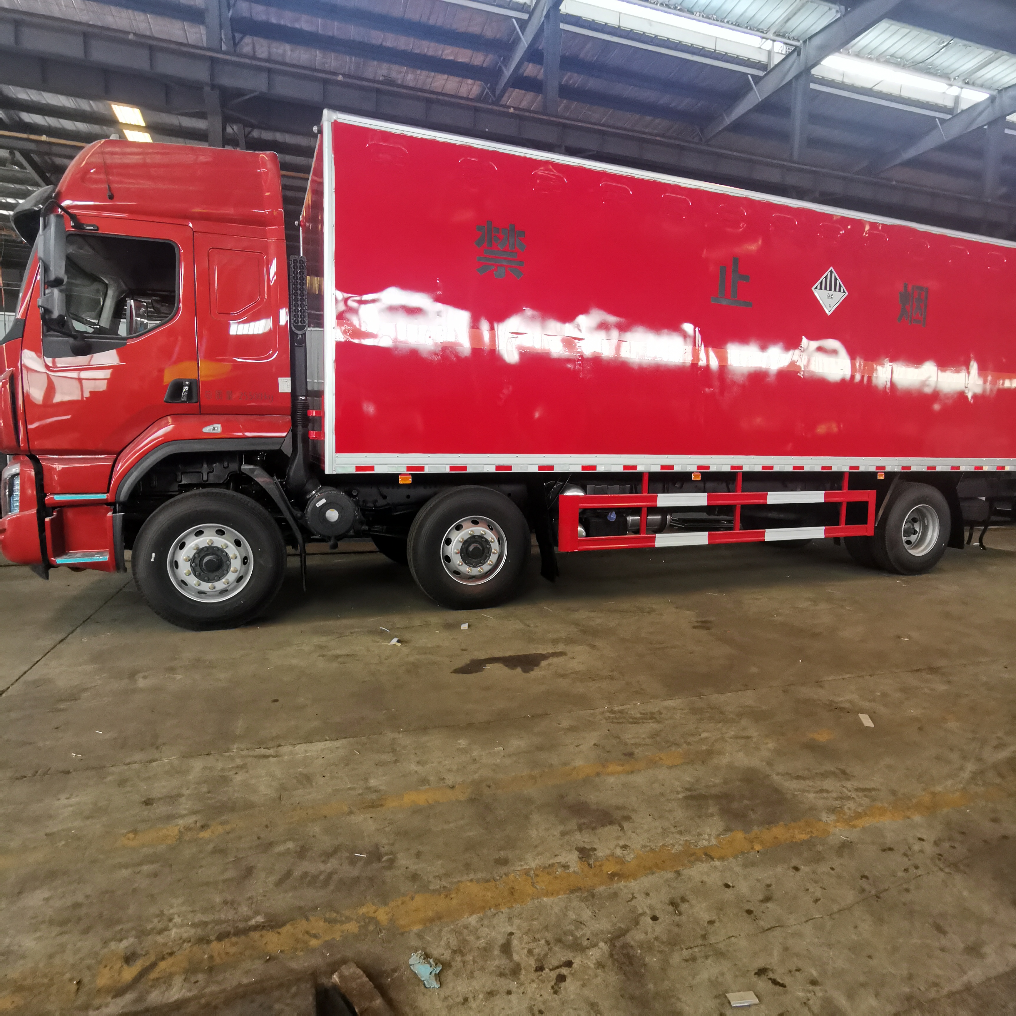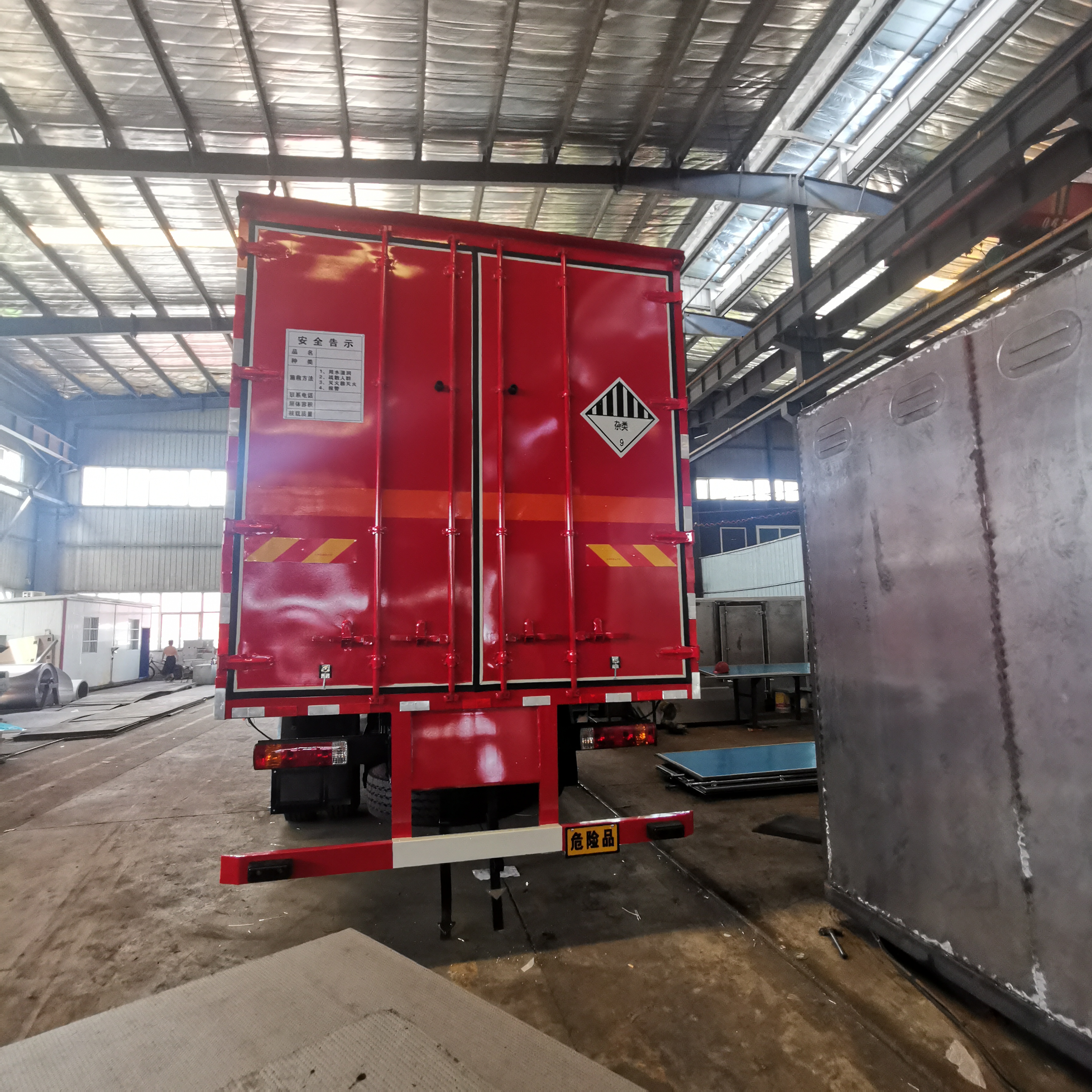 柳汽三軸國六帶雙側(cè)門危險品車整車尺寸:11980×2550×3680mm;廂體尺寸:9600×2420×2200mm,廂體嚴格按照公告尺寸制作,外板采用1mm厚冷軋板有一次性成型的百葉窗,內(nèi)飾為導(dǎo)電性能良好的鋁板有透氣孔,內(nèi)襯為矩形管骨架牢靠穩(wěn)定,內(nèi)部填充為透氣防潮阻燃的擠塑板,四種材料經(jīng)現(xiàn)代工藝復(fù)合而成,廂體外部上下鋁合金型材包邊,底板和車廂前下部鋪橡膠皮,后門雙開,右側(cè)兩個雙開門,內(nèi)部有固定貨物的臥環(huán),車輛外部有靜電帶、滅火器、防火罩,車廂內(nèi)安裝煙霧報警器和門防盜報警器,嚴格按照國家危險品相關(guān)法規(guī)張貼.