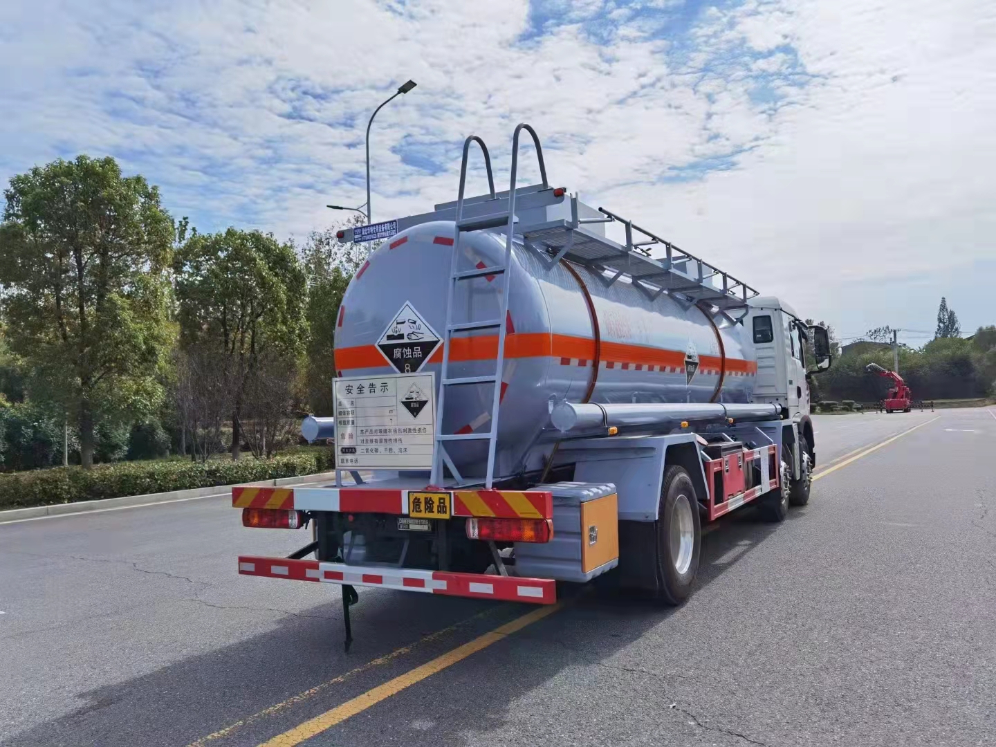 重汽豪沃6x2腐蝕性物品罐式運輸車公告已下發,公告容積14.5立方,有效容積13.86立方,襯塑厚度16-20mm,適用介質:硫酸、鹽酸、液堿、硝酸、次氯酸鈉,腐蝕性物品罐式運輸車:罐體及整車尺寸嚴格按公告制作,整車型號:HLW5180GFWEQ6,公告容積:9.69立方,外罐筒體材料4mm;罐體通倉,罐體內襯聚乙稀塑厚度16mm,一道鋼襯塑雙層防浪板,頂部一個全塑罐口帶接酸盤,罐口周圍帶方盒子式上圍板,圍板內做重瀝青防腐,罐體尾下部帶一個DN100型不銹鋼襯四氟海底閥(帶聲光報警裝置),副梁前高后低,罐體尾部左右各一個自流口,用DN80襯氟球閥控制,帶全塑保護箱,大梁下出料。罐體頂部右側帶護欄,走道,尾部爬梯,兩個滅火器,兩根卸料管,一個工具箱,其余按廠家標配。