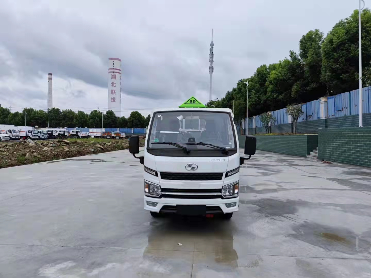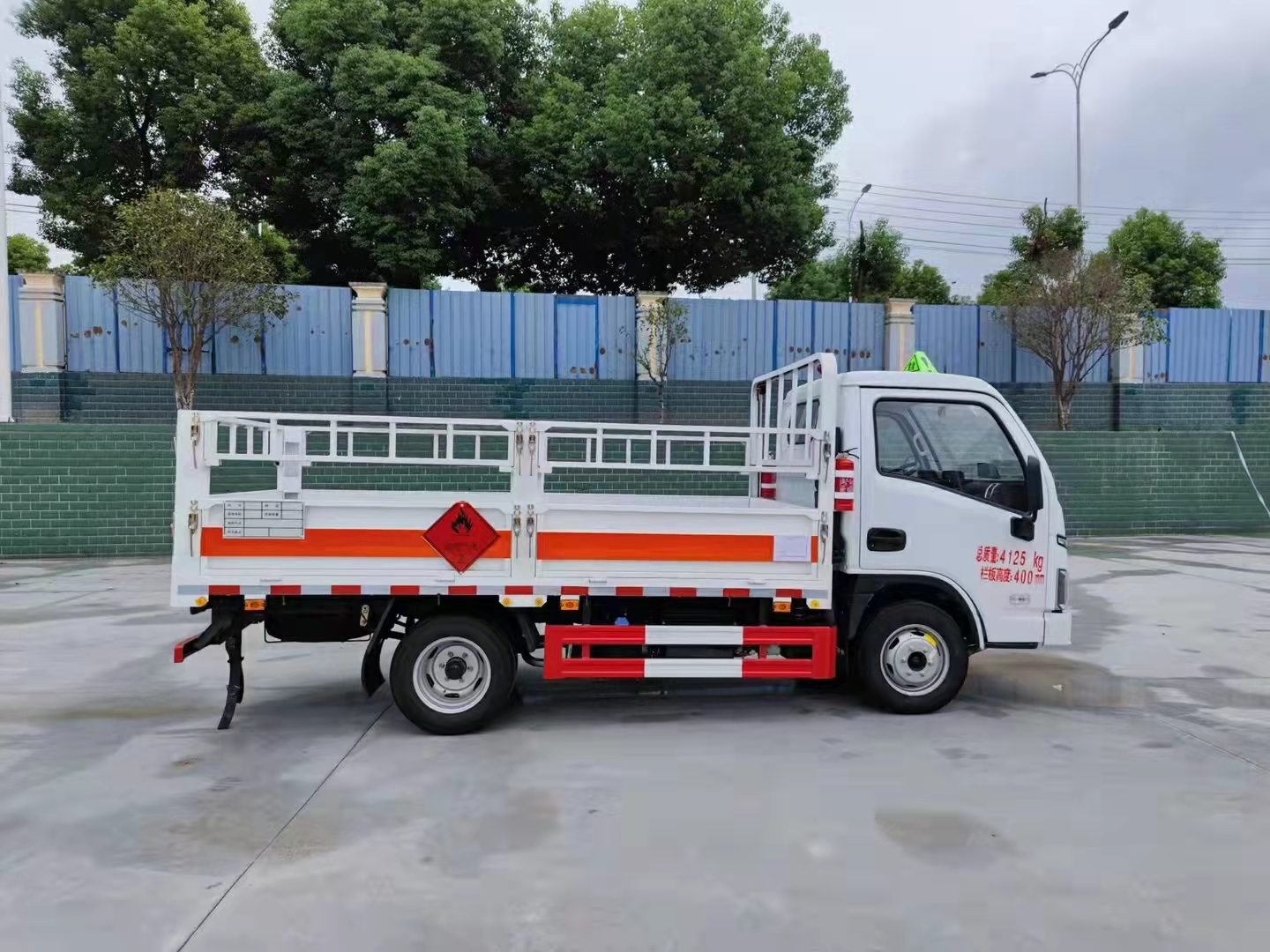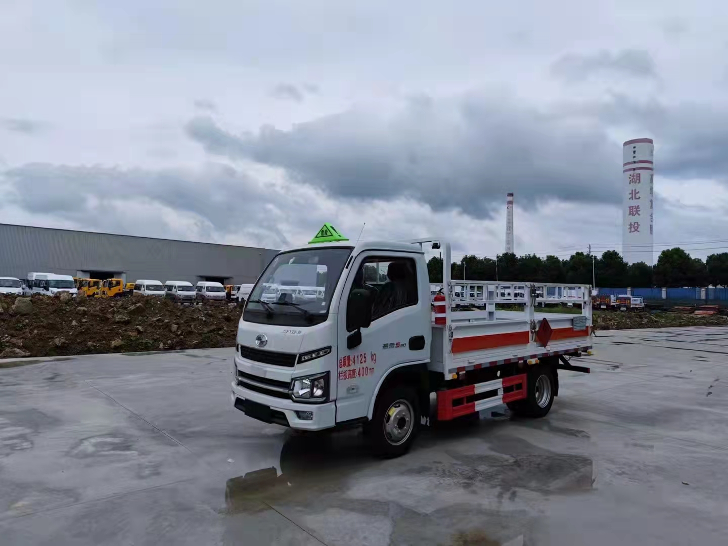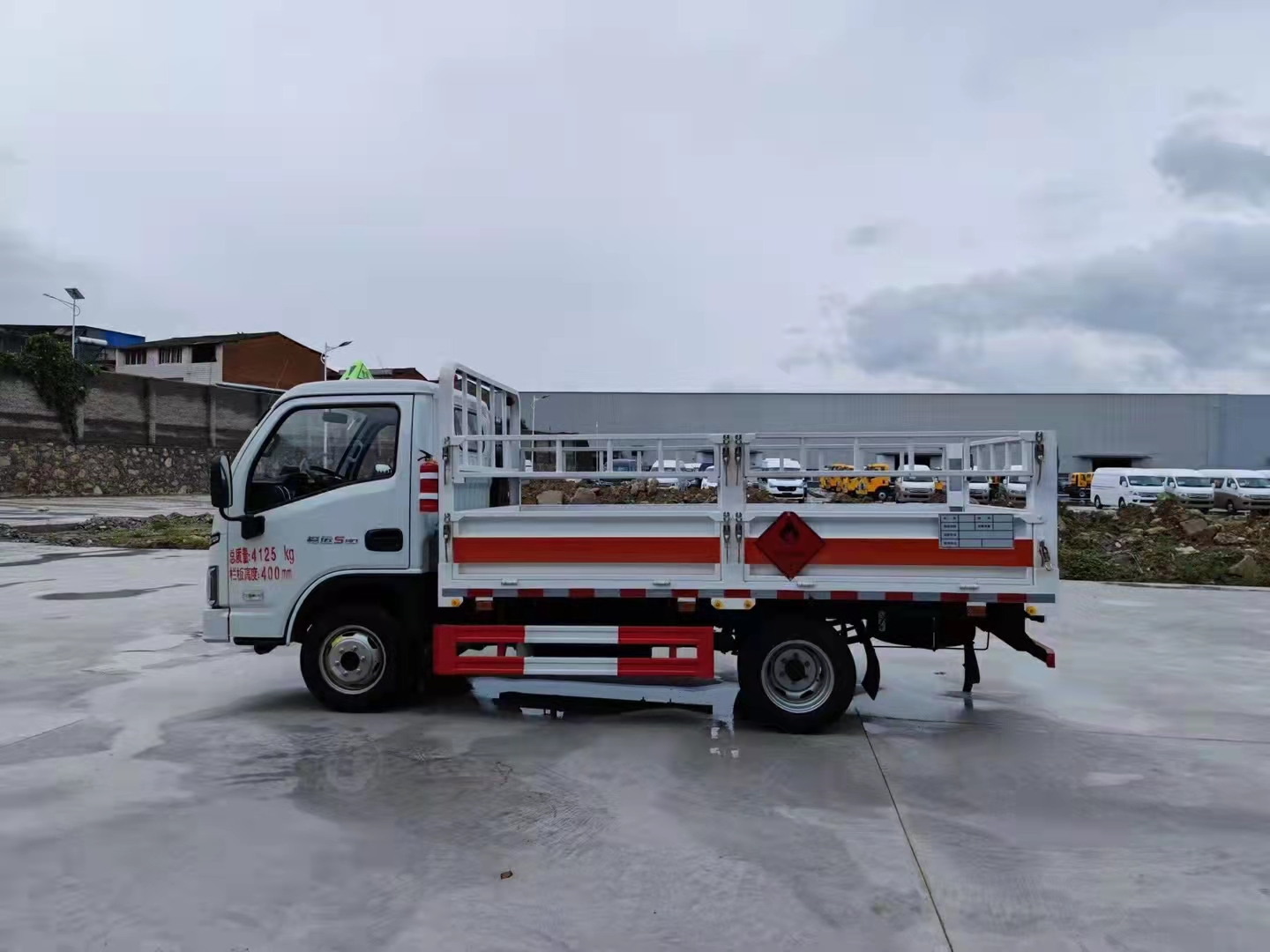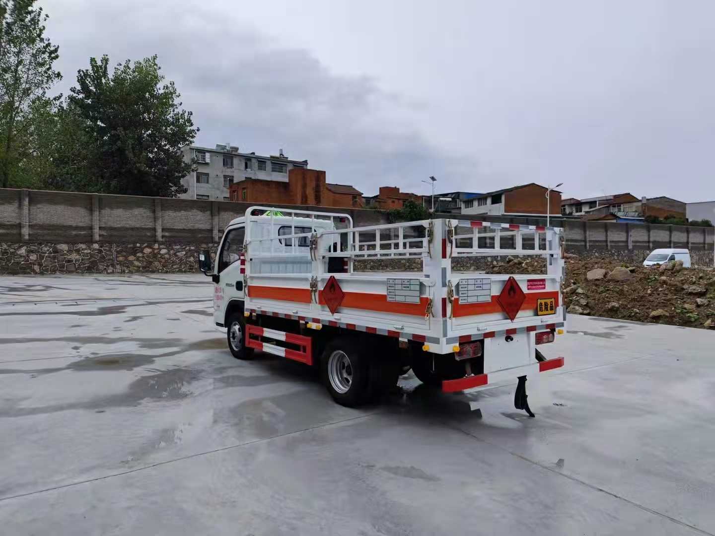 上汽躍進福運S80國六氣瓶運輸車底板采用花紋板,上鋪防靜電膠皮,廂體內左右邊板裝臥環,駕駛室頂部裝有危險品三角警示燈一個,滅火器2個,排氣管防火冒一個,廂體外按照國家危險品車輛相關要求張貼危險品標識和反光標識,車輛尾部裝靜電帶一條。