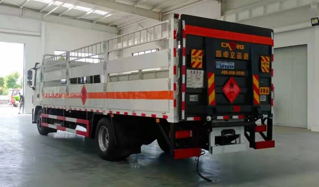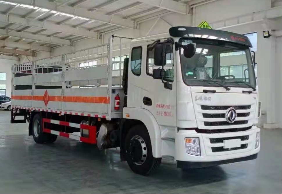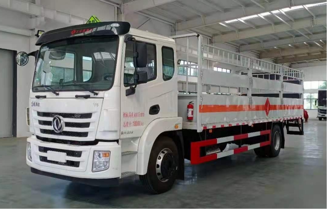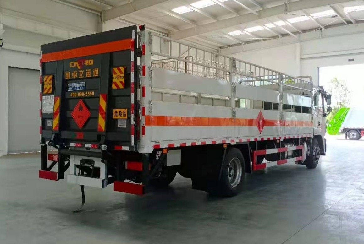 東風錦程7米6國六氣瓶運輸車箱體嚴格按照公告尺寸及外觀制作,軸距與車箱長度一一對應,當軸距為4700mm時箱體尺寸為(長×寬×高):6400×2450×600(mm);當軸距為5000mm時箱體尺寸為(長×寬×高):6800×2450×600(mm);當軸距為5800mm時箱體尺寸為(長×寬×高):7650×2450×600(mm);車箱兩側各設高度為600(mm)的邊板3塊,后部一塊,邊板內襯矩形管骨架,牢固穩定,下翻開門,采用1.2mm冷軋板焊接成型,每側兩個立柱,邊板上部安裝活動高欄,側開門可拆卸;底板為3~4mm花紋板,并鋪設有防靜電膠皮;安裝靜電拖地帶,滅火器,防火帽;貼橙色反光帶,紅白反光板,粘貼菱形2類危險品標示,安全告示牌。