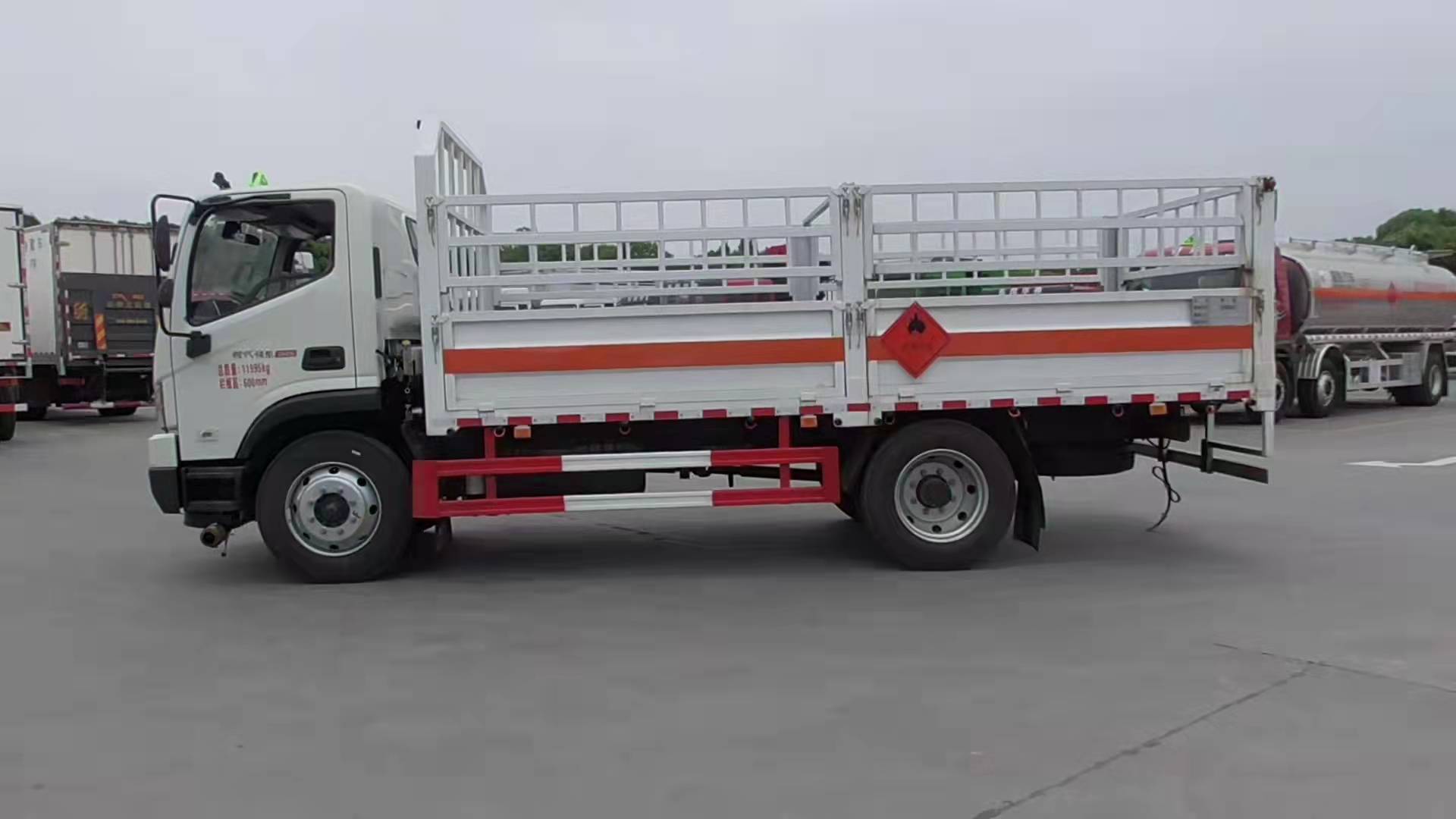 福田瑞沃5.2米國六黃牌氣瓶運(yùn)輸車采用福田危險(xiǎn)品車底盤,馬力大,采用濰柴190馬力發(fā)動機(jī),輪胎9R22.5。整車型號:HCQ5124TQPBJ6-01型氣瓶運(yùn)輸車。采用3800mm軸距,福田時代瑞沃ES寬體駕駛室,濰柴190馬力發(fā)動機(jī),6檔變速箱,8噸后橋,9R22.5輪胎,斷氣剎,中控鎖,電動門窗,空調(diào),帶前碰撞預(yù)警,軌道偏移預(yù)警。整車尺寸:7250×2350×3060mm,廂體尺寸:5180×2200×600mm。嚴(yán)格按照公告尺寸制作,邊2底3材質(zhì),底板上鋪靜電膠皮,側(cè)板上帶可卸式高欄,配備滅火器,三角頂燈,靜電拖帶等,嚴(yán)格按照國家危險(xiǎn)品法規(guī)進(jìn)行“易燃?xì)怏w”標(biāo)識粘貼等。