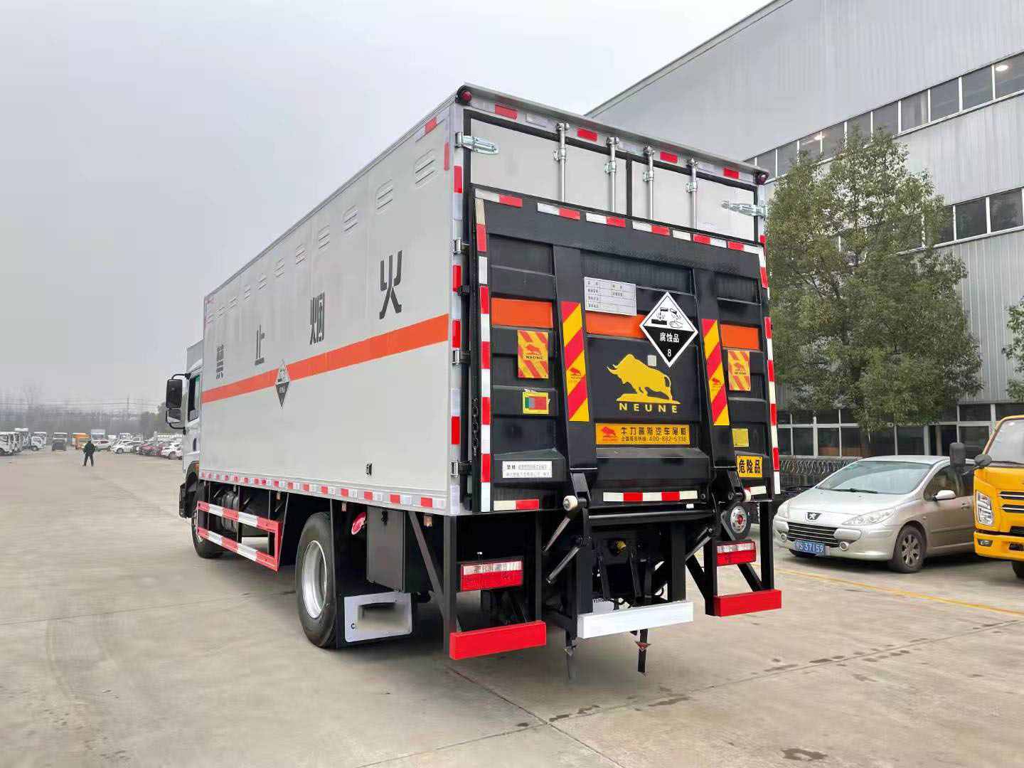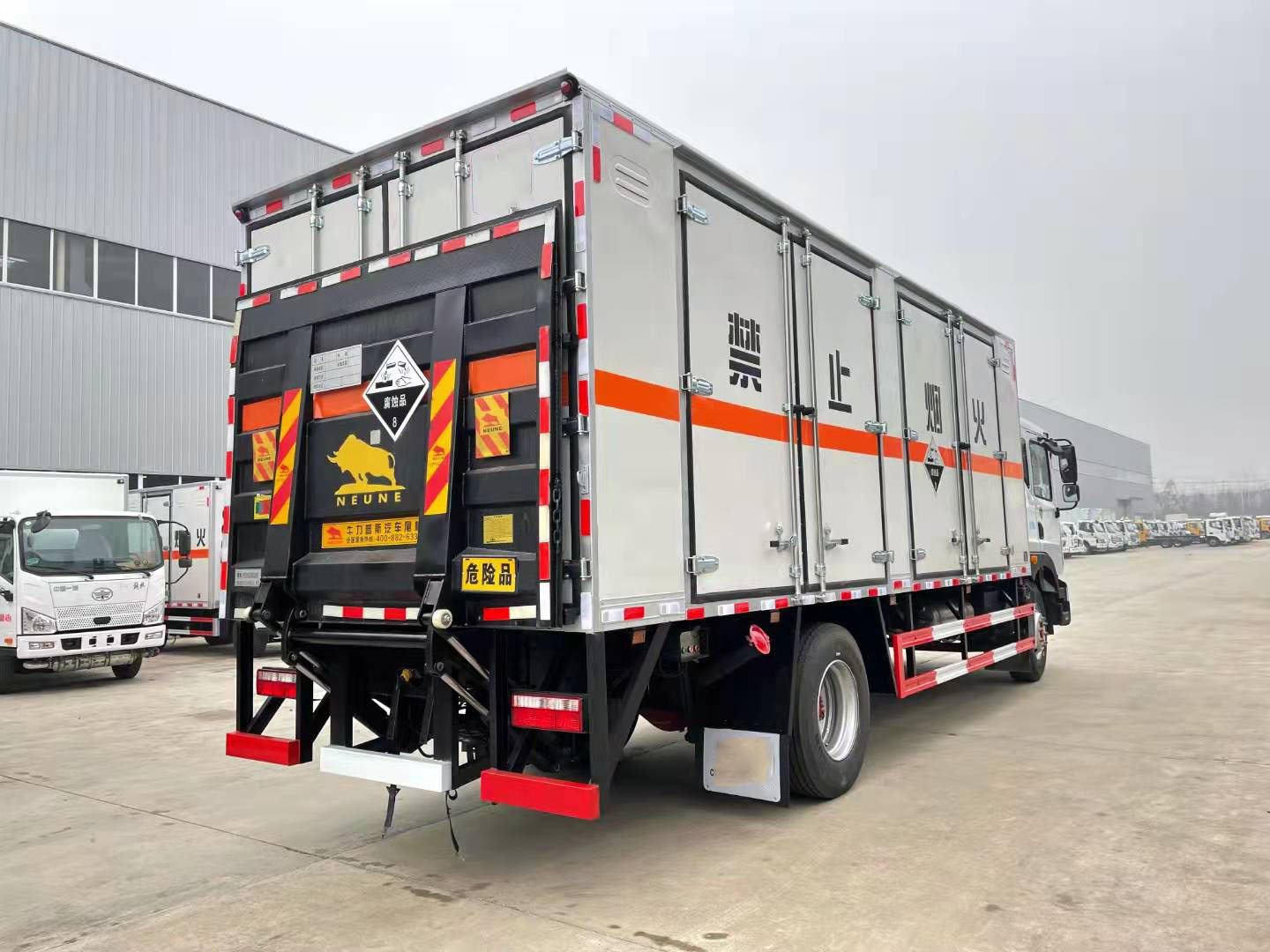 東風(fēng)D9國六帶雙側(cè)門腐蝕品廂式車復(fù)合板箱體嚴(yán)格按照公告尺寸制作。外板采用優(yōu)質(zhì)冷軋鋼板帶百葉窗,內(nèi)飾為導(dǎo)電性能良好的鋁平板有透氣孔,矩形骨架結(jié)構(gòu)內(nèi)部填充防潮阻燃擠朔板,復(fù)合加鉚合工藝。廂體四周鋁合金包邊及包角,車廂底板鋪設(shè)防靜電膠皮,廂體前臉50公分高鋪設(shè)防靜電膠皮。后部設(shè)置對開門,可選裝側(cè)門位置,廂體內(nèi)部兩側(cè)安裝捆綁貨物的臥環(huán)。廂體內(nèi)部安裝氣體感應(yīng)器及防盜報(bào)警器。車廂一周粘貼橙色放光帶,箱體粘貼 菱形告示牌,安全告示牌(不銹鋼材質(zhì)),危險(xiǎn)品牌,箱體安裝示廓燈(前白后紅),拖地靜電帶,等電位連接。箱體可選裝瓦楞板工藝,可選裝液壓升降尾板。