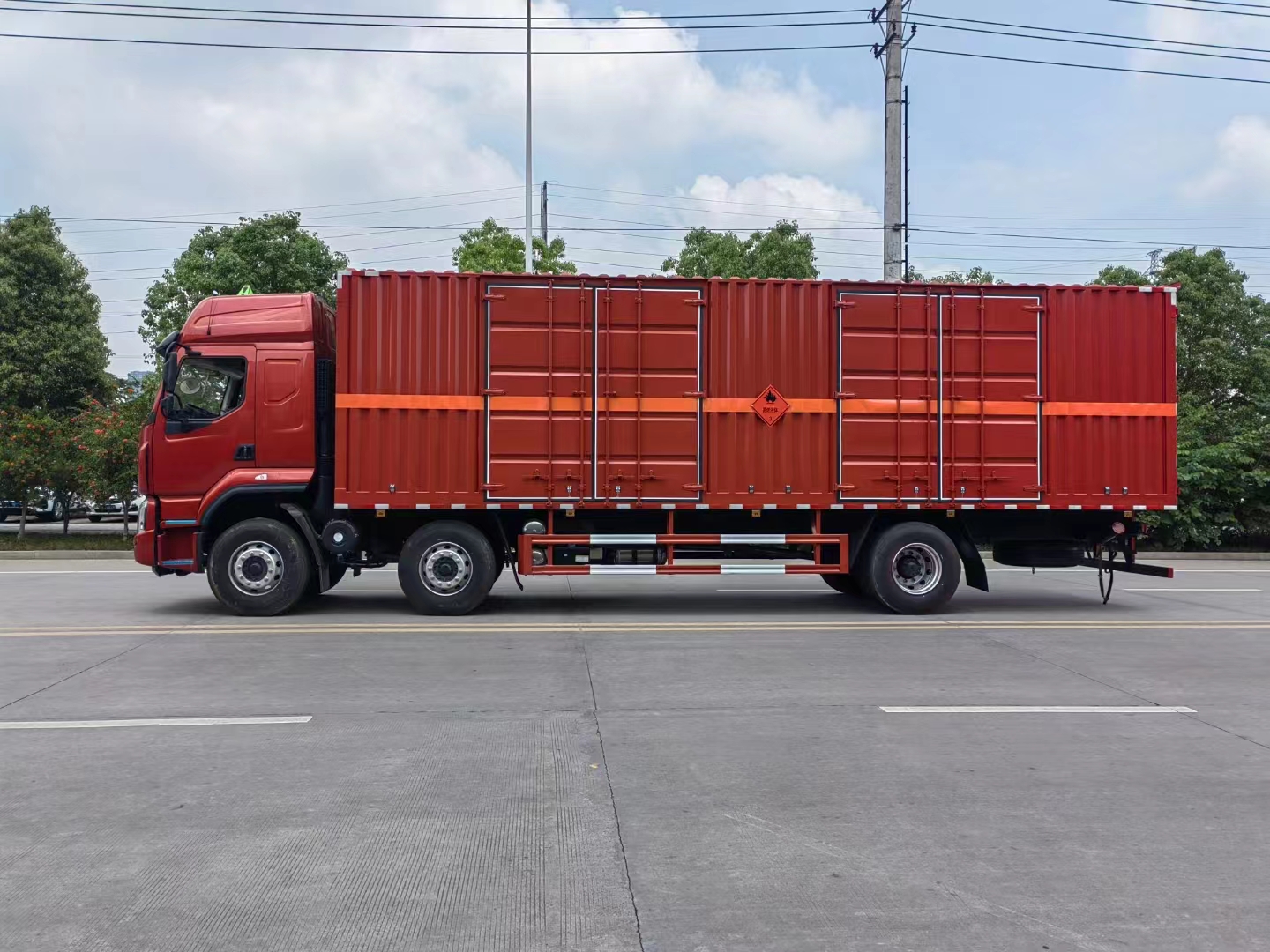 柳汽三軸國六帶雙開側門瓦楞板采用的是H5駕駛室,8JS105TA,Φ430離合,2*5.5T盤式前橋,后橋440/4.875/加寬制動器,板簧3/3/-,282(8)車架,400L(鋁)油箱,國產方向機,12R22.5,前機械后氣囊駕駛室懸置、電動液壓翻轉、夾層玻璃、電動玻璃升降器、針織帶調高氣囊司機座椅、電磁離合風扇、全新內飾、LCD液晶儀表、MP3+收音機、自動空調、定速巡航系統、國產閥、ABS、車載終端(行駛記錄儀+兼容北斗GPS)、外部遮陽罩、鋁合金貯氣筒、中控鎖、自動調整臂、多態開關、真皮多功能方向盤、右轉提示音響、前置排氣管、前輪防爆胎應急安全裝置、盤式前橋、排氣火花熄滅器、危險品運輸頂燈、ECU限速裝置(限速80km/h)、駕駛室電源總開關、導靜電橡膠拖地帶、ESC防側翻系統、AEBS、TPMS、LDWS、FCW、T-BOX。