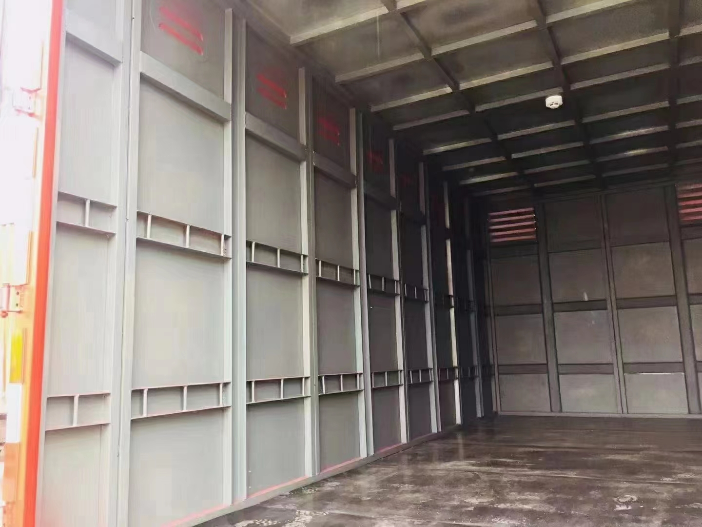 2:瓦楞板廂體,1.2毫米鐵板壓瓦成型,廂體四周邊梁為槽鋼。