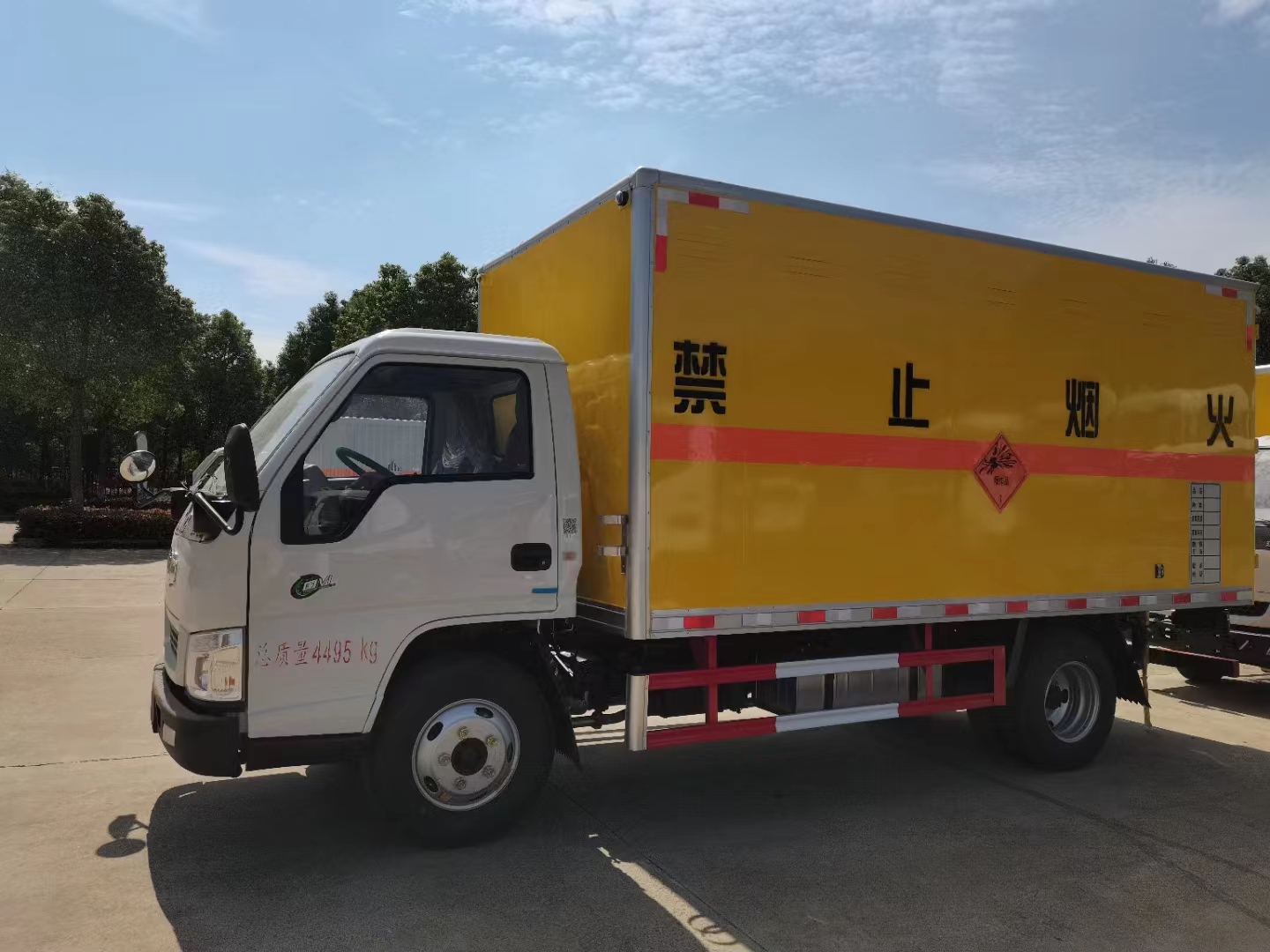 拉雷罐、炸薬、煙椛等物品都屬于一類危化品車,該類車型需要專用的車型,為了運輸方便,都選擇藍牌的車型,程力專汽為您推薦的是江鈴國六帶前開側門黃色危險品車,以下是詳細配置介紹: