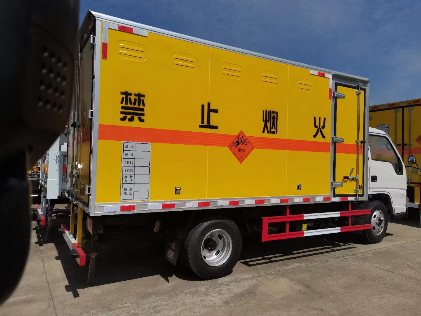 江鈴國六帶前開側門黃色危險品車采用的是江鈴危化品專用底盤,五十鈴122馬力發動機,帶中控鎖、電動門窗、原廠空調,為了讓車輛更耐用,我司生產的車輛全部采用的是烤漆板,箱體全部采用的是防阻燃材料,箱體內部全部采用的是固定臥環。