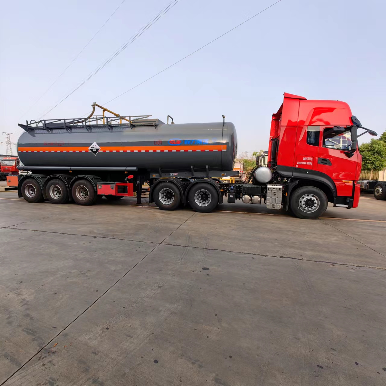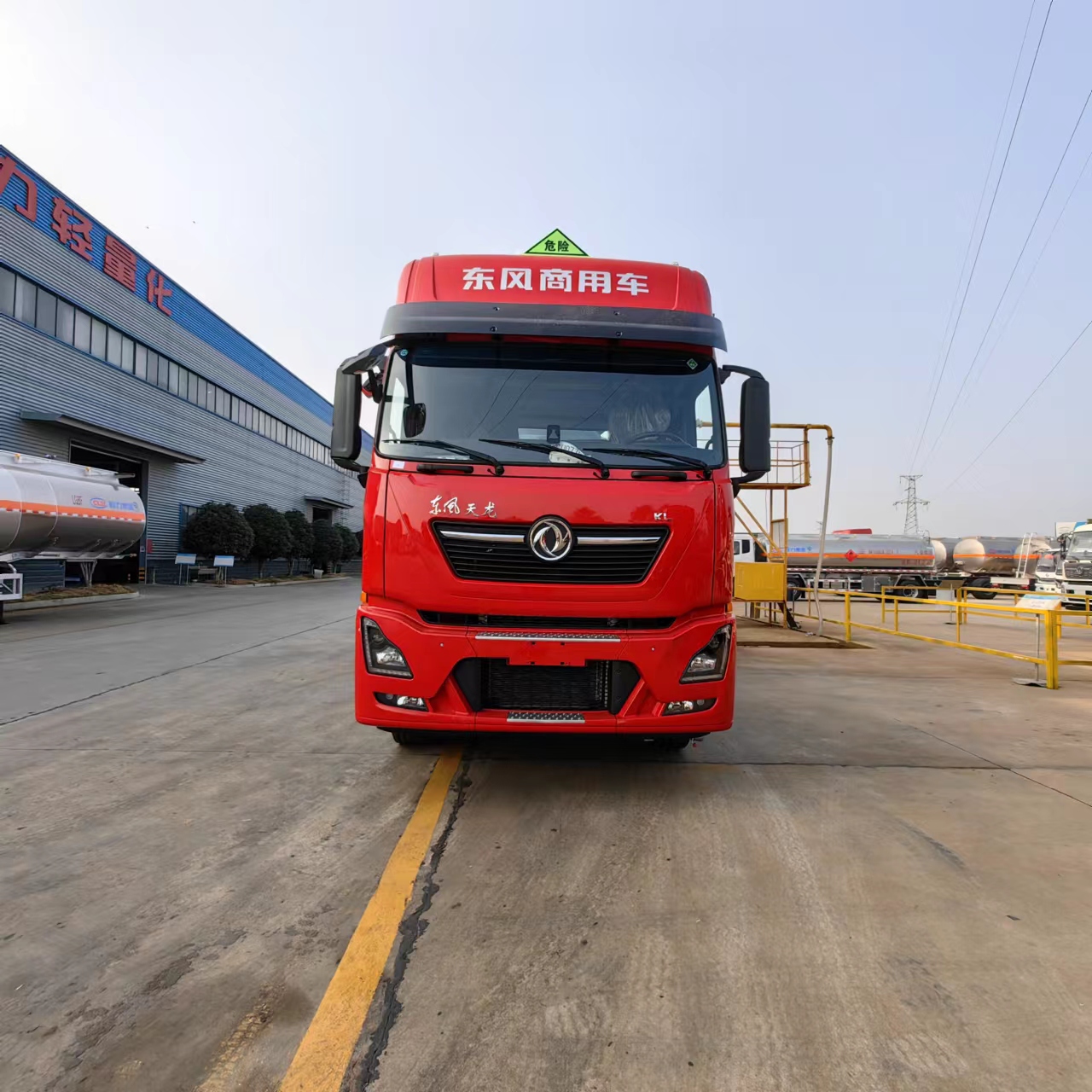 東風(fēng)天龍高頂雙臥半掛腐蝕品運(yùn)輸車采用的是10噸富華盤式車軸,帶空氣懸掛,兩軸EBS,塑料樣式防飛濺擋泥板, 12條12R22.5真空胎帶普通鋼圈,50#牽引銷,28噸聯(lián)動支腿,一個(gè)工具箱,一個(gè)備胎架,該車可出介質(zhì):鹽酸,液堿,硫酸,氨水