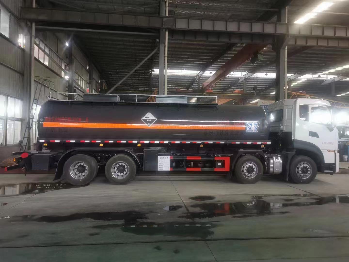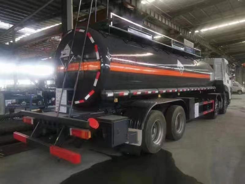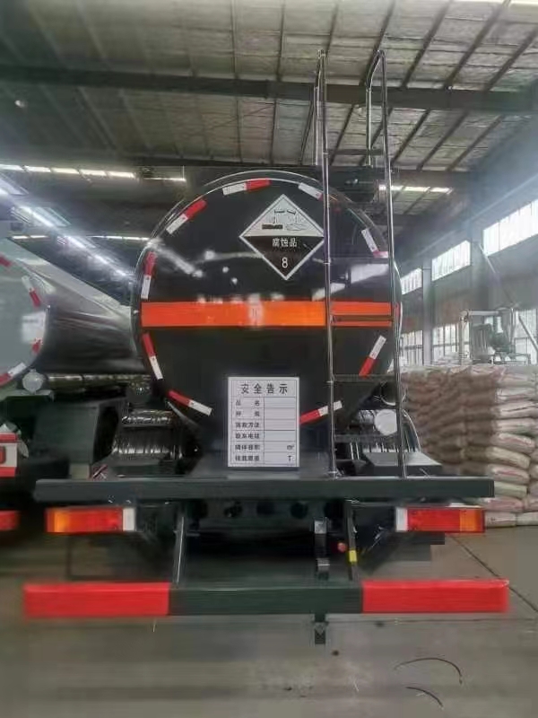 東風天龍前四后八國六平頂腐蝕品罐式運輸車作為扶手外罐體材質為Q235B型4.0mm厚板材,封頭4.5mm厚,罐體通倉,內襯聚乙烯塑,雙層鋼襯塑防浪板,叁個全塑罐口蓋,帶全塑接酸盤并用軟管引下,圍板內做重瀝青防腐,罐體頂部帶花紋板走道,罐體頂部左、右側帶不銹鋼固定護欄,罐體尾底部帶一個DN100襯氟蝶閥,罐體后尾部左右各一個DN80型全塑球閥為出料口帶外購全塑保護箱,大梁下出料,一個工具箱,尾部爬梯。兩根卸料管,兩個8KG滅火器,其余標配。