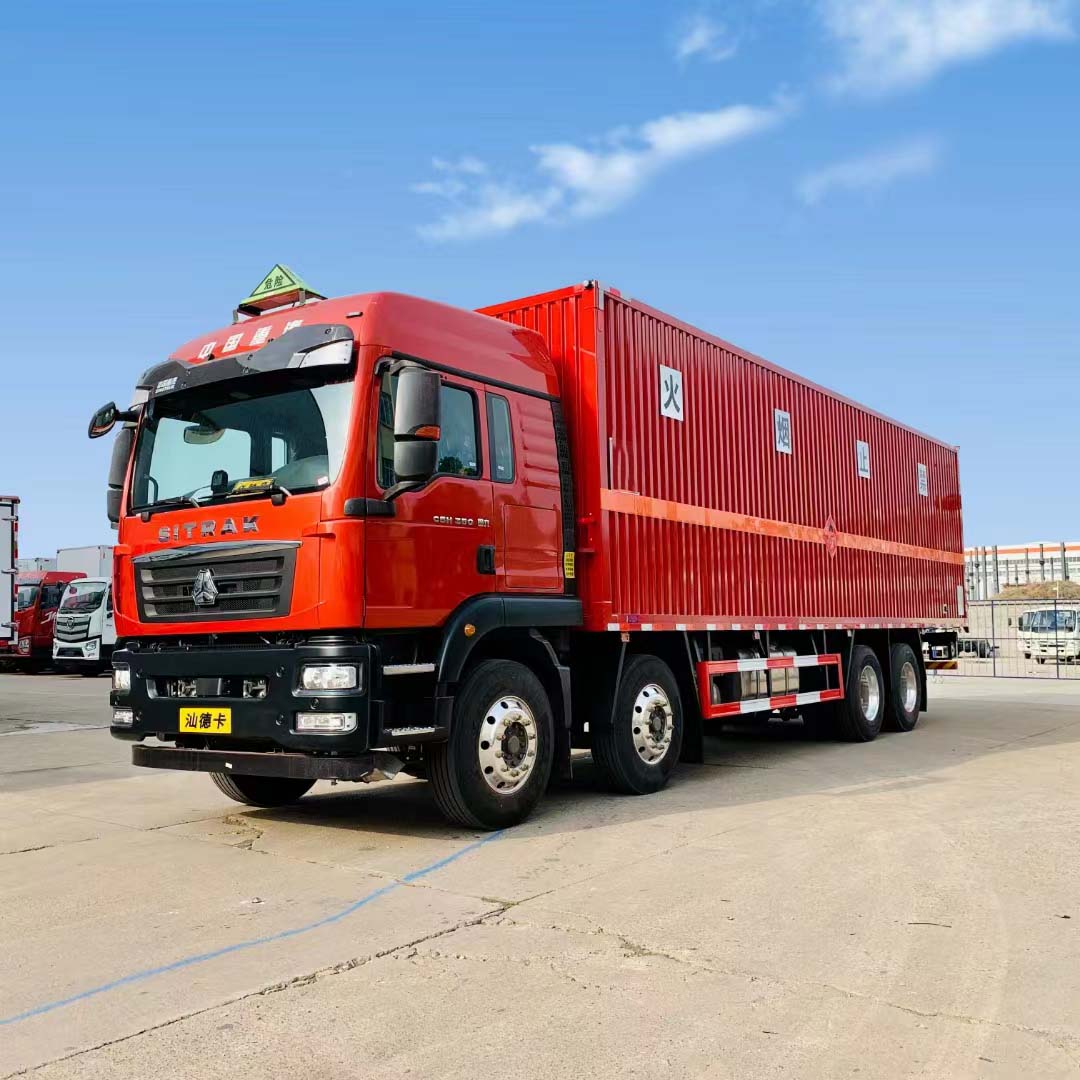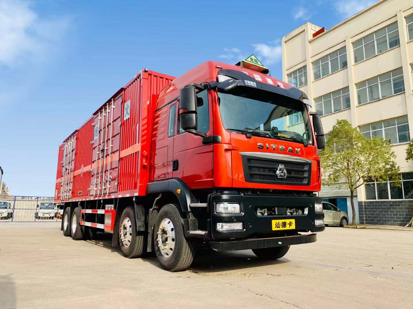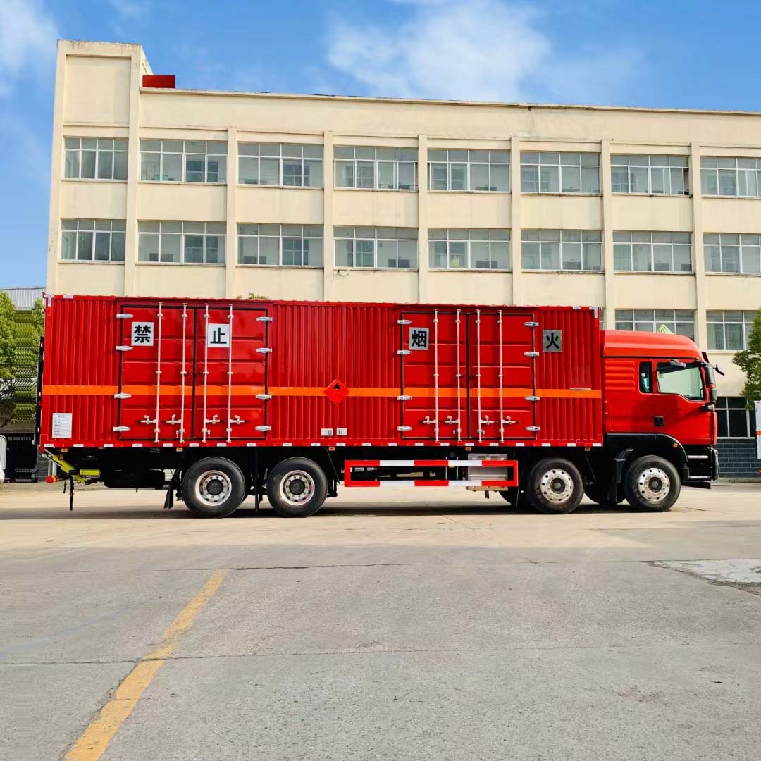 汕德卡國六前四后八危險品車采用瓦楞板專用箱體,右側帶兩個雙開側門,副梁(14號槽鋼), 橫梁(8號槽鋼),橫梁間隔280mm,邊框(10號槽鋼),廂體站板采用1.2毫米厚瓦楞板結構,廂體右側兩個對開門,車廂底板鋪5毫米厚花紋板,車廂底板鋪防靜電膠皮,隨車帶兩根接地防靜電膠帶和兩個2公斤滅火器,廂體內部安裝煙霧報警器及防盜報警感應器。